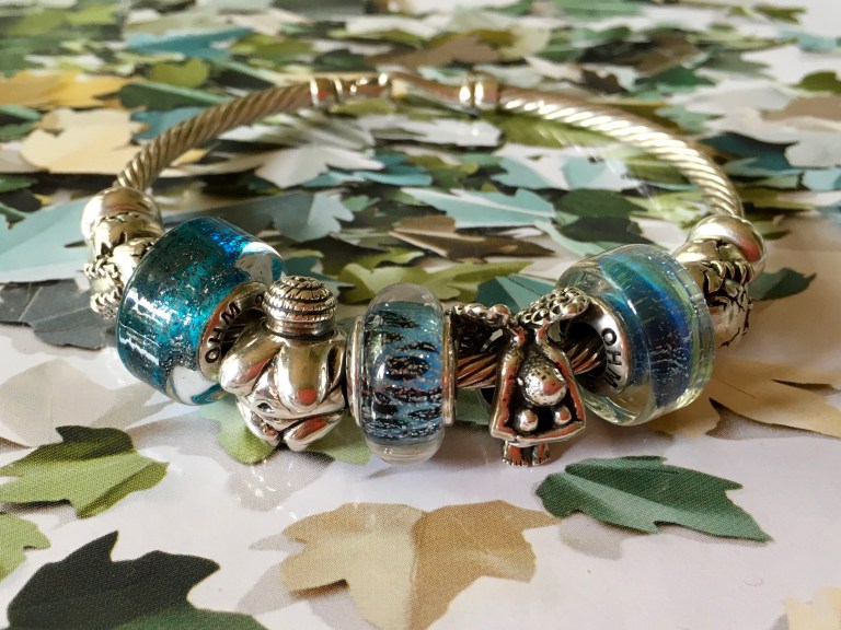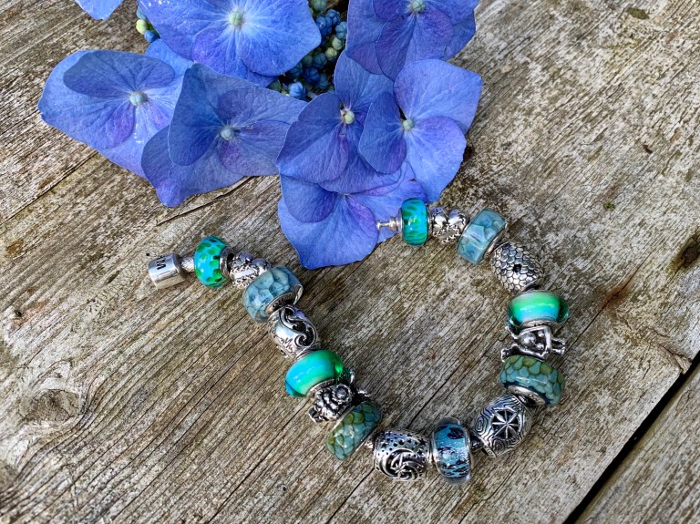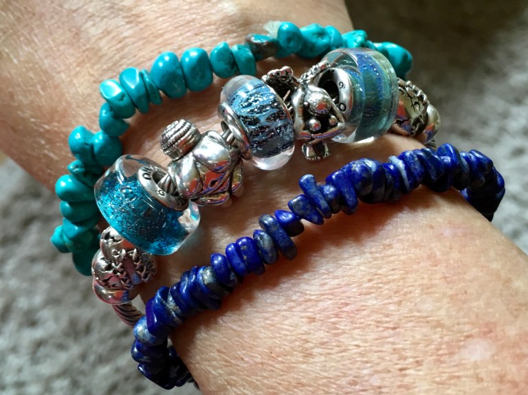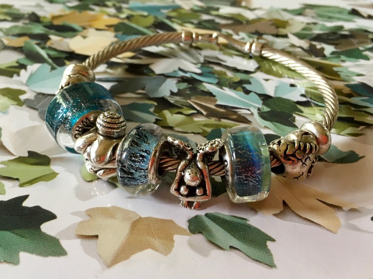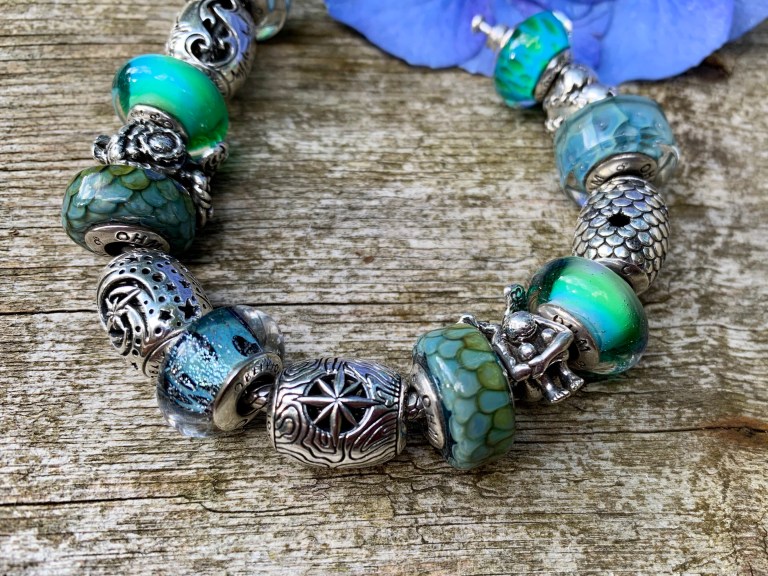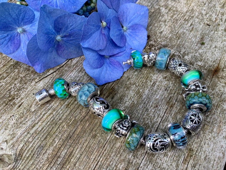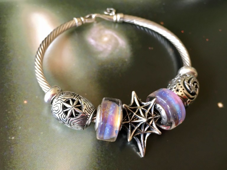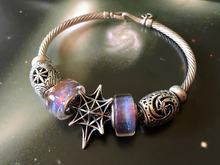 Standing beneath the expanse of a shining starry night looking up makes me feel so connected with the universe! I made a small bangle to highlight the beautiful barrel beads and join them together by OHM’s Stardust and two Dreamscape.