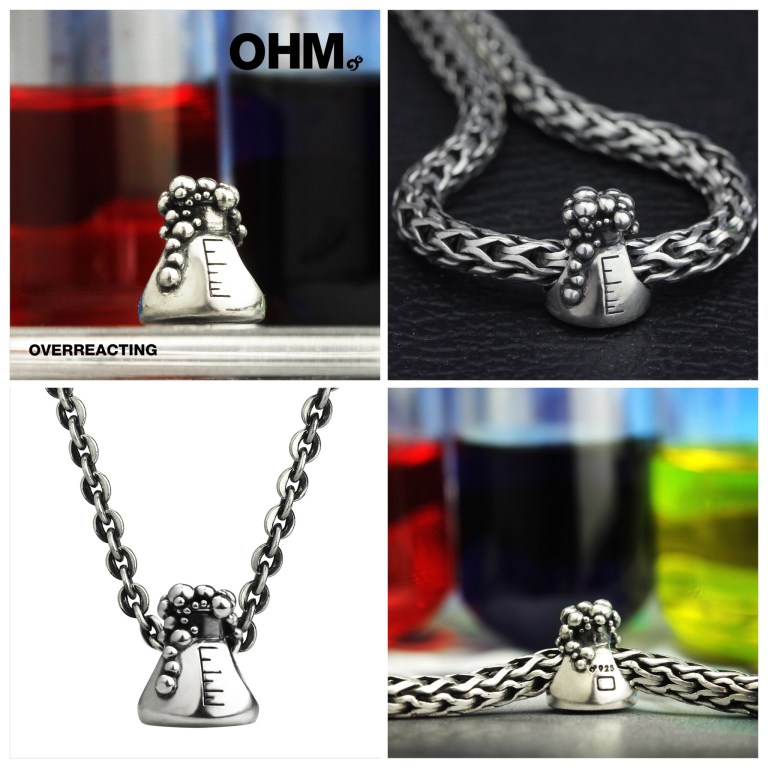 OHM created this bubbling, overflowing Erlenmeyer flask. As we know every day we have to deal with irritating things, exasperating people, annoying traffic or coworkers, toxic mixes of circumstances that make you want to explode or boil over with frustration. Let the bubbles settle inside you. And perhaps let the OVERREACTING on your bracelet do the boiling over for you.