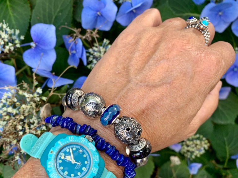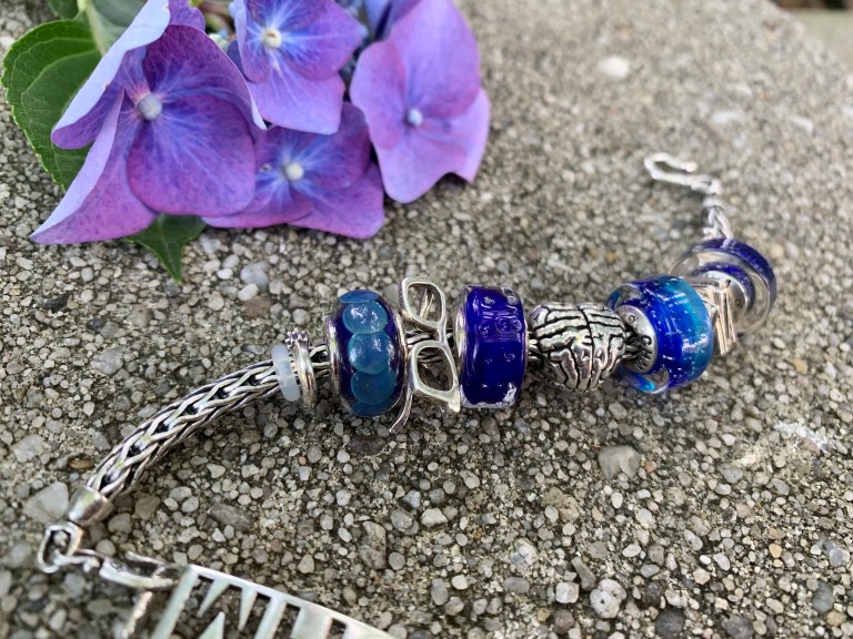 Sometimes it takes a lot of studying and reflecting to compose ideas into reality! This bracelet gives studying and searching for inspiration a boost! OHM Chunky bracelet with OHM WHO clasp, TAO Superimpose and the OHM beads Screw You, Magic Sight, Blueberry, Reason and Feeling, Blue Lagoon, Library, Hole and Get Hammered.