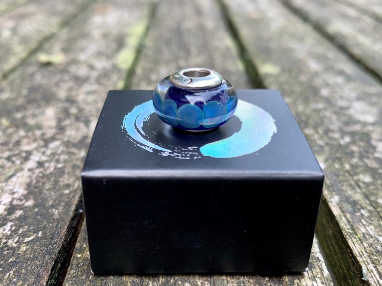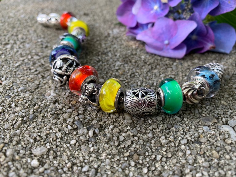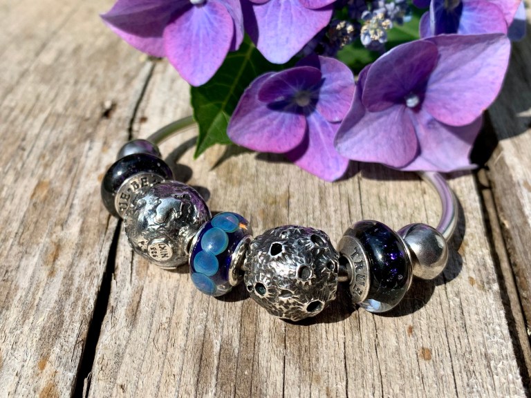 To the moon and back! This bangle is a universe on it’s own with all elements combined! Find inspiration wherever you go! A Trollbeads bangle with Superimposed, Trollbeads Big Earth, OHM Luna 2.0, two Truebeadz Amsterdam Midnight and two Pandora clips.