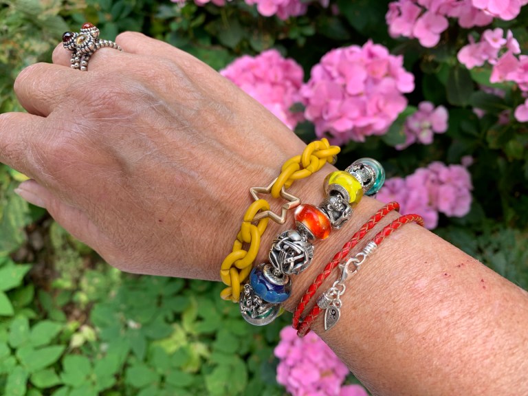 I used all the TAO beads In Flow, In Process, In Search, In Awe and Roar on this OHM bracelet combined with OHM glass Flames, Primrose, Luminous, Forsythia, Sunshine and the silver beads The Feast, Chocolate Bar and Cupcake. Stacked with a X-jewellery and an OHM leather bracelet and Pandora birthstone rings.