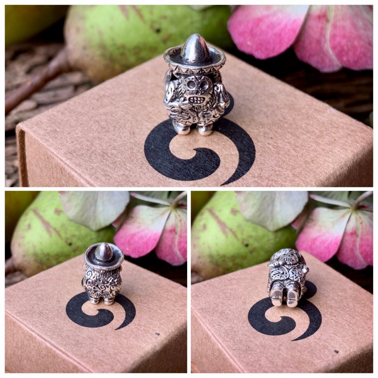 Let’s start with Plague Doctor, an OHM Lab production with Laboratory Assistant Elizabeth Palmer! This bead is so appropriate for these strange times, it almost seems OHM has a look into the future! Plague Doctor was a doctor trying to cure patients with the plague, his beaked mask filled with herbs and spices to prevent catching it himself. Plague Doctor holds a bag and staff and carries herbs and a flask.