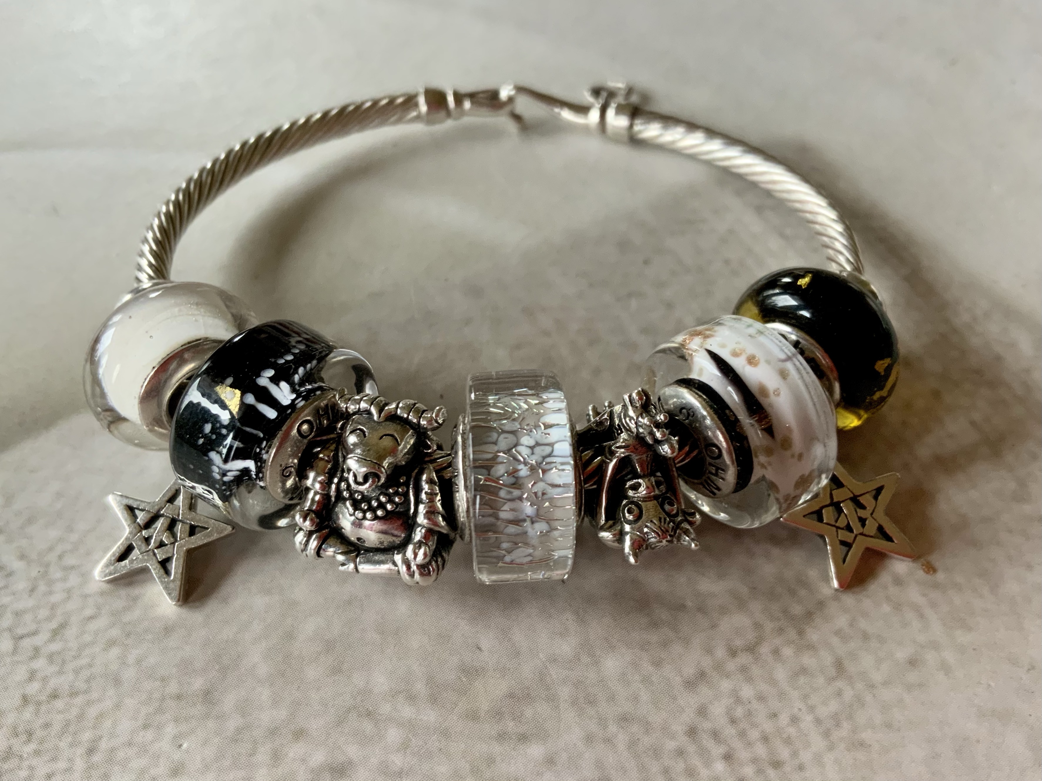 Year Of The Ox is throwing a bovine party and is celebrating New Year with Get Your Nog On! A bangle with Cold Milk, Woodstock Star, Skyguild, Year Of The Ox, Spark Of Life. get Your Nog On, Nouveau, Star and an very old glass bead.