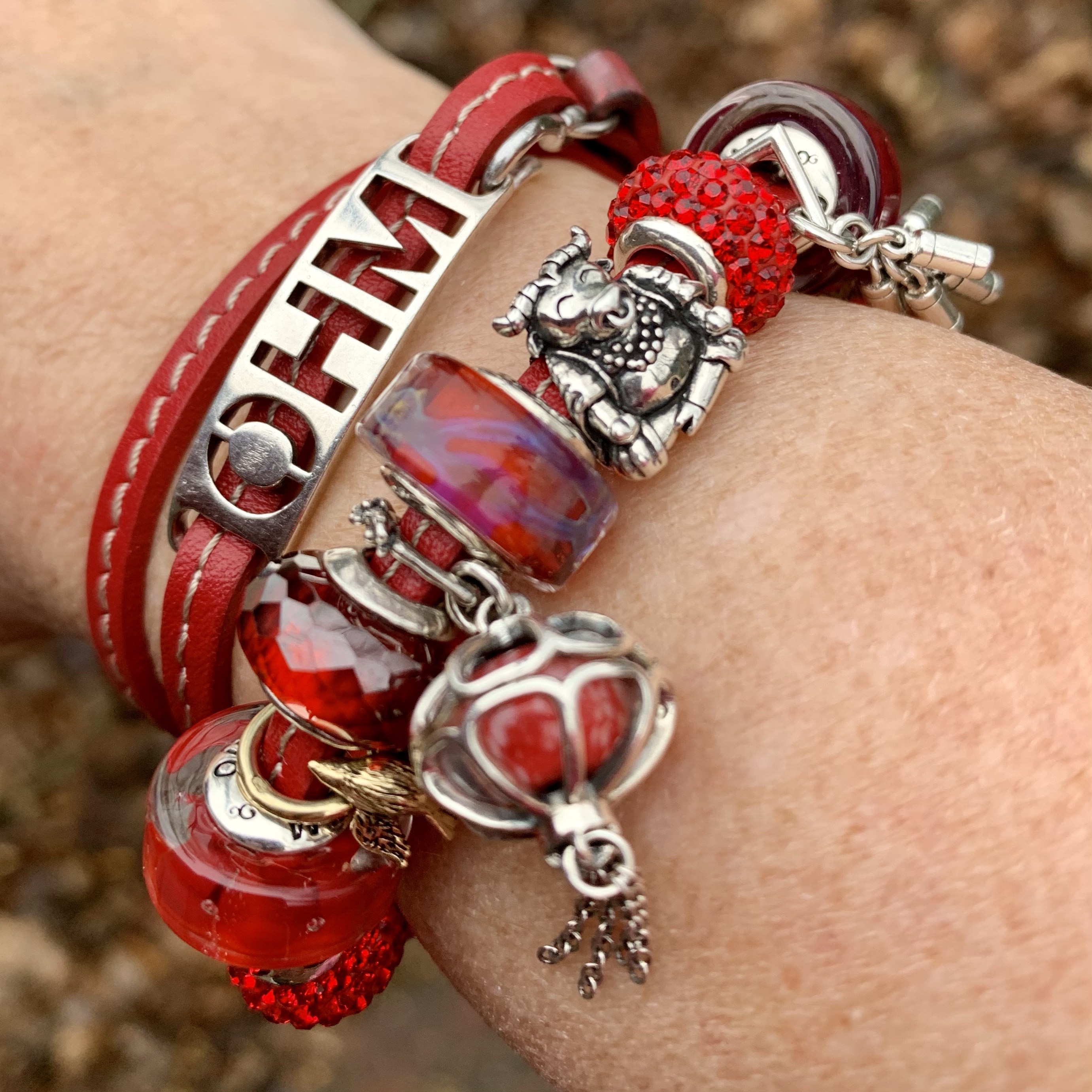 I used the Lucky Red Whip leather bracelet to put all the Chinese New Year beads together with a gold and a silver Birdie, two July Spinners, a facet glass bead called Passion Red and two red Disco Balls.