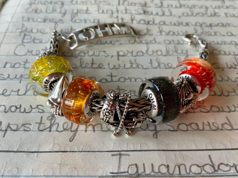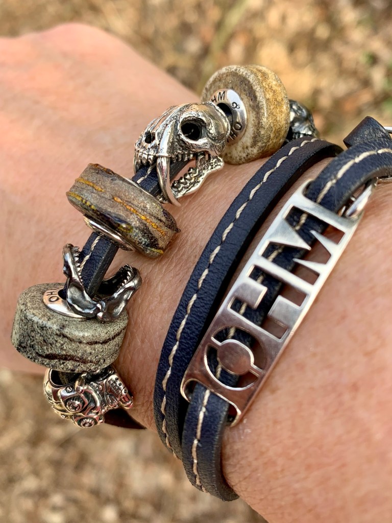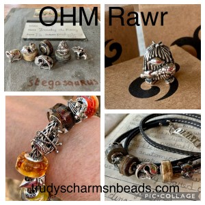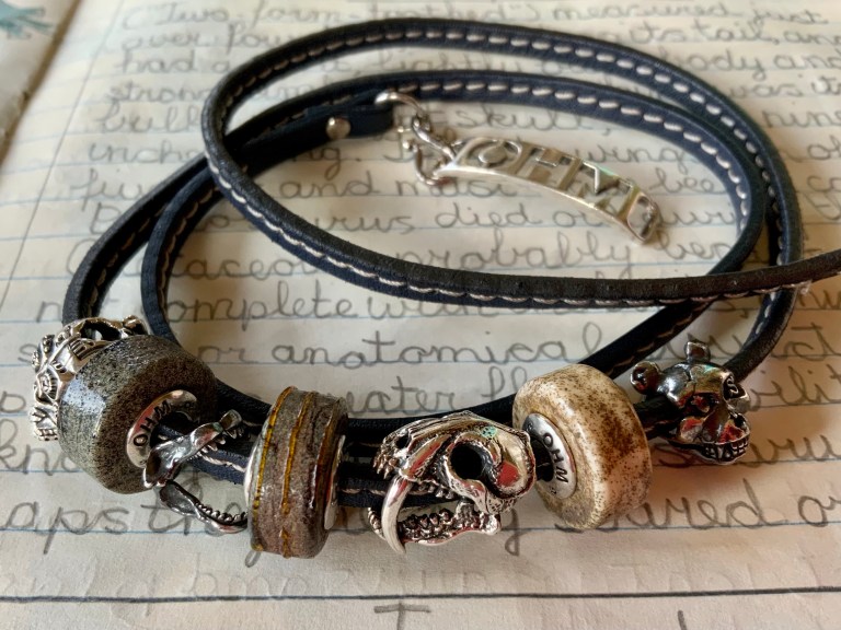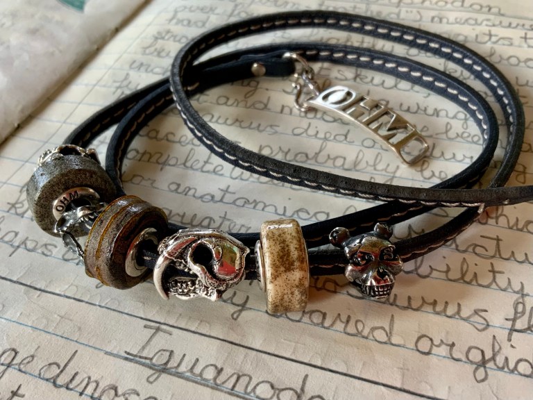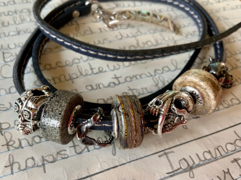 I made a Skull bracelet with the Rawr glass and Sabertooth Skull and Cyborg, Baby Megalodon and Teddy Scares Skull. On a Whip leather bracelet with OHM WHO clasp.
