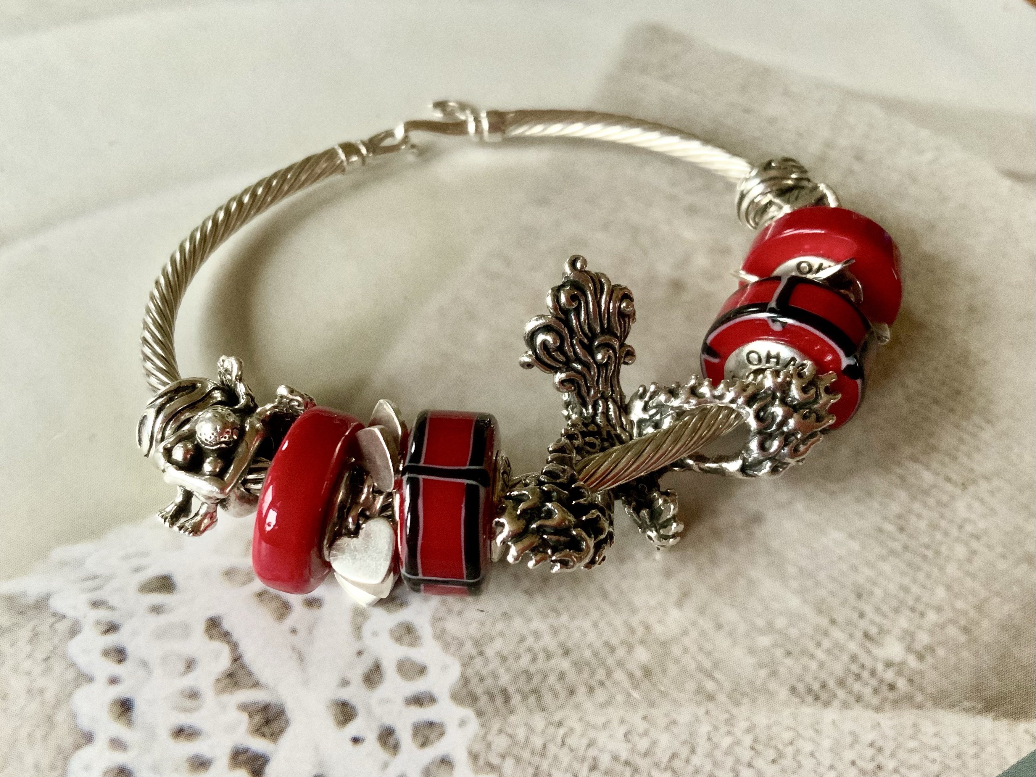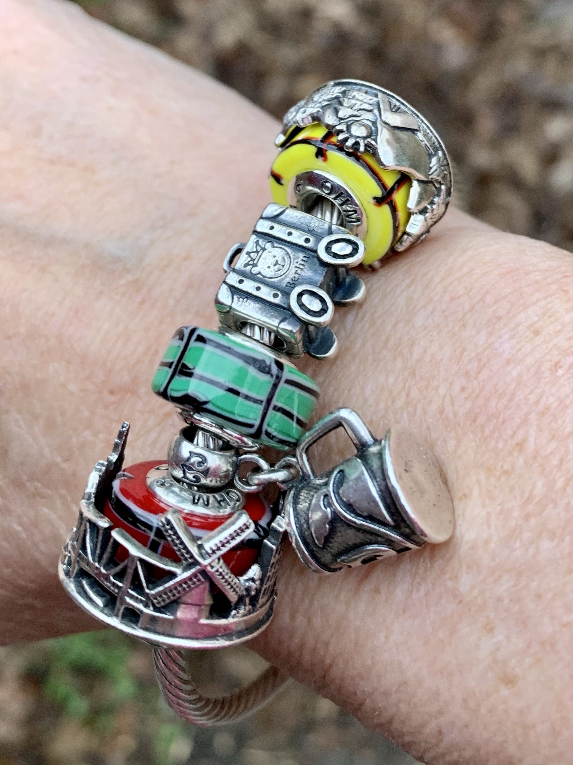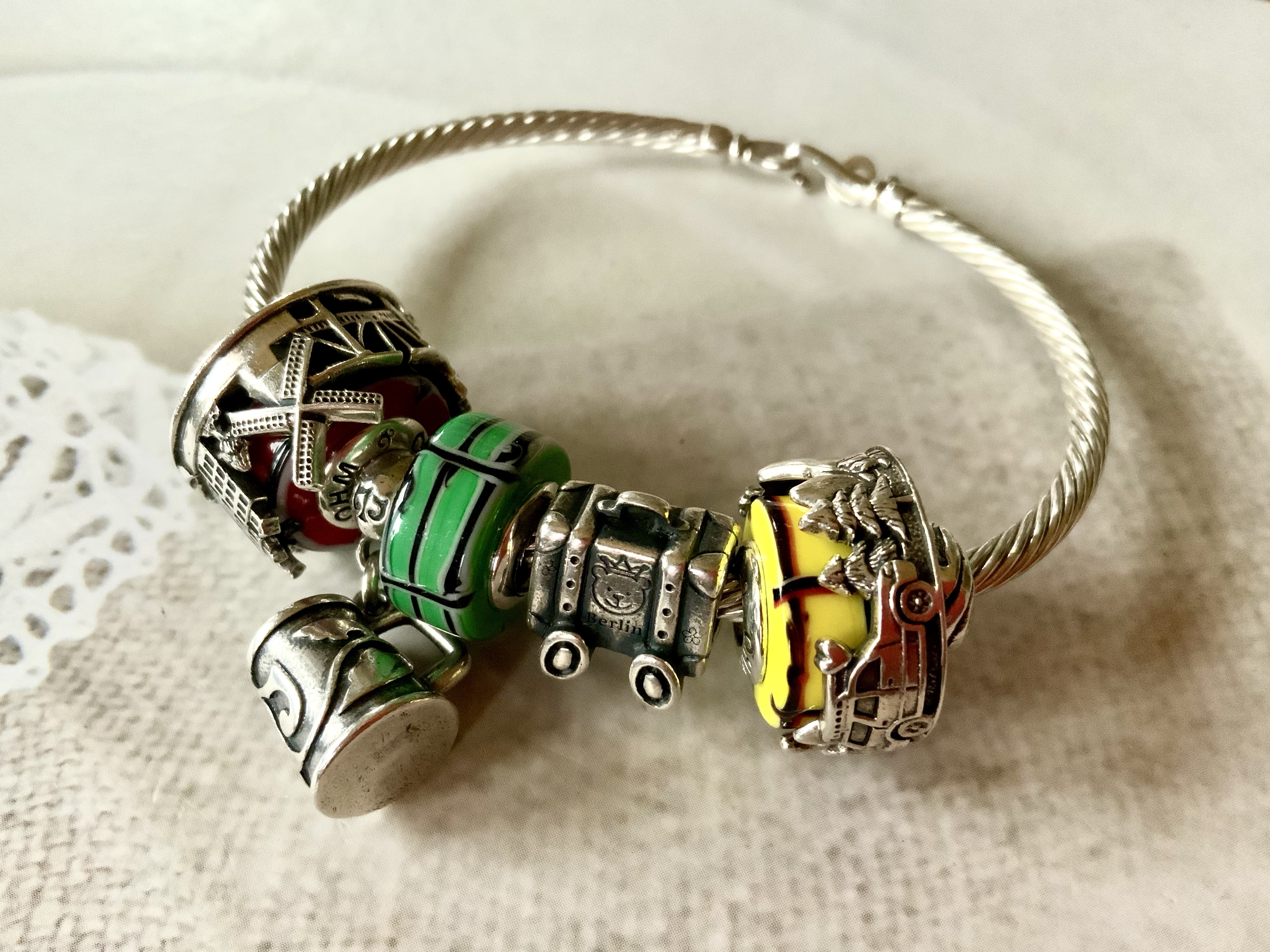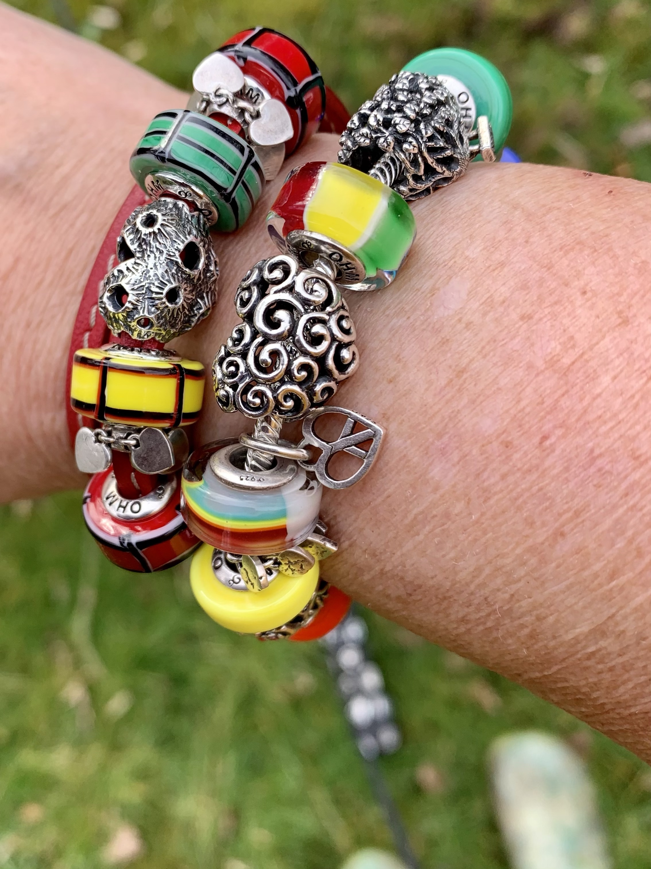 This bangle I made with all three glass beads shows our nationalities! We are from different countries, so this project is a worldwide collaboration! From left to right: Mcctrudy is Dutch with the Panorama bead XXX, Mccjordi is German with Truebeadz True Pint and Spiritbeads I Love Berlin and Mcctrish is Canadian with the Panorama bead Explore, it’s design based on the stunning Canadian forests and landscapes!