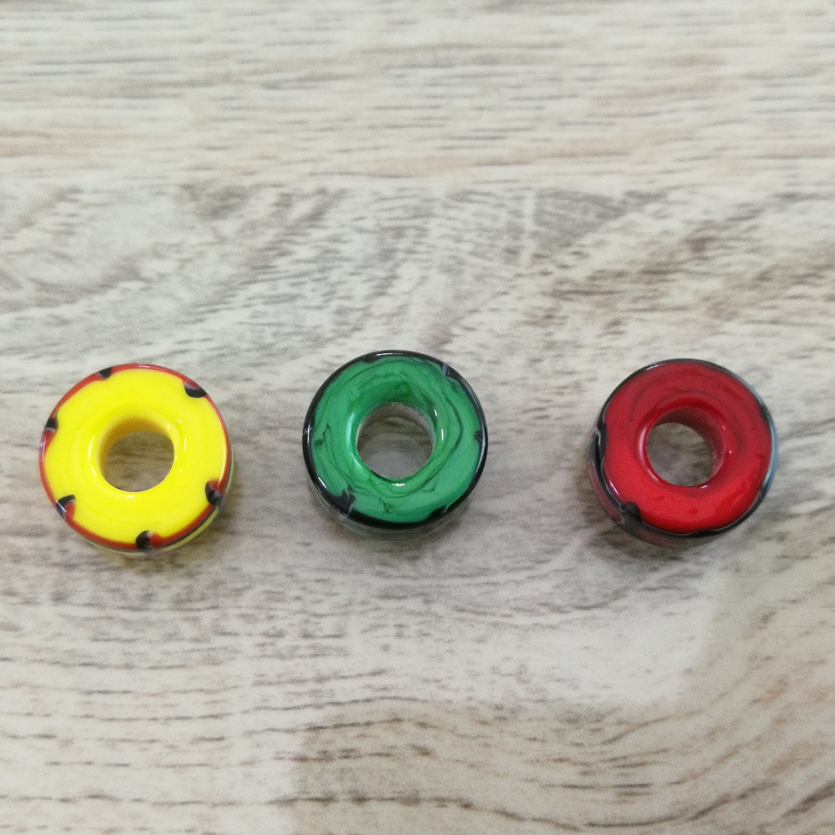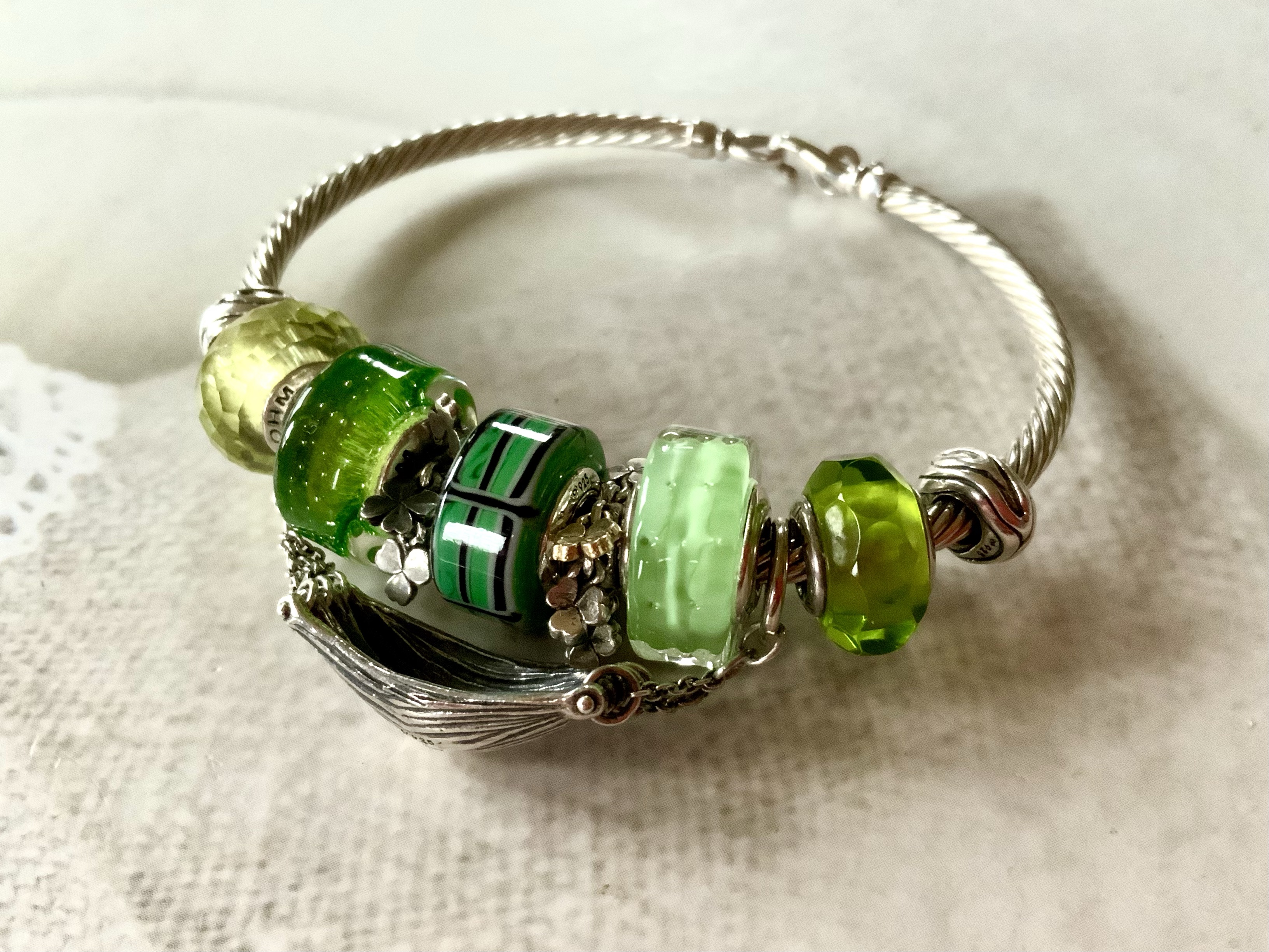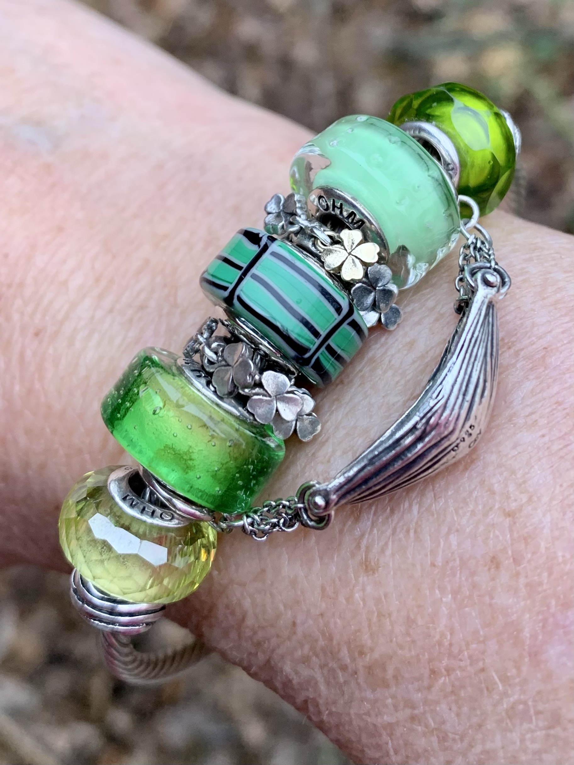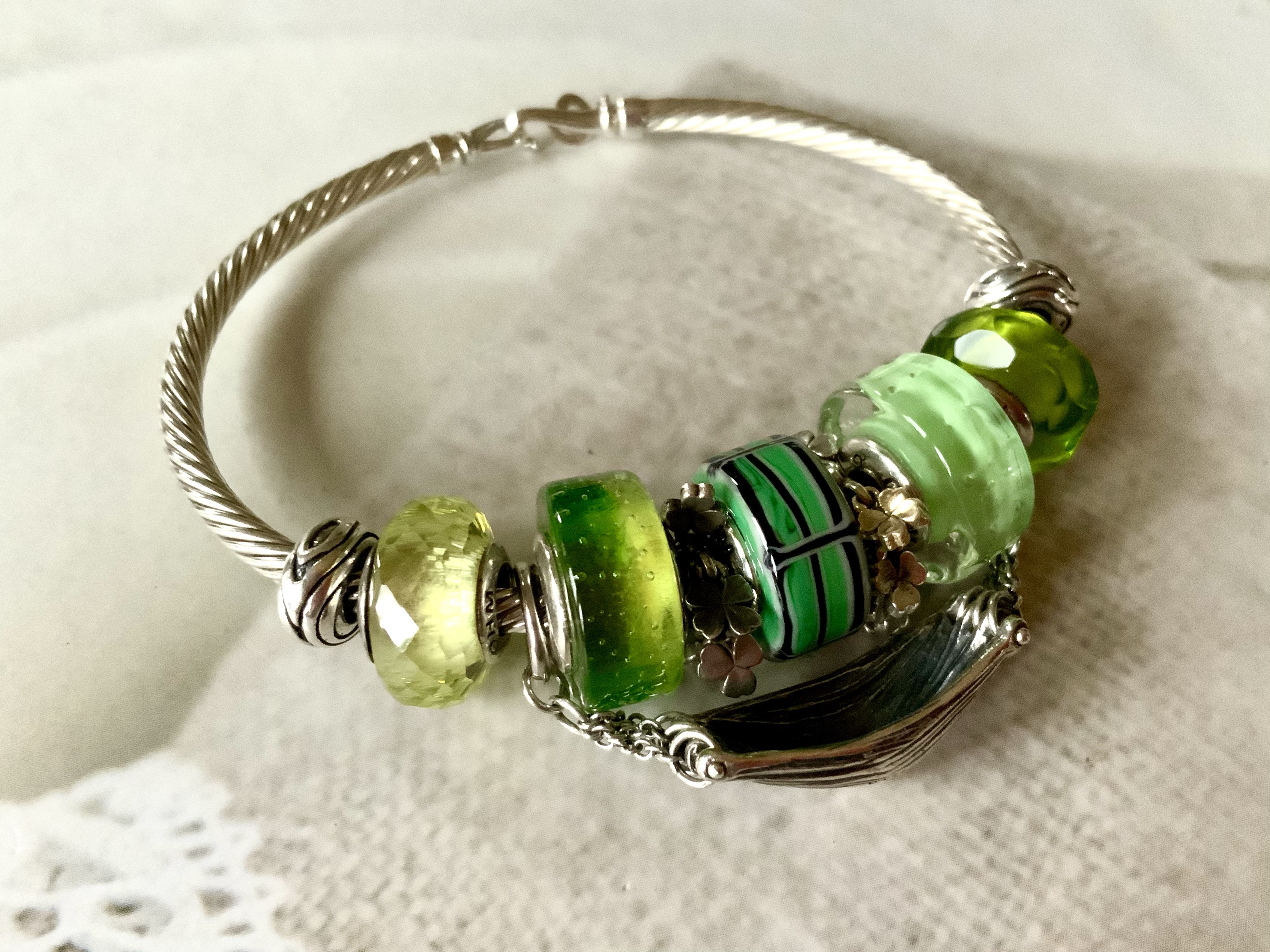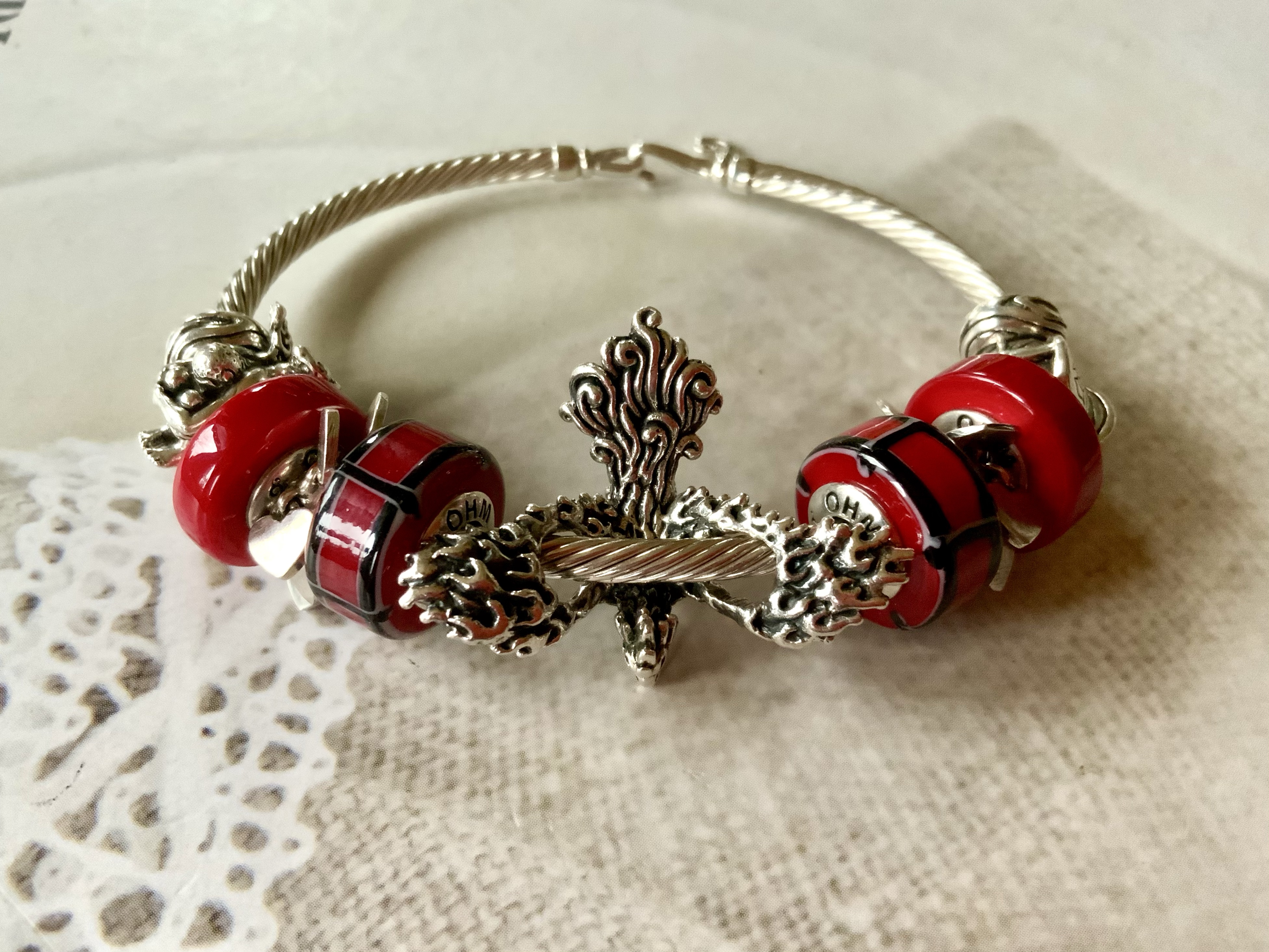 This bangle I made with all three glass beads shows our nationalities! We are from different countries, so this project is a worldwide collaboration! From left to right: Mcctrudy is Dutch with the Panorama bead XXX, Mccjordi is German with Truebeadz True Pint and Spiritbeads I Love Berlin and Mcctrish is Canadian with the Panorama bead Explore, it’s design based on the stunning Canadian forests and landscapes!