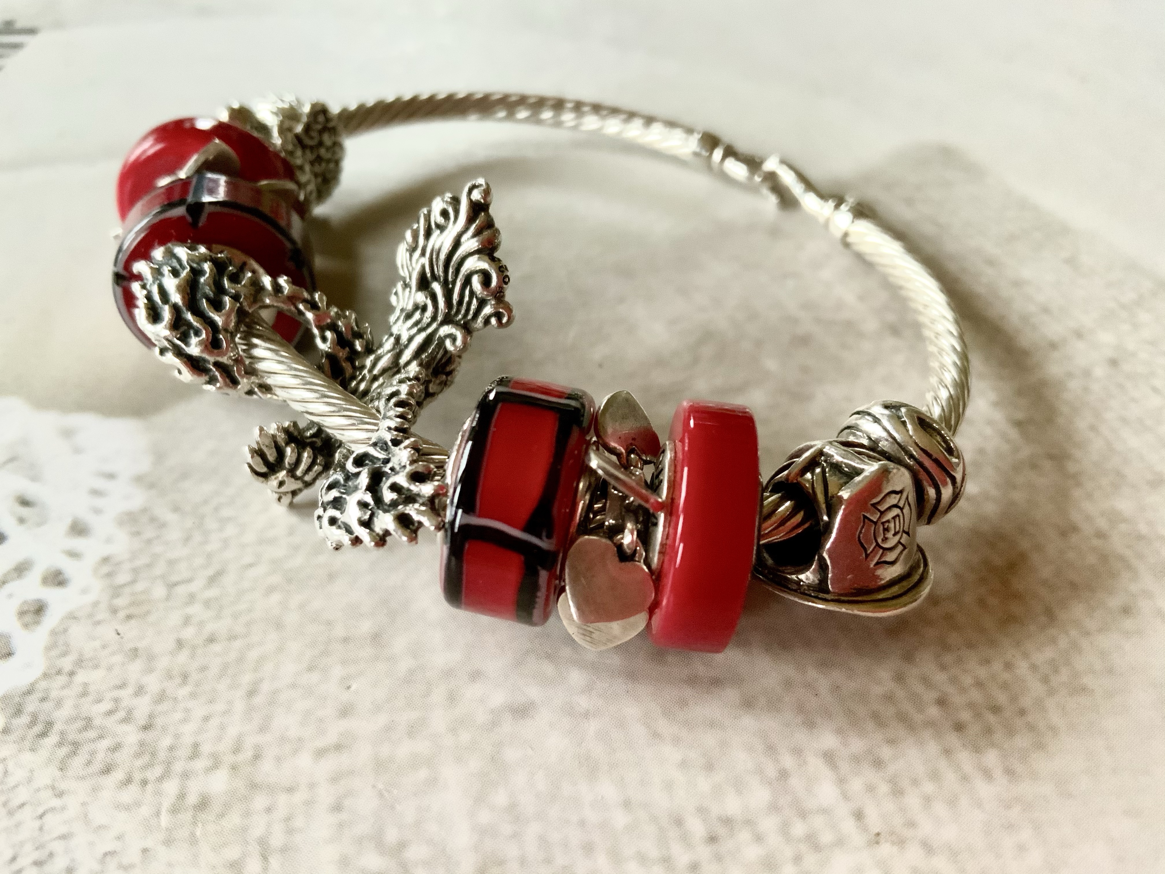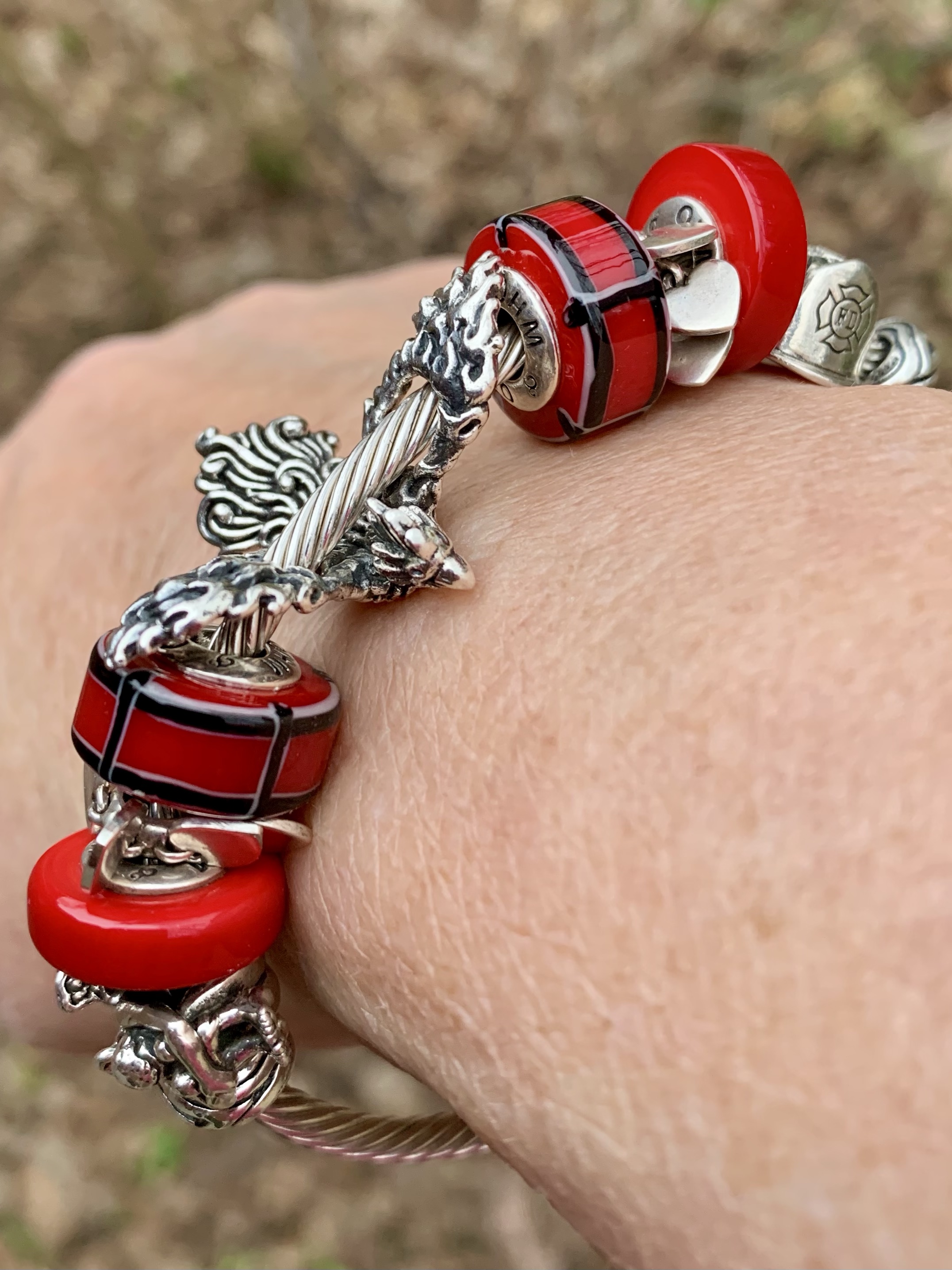 Forget Not made me do a bangle that is so close to my heart. For my brother who died five years ago I made a firefighter inspired bangle to remember and honour him. Red is the colour of fire and love; my maiden name is also a derivative of the dutch word for red. With OhmMyGod, Sour, Lovely Hearts, Mcctrudy, Rebirth, Mcctrudy, Lovely Hearts, Sour and Firefighter Hat.