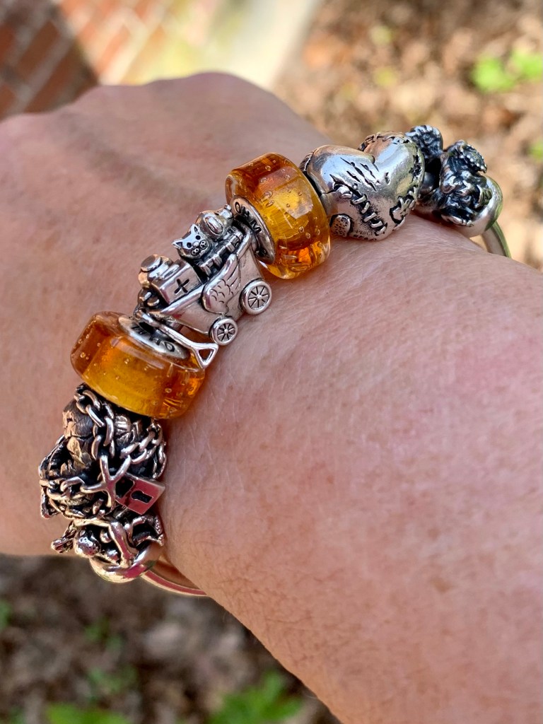 This bangle has fast become one of my most treasured bracelets! The glass on here are Slim Lime, Big Stick, Delecate Flower, Speak Sofly, Natural Sight and Slim Dustberry. All except Natural Sight are from this April release. The dangle is Seattle Humane Society Animal Rescue Paw Print. The stoppers are Hive-ish from the new April collection and Tesla Coil-ish, on a C bangle.