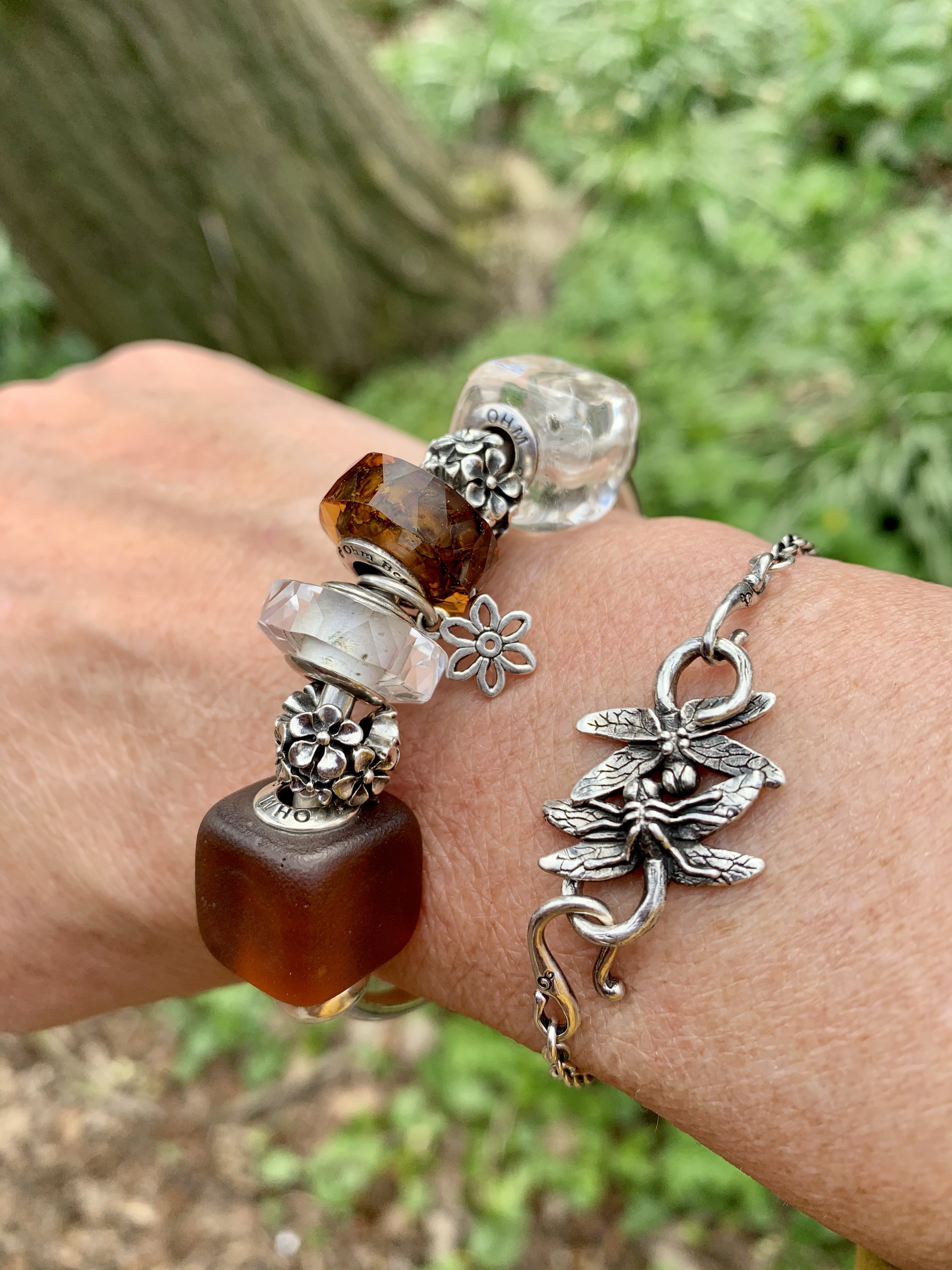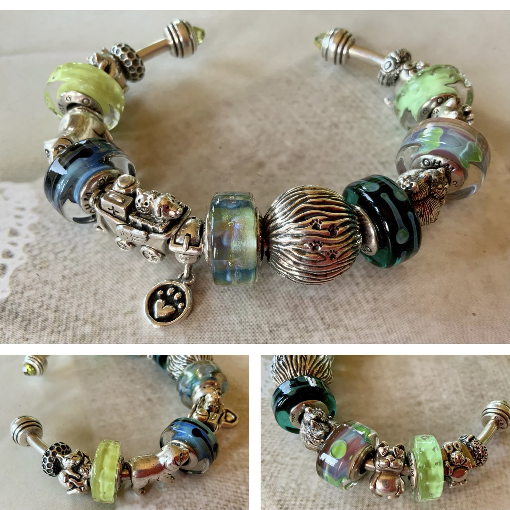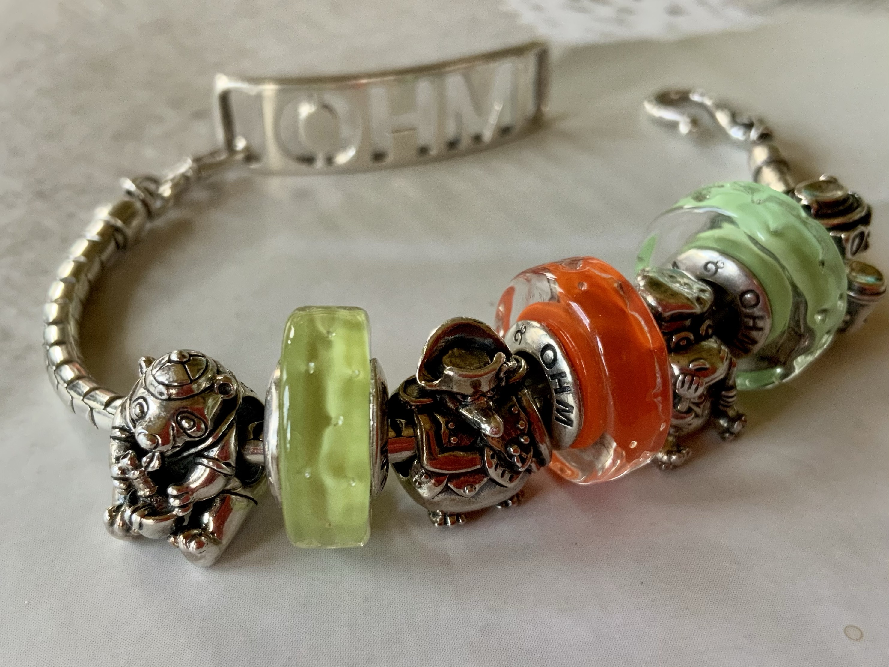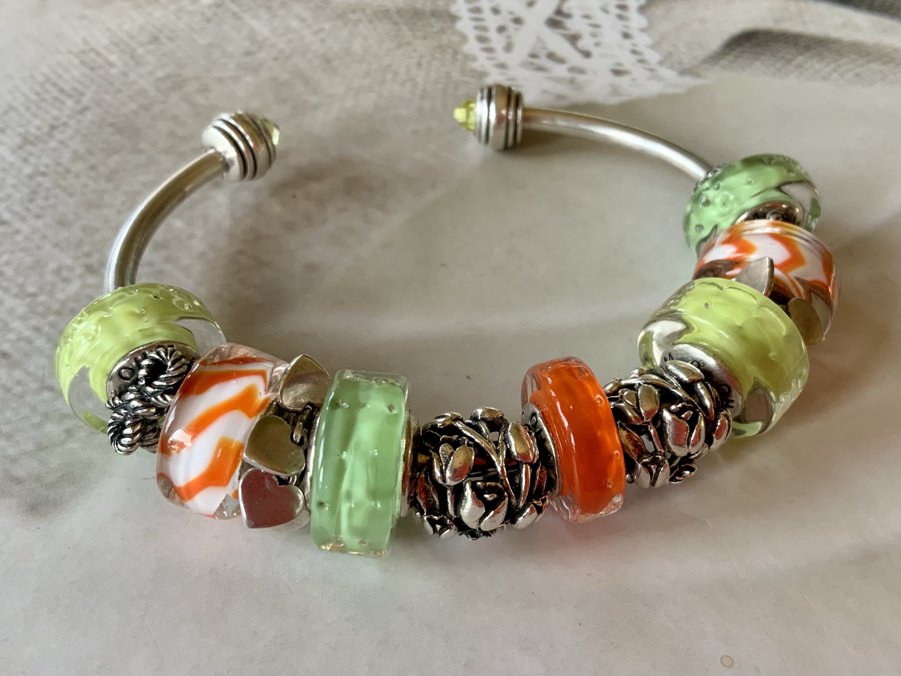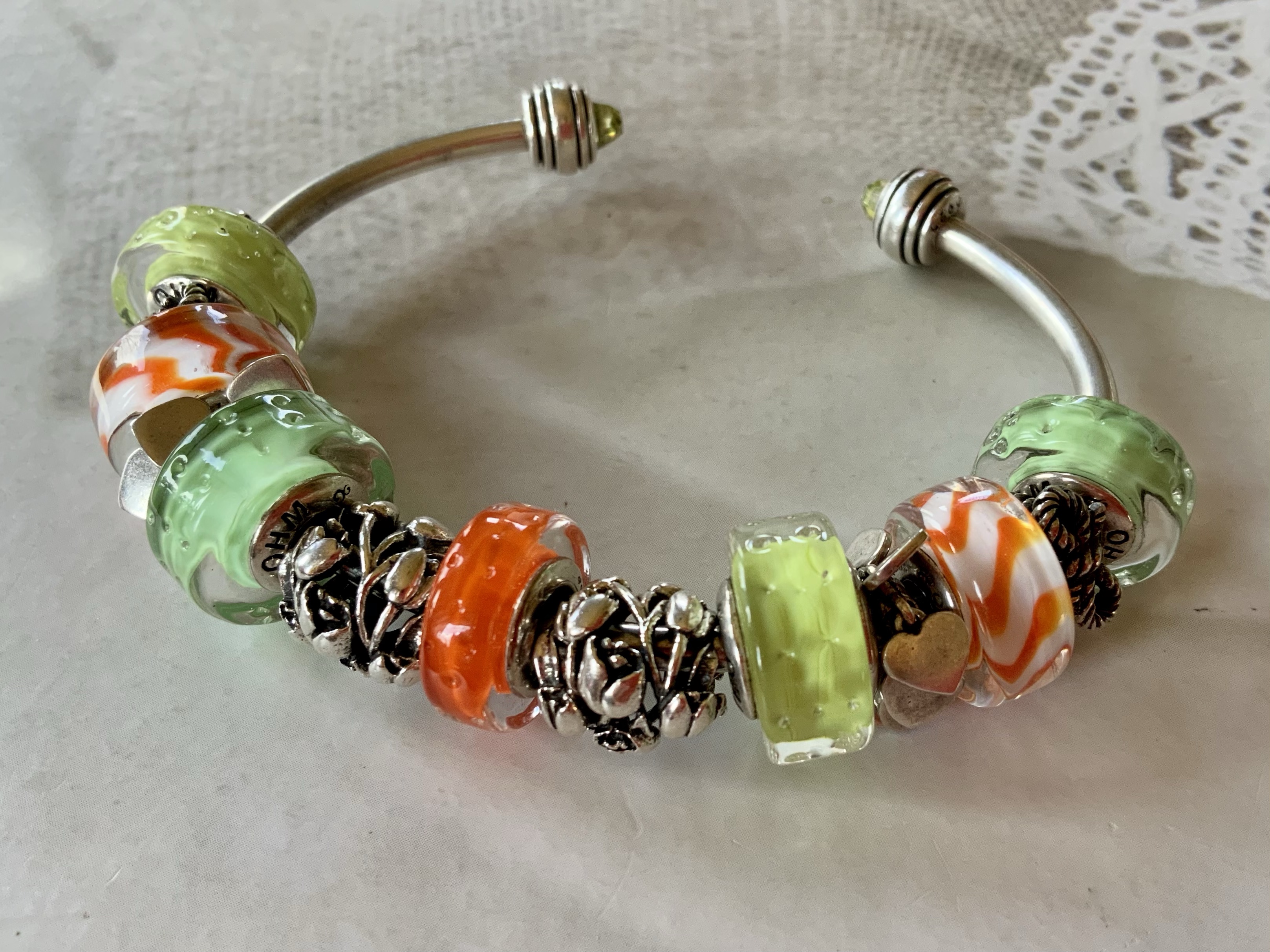 Another bangle design, the colours of the new Slim glass are so fresh and perfect for Spring! I made a tulip bracelet with the original Dustberry and Lime, two OHMniques, two Tulips, two Feeling Knotty and two Lovely Hearts.