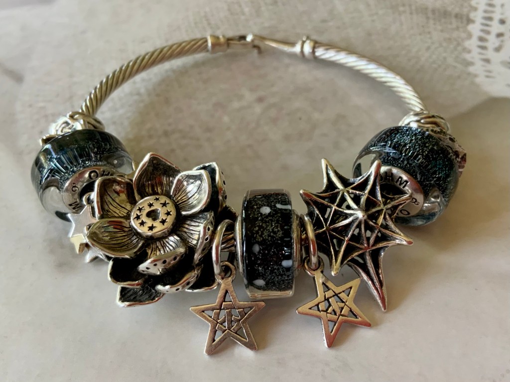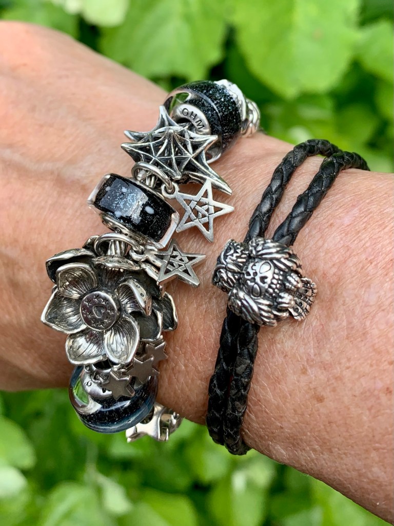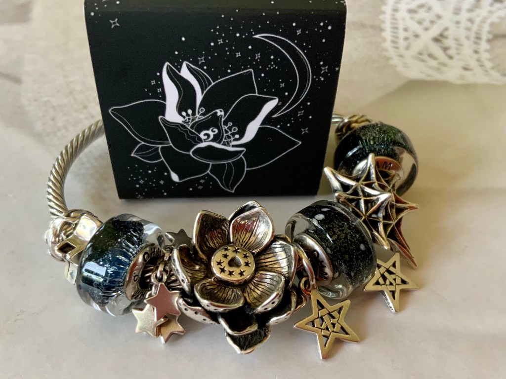 Inspired by the beautiful artwork on the box I made this midnight bangle with Star-ity, Nightsky, Lucky Stars, Stay Grounded, Woodstock Star, A Sirius Wish, Woodstock Star, Stardust, Deep Blue and Crescent Luna. Stacked with a black leather bracelet with the owl called Who Dead.