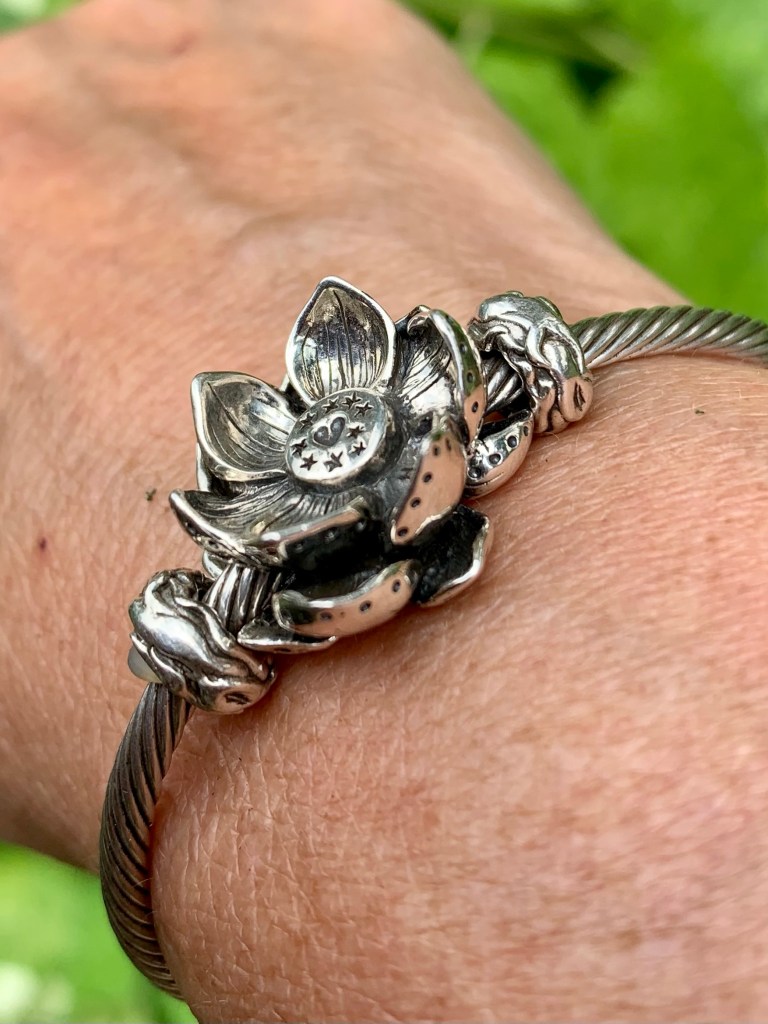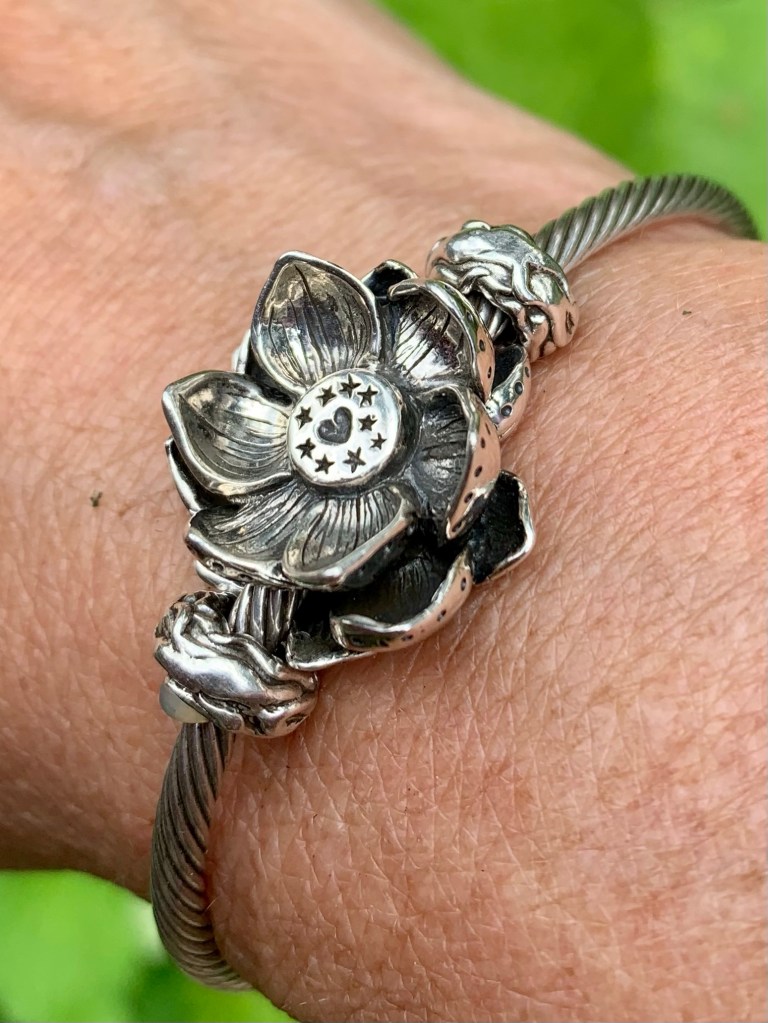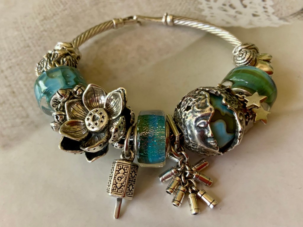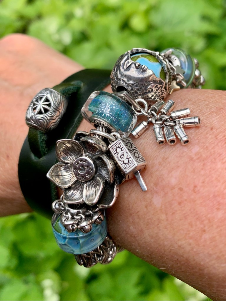 Stay Grounded is a gorgeous match with Inner Self, both in design and meaning! This bangle is all about staying true to myself! Every new day is a new beginning, a clean slate to start over! Bangle with Don’t Give Up, Venetus, Jingle Balls, Stay Grounded, Chi Chi Sticks, Flourish, Exploding Bamboo, Inner Self, Lucky Stars, Surrender and Venus of Willendorf. I stacked it with a leather bracelet with bead In Awe by The Art Oblivion.