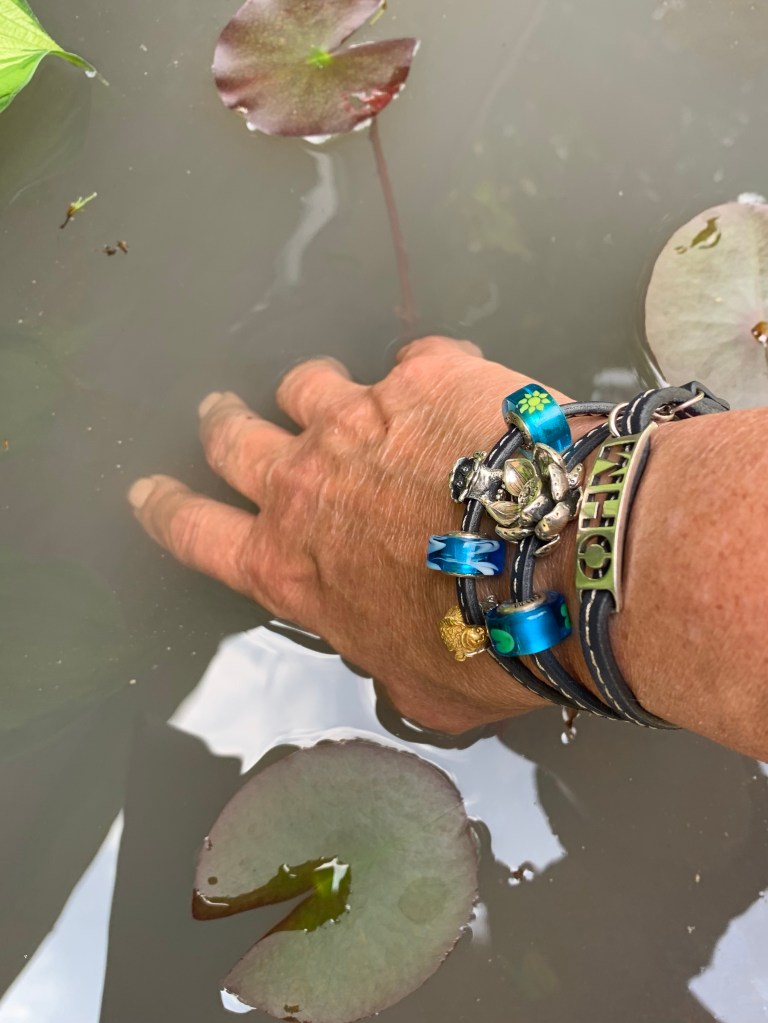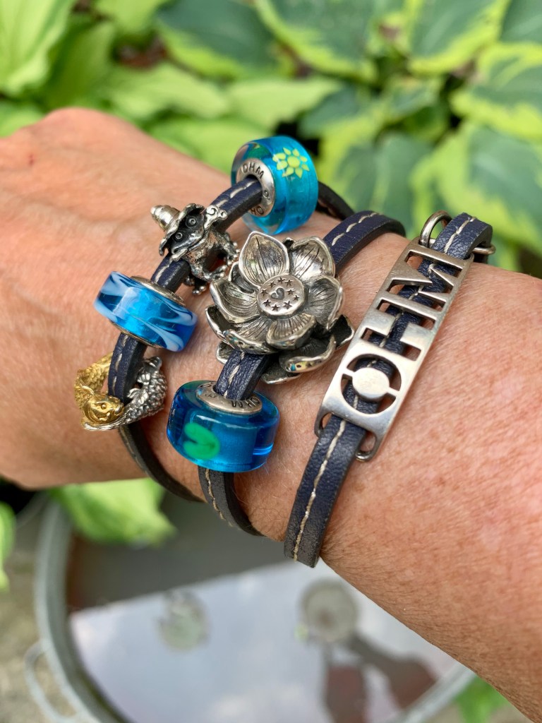 I love to wear a Whip leather bracelet, lovely in summer! I made a little pond with Nian Nian You Yu, Wateration, Magic Frog, See Forever, Lily Pad, Stay Grounded and OHM WHO clasp.