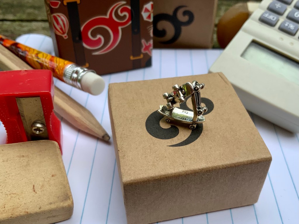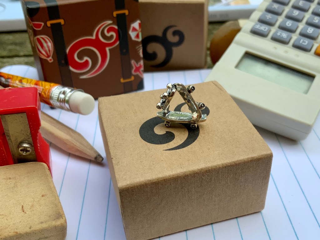 The third and last bead is Boarding! Three skateboards joined together. They are all different, a dove-tailed Surfskate or Carve skateboard with a peace sign on the underside its deck, a Longboard with woodgrain for bombing a hill or laid-back long-distance rides, and the versatile classic Double-Kick Popsicle Skateboard with our OHM logo for tricks, grinding, shredding curves, and getting airborne.