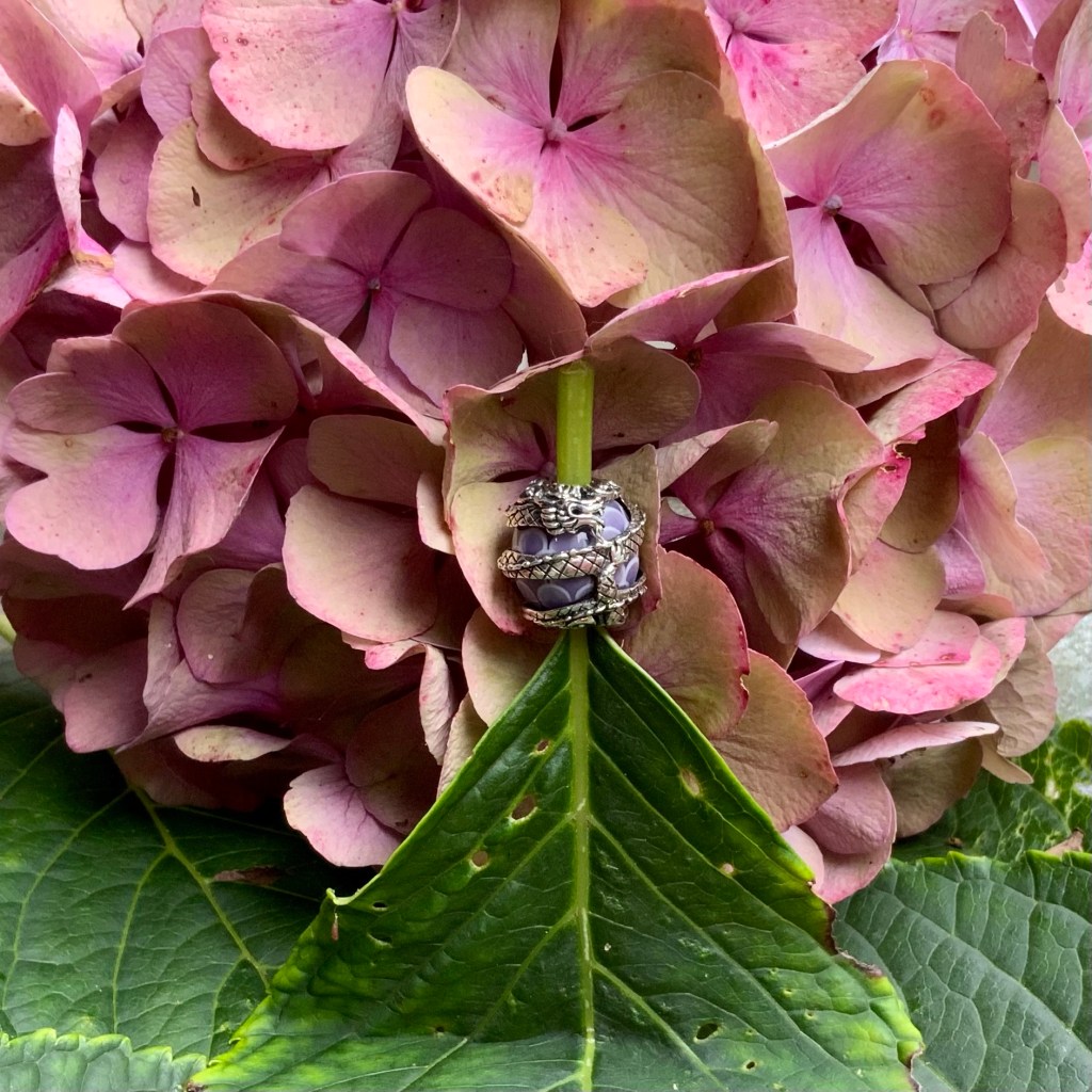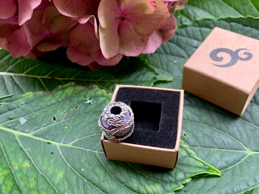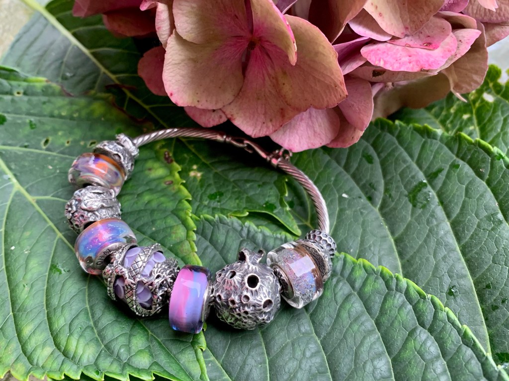 I first made a bangle with the same colours as the glass in Mother Lord. Can’t go wrong with that! And added moons.”I love you to the moon and back!” With Quarter Luna, Purple Haze, Natural Moon (OHM Studio), Dreamscape, Mother Lord, Candy Cloud, Apple Moon (OHM Studio), Fairy Wren and Crescent Luna.