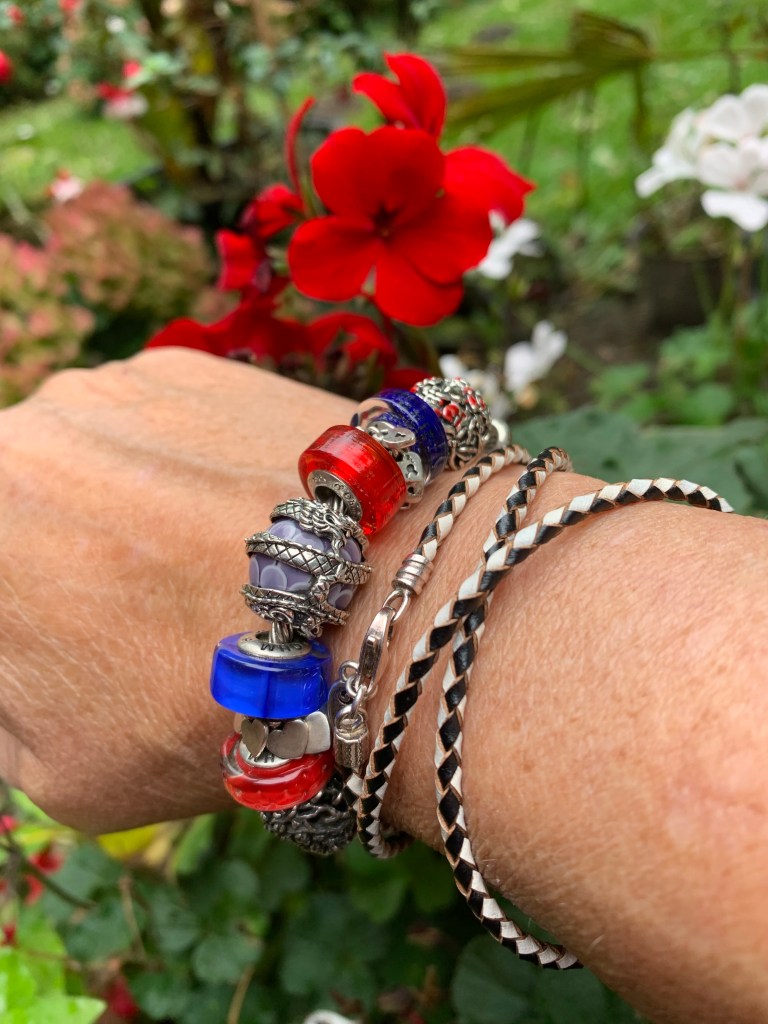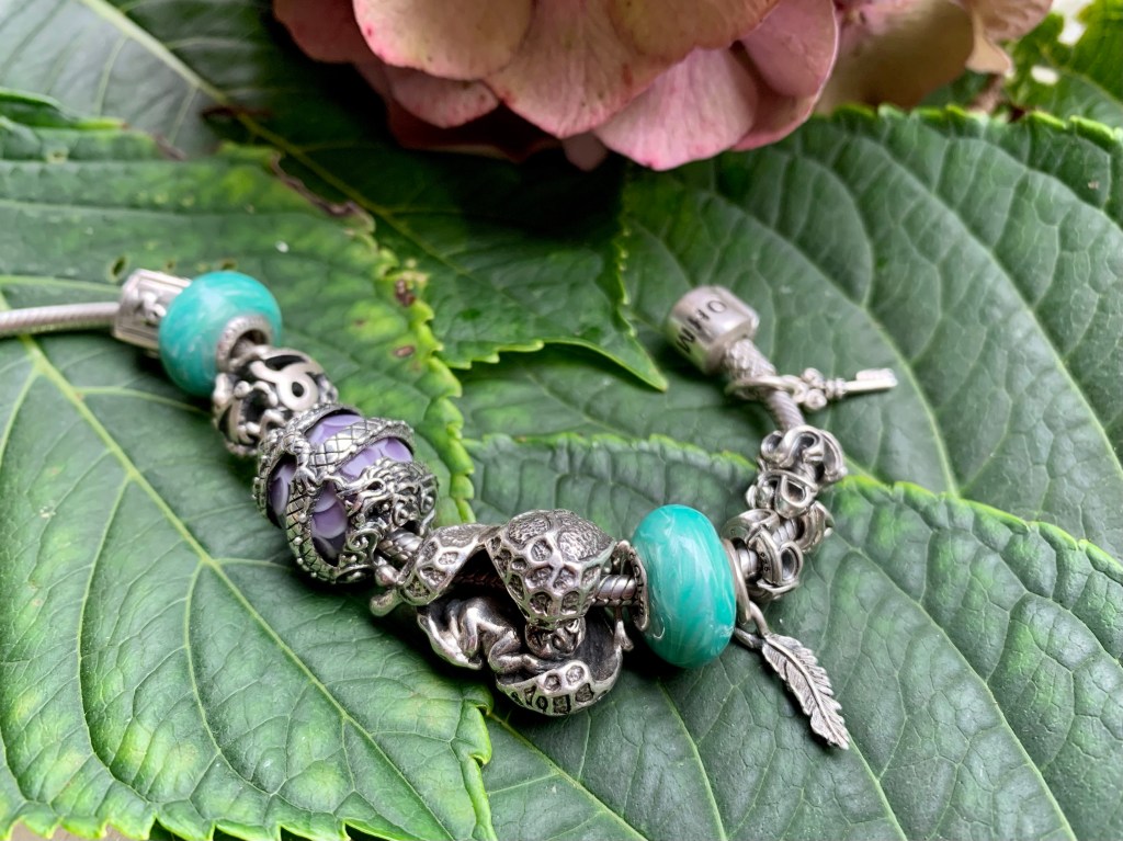 And last I added Mother Lord to my son’s bracelet. The colour I put with the purple/lilac Mother Lord is green, complementing colours opposite each other on the colour wheel. A bracelet with retired zodiac, Aqua Lux, Zodiac, Mother Lord, Wings Of Protection, Aqua Lux, Quill, retired letters and Open Your Heart Key.