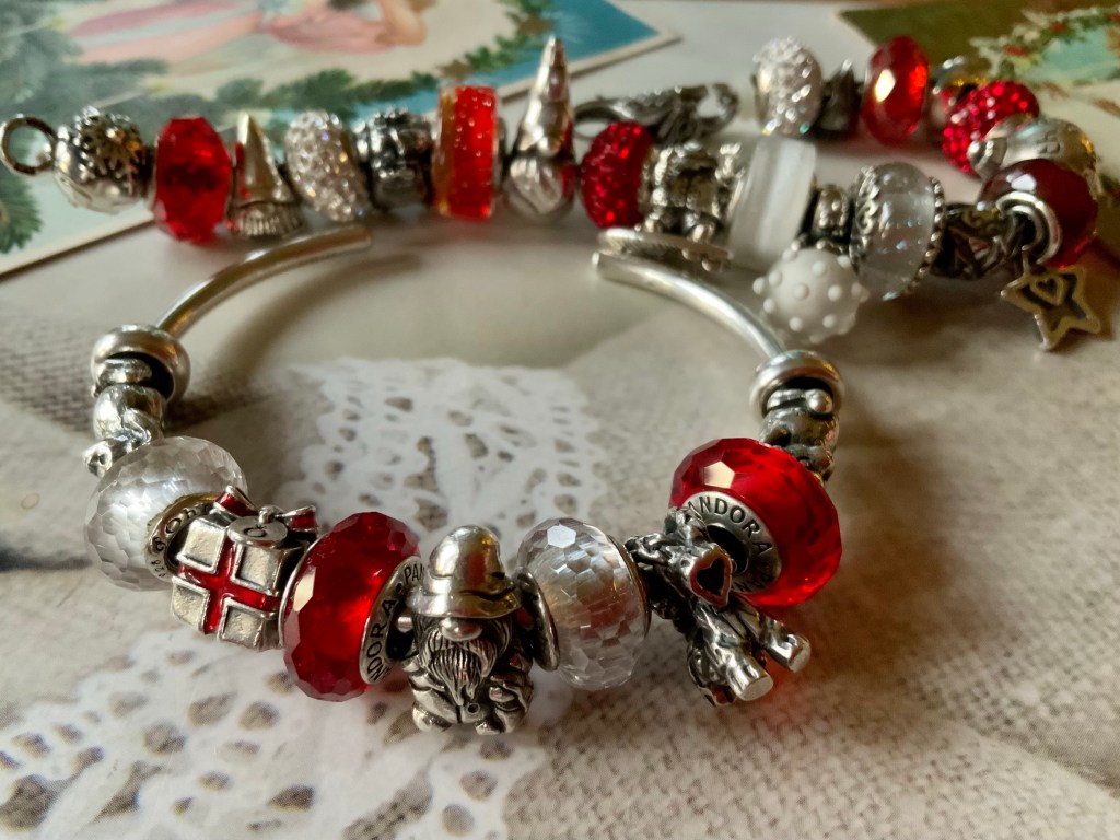 I made a bangle with Julebock the Yule goat, a Christmas present and teddy bears in red and white. With beads from OHM, Pandora and Trollbeads. Bracelet with OHM, Pandora, Trollbeads and RedBaliFrog.
