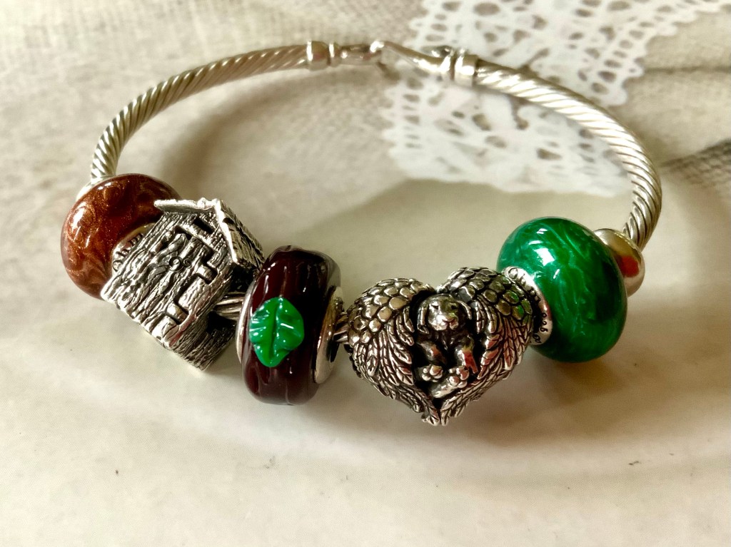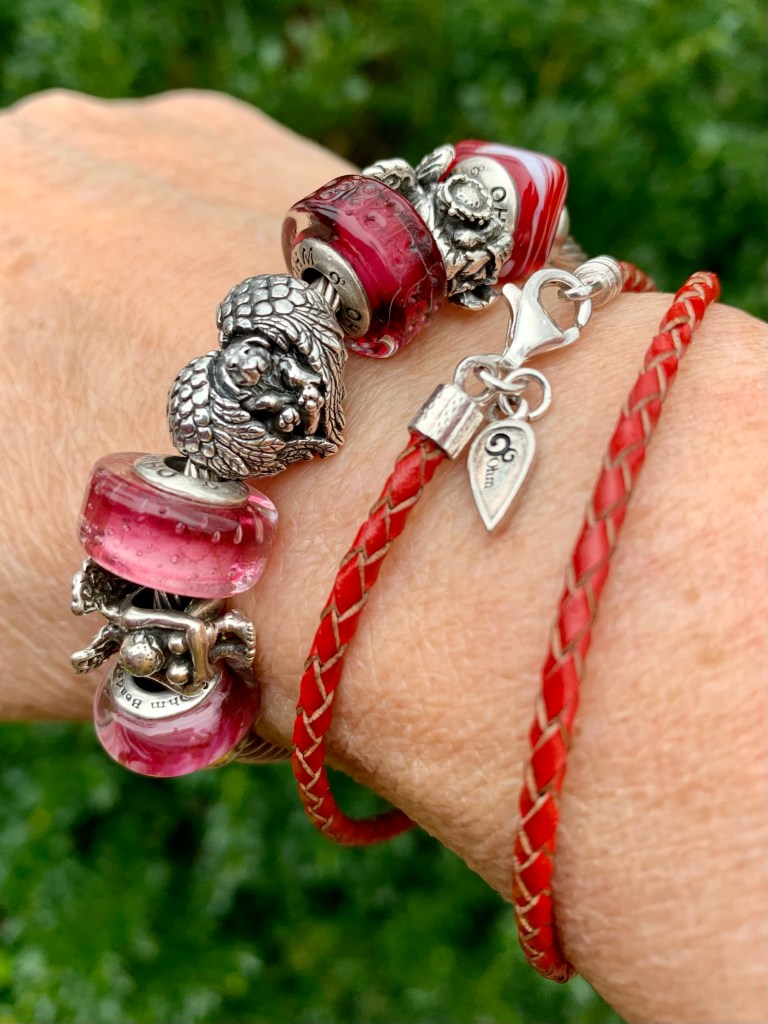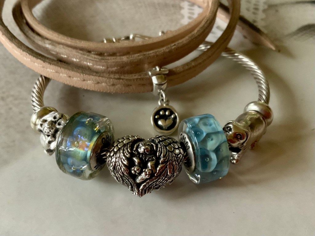 This bangle is a tribute to the other dogs that accompanied me through my life’s journey. Robin, a German Shepherd/Golden Retriever mix and Zora, a yellow Labrador. The beads are Dog & Bone, Delicate Flower, Puppy Love, Venetus and Labrador Retriever. Stacked with the Whip leather bracelet with Seattle Humane Society Animal Rescue dangle.