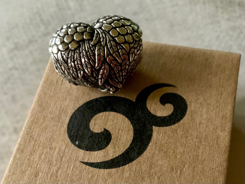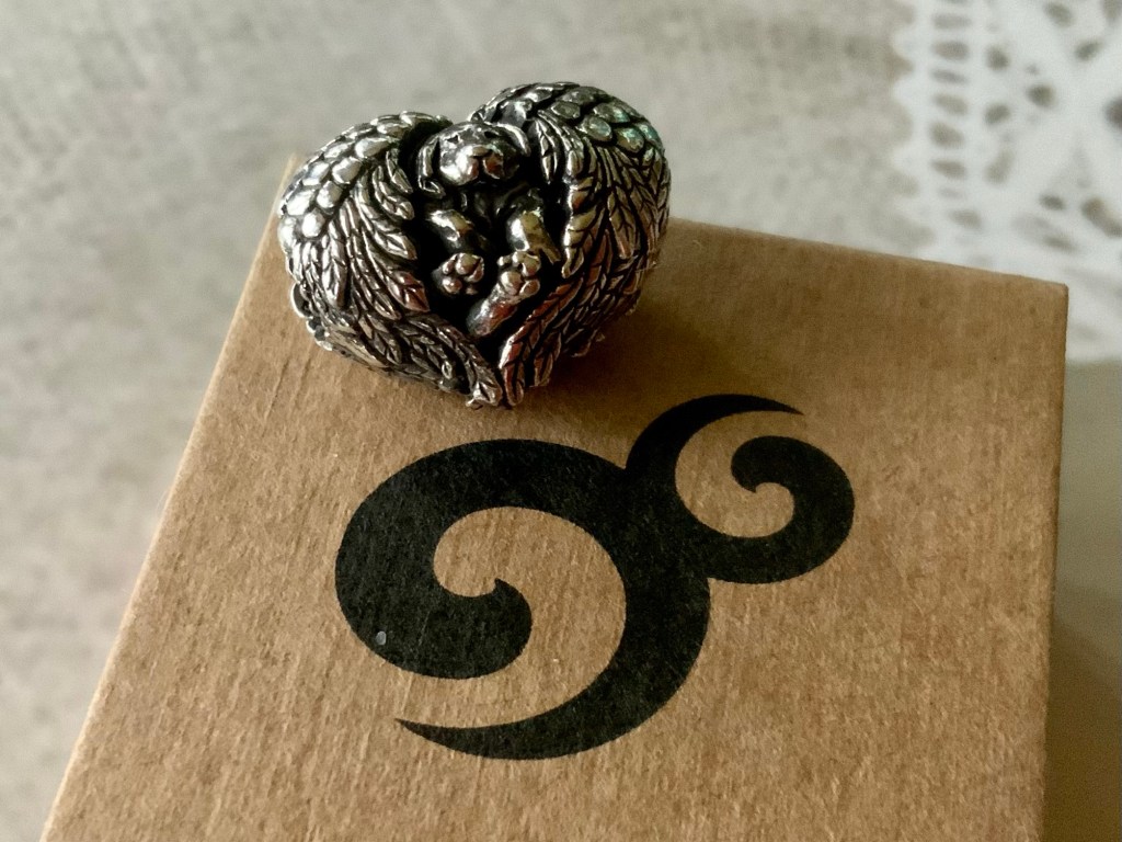 Puppy Love is a heart shaped bead with angel wings lovingly embracing a puppy.