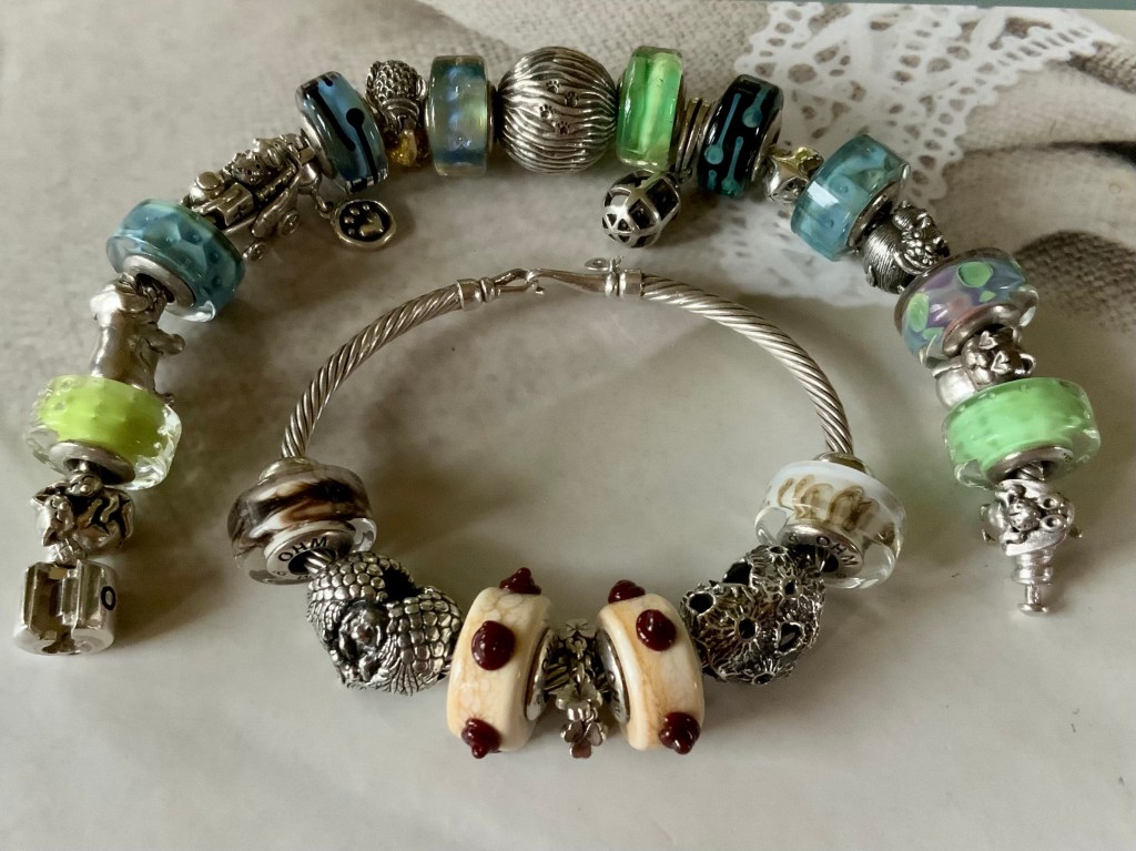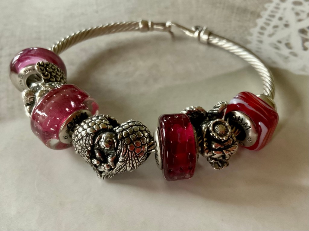 Puppy & Luna Love bangle combined with my Pets bracelet. On this bracelet are beads for all the pets that are or were in my life. Cats, dogs, fish, rabbits and Guinea pigs. With Memories In Sand and Paws Of Love.