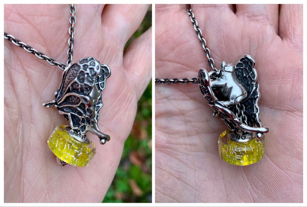 Puppy Love reminded me of this combination I wore last year to commemorate the passing of our yellow Labrador Zora. Wings Of Protection holding Labrador Retriever on the ball chain necklace with Yellow Sunlight glass.