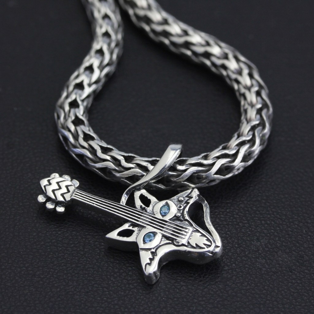 BLUE EYED BARK based on May-T’s original design which is known as the Bark 1 Art Guitar. It intends to combine function and design together harmoniously. A very unique guitar design, recognized by art lovers, musicians and collectors alike. When adapting the pattern into a pendant, OHM has also inlaid a glittering aquamarine in the same color as Mowgli’s eye on the guitar body. Look at any angle, it’s chic and different.