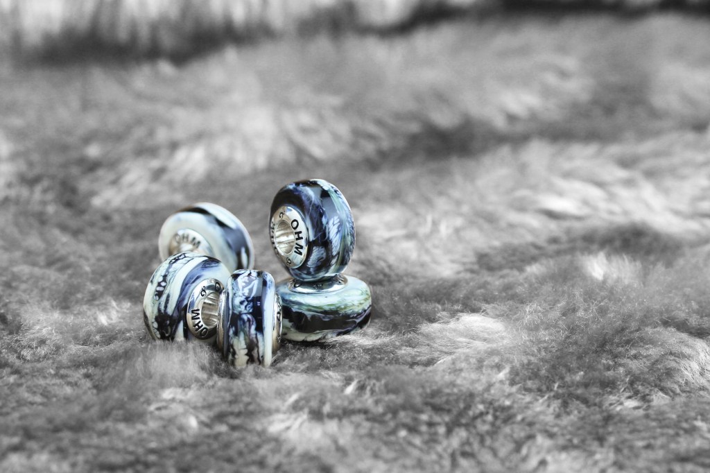 Mowgli is May-T’s Siberian Husky, a FOXFIRE pedigree, characterized by a large skull, short mouth, tall, elegant, thick and fluffy fur. OHM has brought Mowgli’s coat colors, white, grey, black, in a design of three shades of glass in one bead. Each piece is unique.