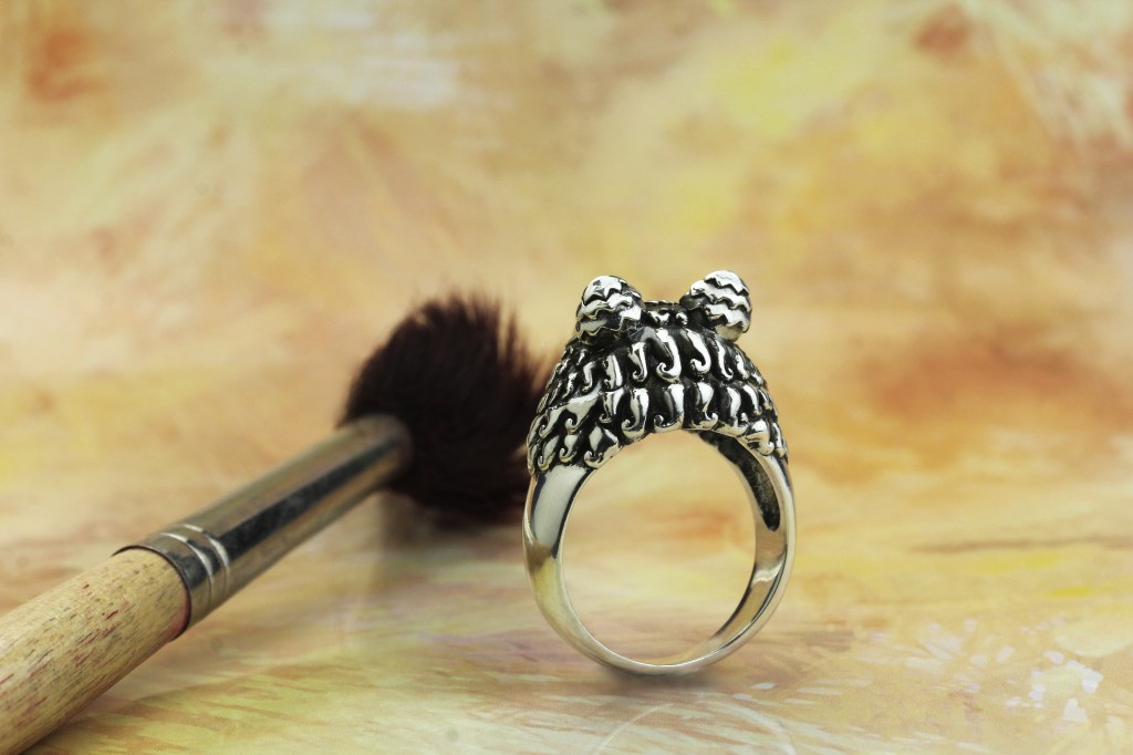 CURLY WOLFY RING is Mowgli’s head on a ring. Very cute and adorable details, can you see them, you have to smile as Mowgli was designed to have wavy curly hair that mimics May-T’s hairstyle. Connecting them together as one through their love for each other. In Mowgli’s eyes are the letters M and T after May-T’s initials.
