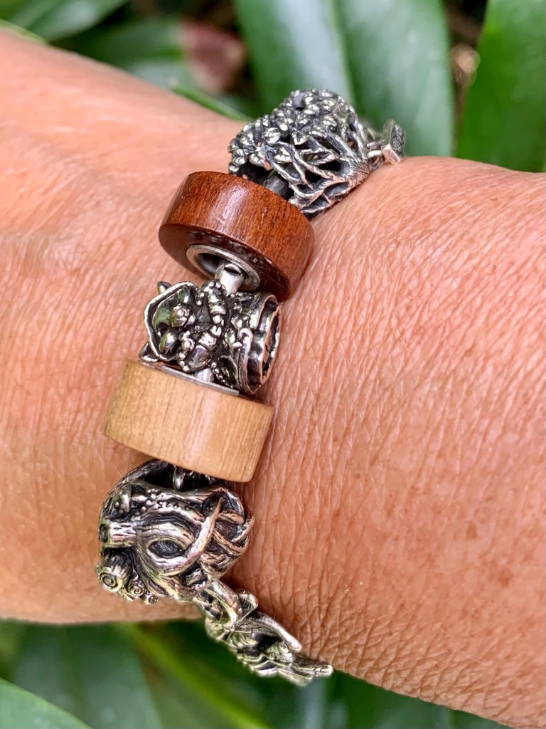 Foxy Lisa is shy and loves to stay in the woods. I made a bracelet with Heart Of The Woods, Morning Wood, Foxy Lisa, Holly Wood, Love Grows on the Skinny bracelet with Dragonfly-y clasp.