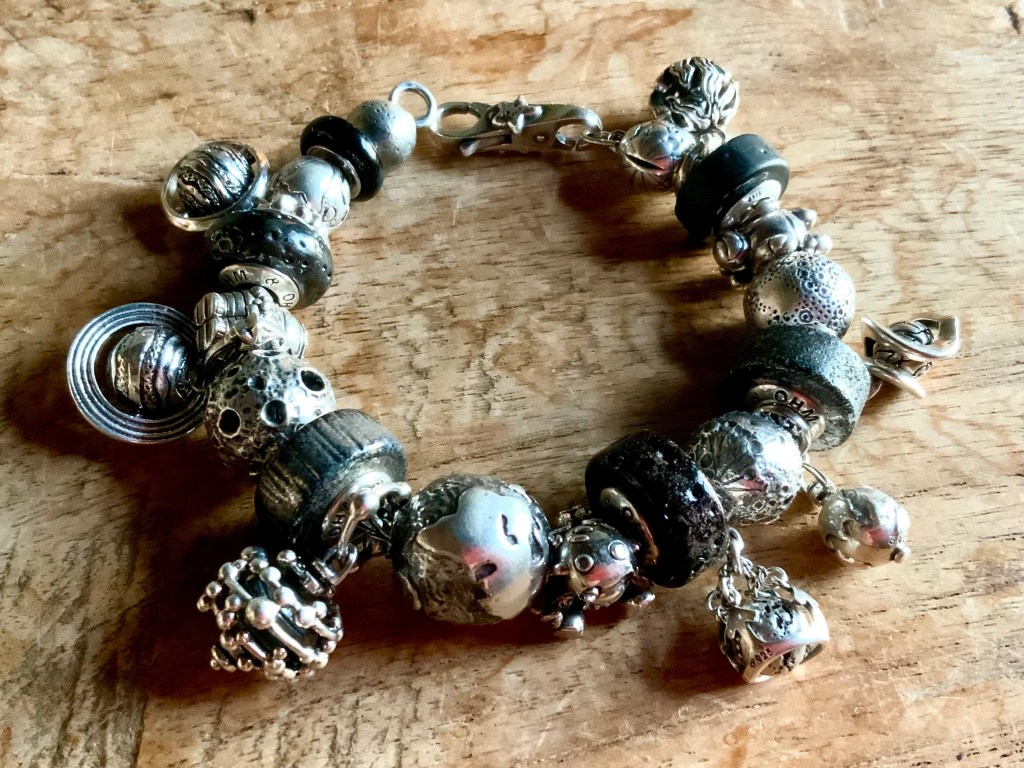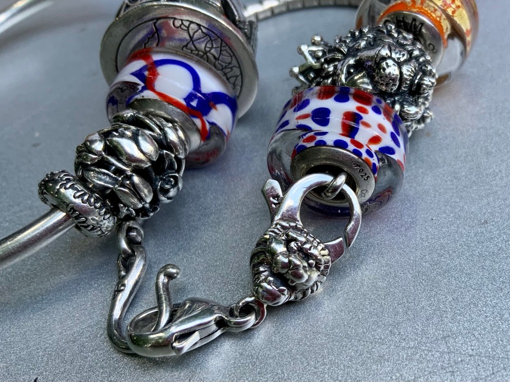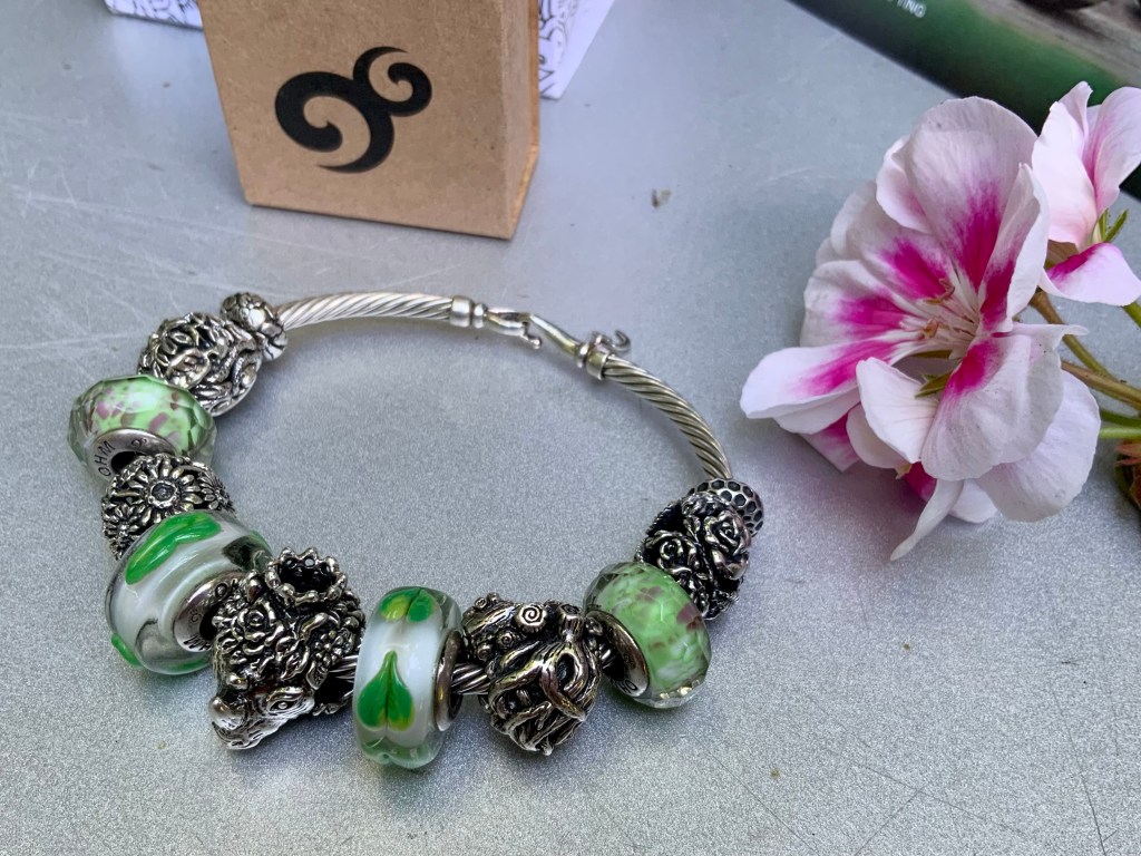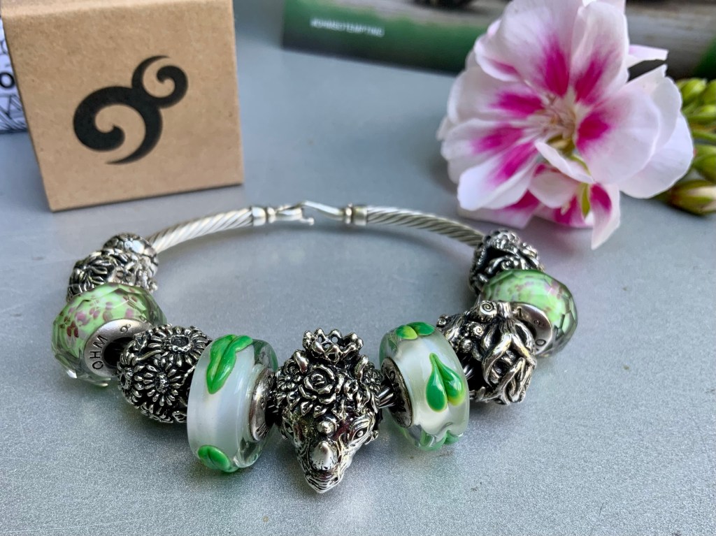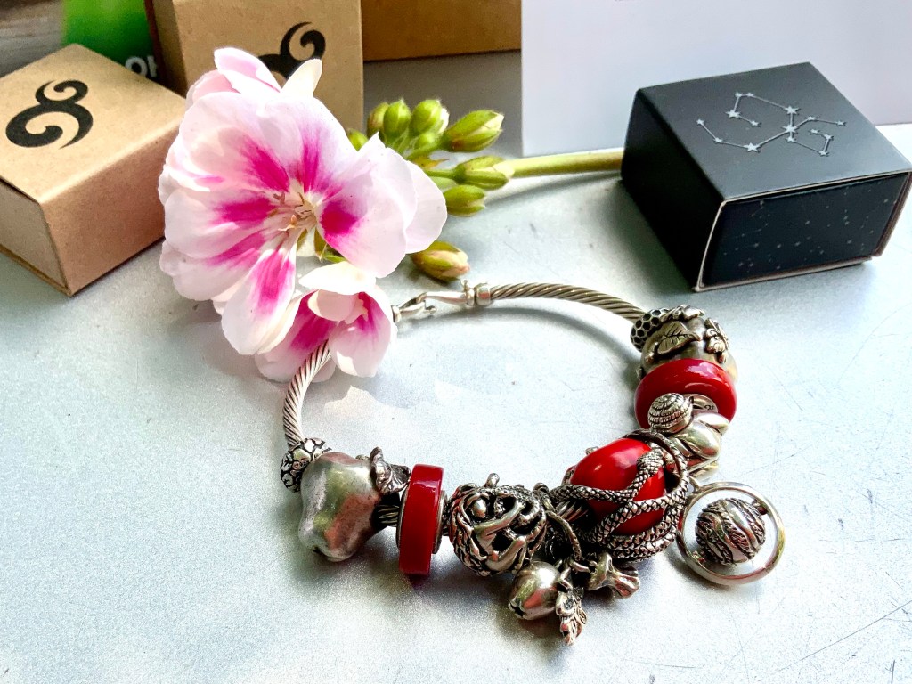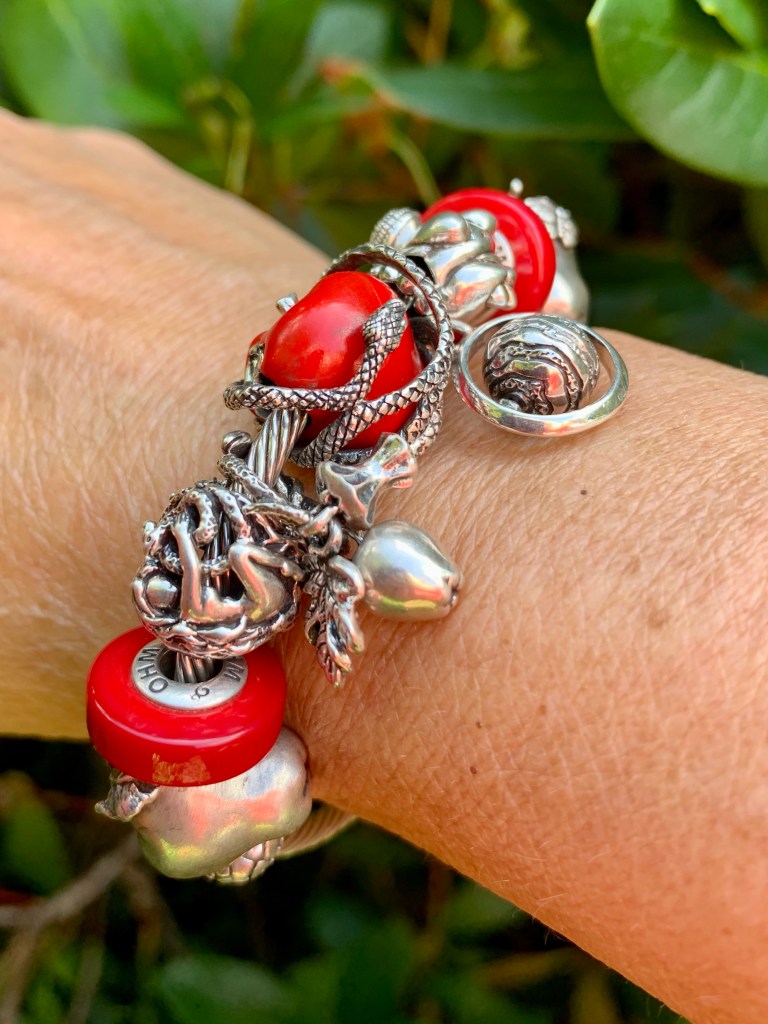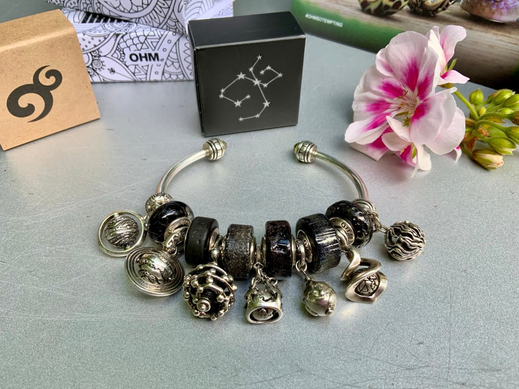 The bangle I made shows the garden of eden. The serpent and the apple are a mayor event in human history so I added Uranus Unhhhh because it stands for taking risks, take chances and have transformative effects! The beads are OHM Studio Apple, Sour, So Tempting, So Tempted, Forbidden Fruit, Uranus Unhhhh, Venus of Willendorf, Sour and OHM Studio Apple with butterflies.