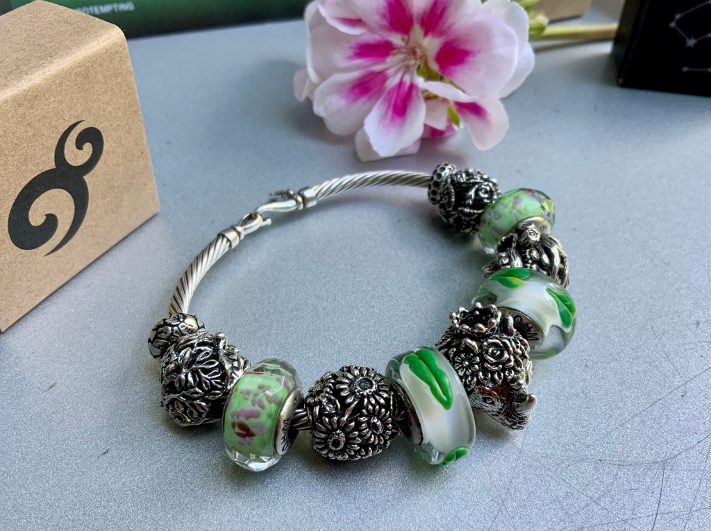 Queen Of Rhinohm lives mostly on plants and leaves. This bangle is with So Tempting (backwards), Spring Refractions, Sunflowers, Leaf Life, Queen Of Rhinohm, Leaf Life, Heart Of The Woods, Spring Refractions and Rose.