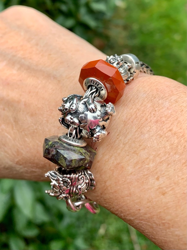 A Year of the Dragon bracelet with Beadmail 34 Dragon Awakes and OROQ 7 Dragon Ajusts, a Red Jasper stone. And Baby Dragon.