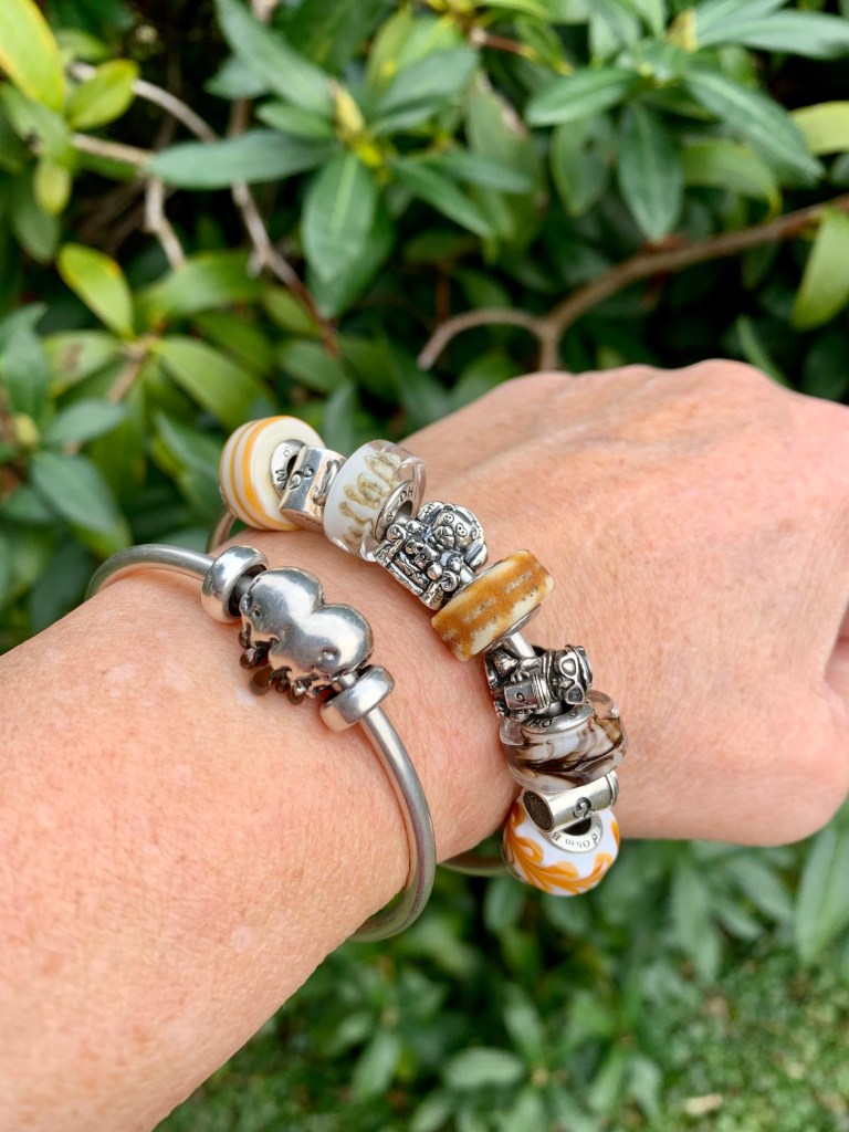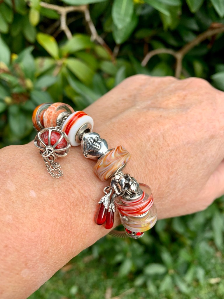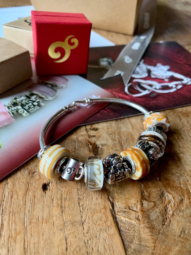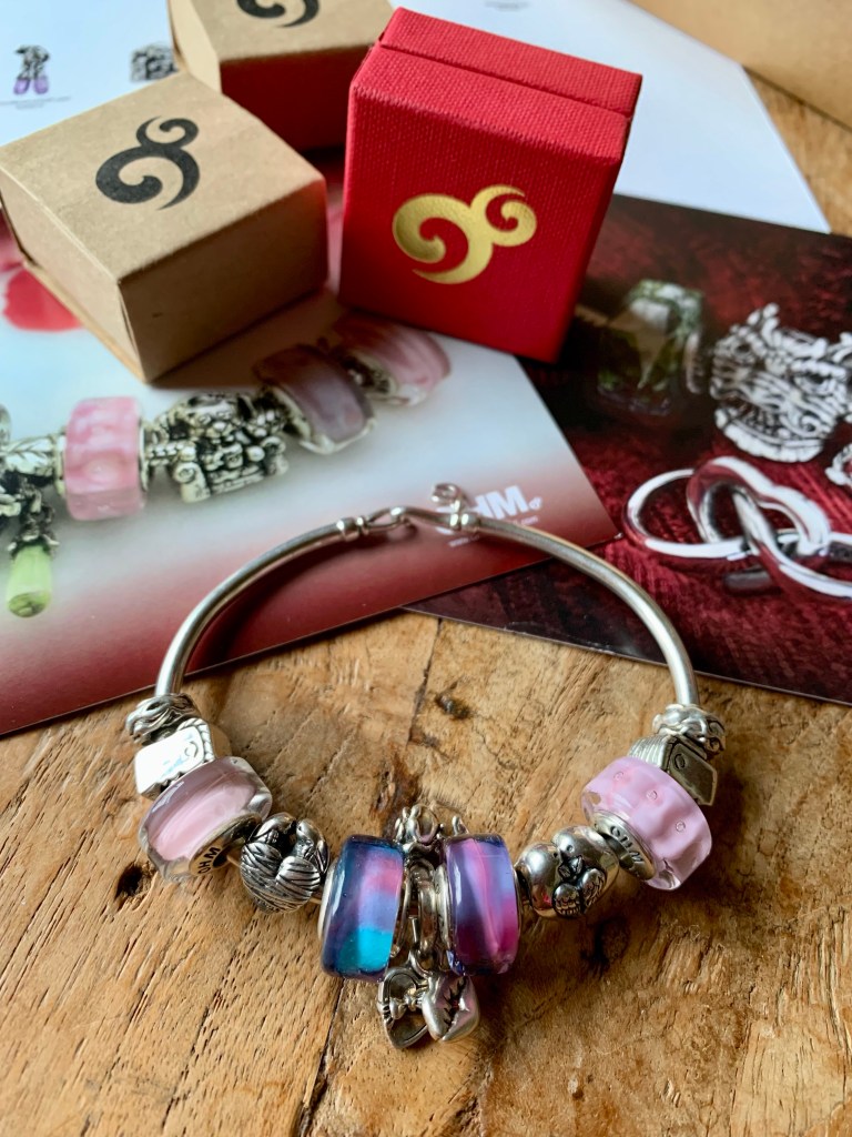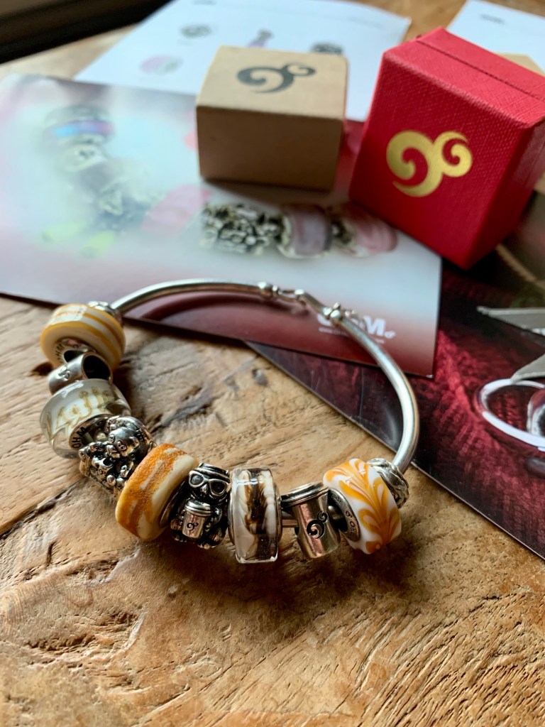 Sweet Dreams is a very special glass bead. I made a night inspired bangle with Luna Flowers, AFAIK, Behemoth, Sweet Dreams, Who Dead and Whooo Has Class?. Stacked with a Skinny bracelet with Dragonfly-y clasp and Luna Leaf. (Both Luna’s are from OHM Studio2go).