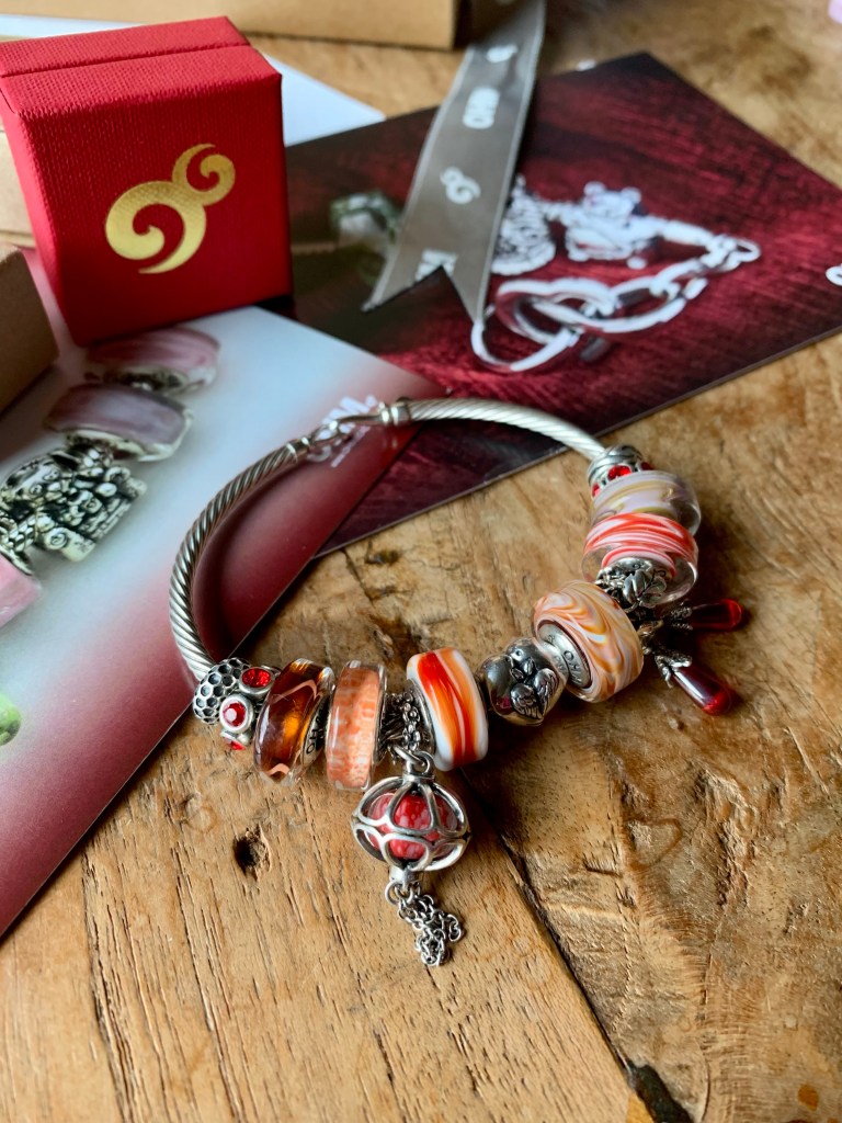 I made a warm cozy feeling bangle perfect for the cold season in witch we celebrate Valentines Day and Chinese New Year. With January Spinner, Mulled, Nog, The Red Lanterns, Bacon, Love Birds, Wood-ation, Epicurean Eggplant, Bark, Haze and January Spinner.