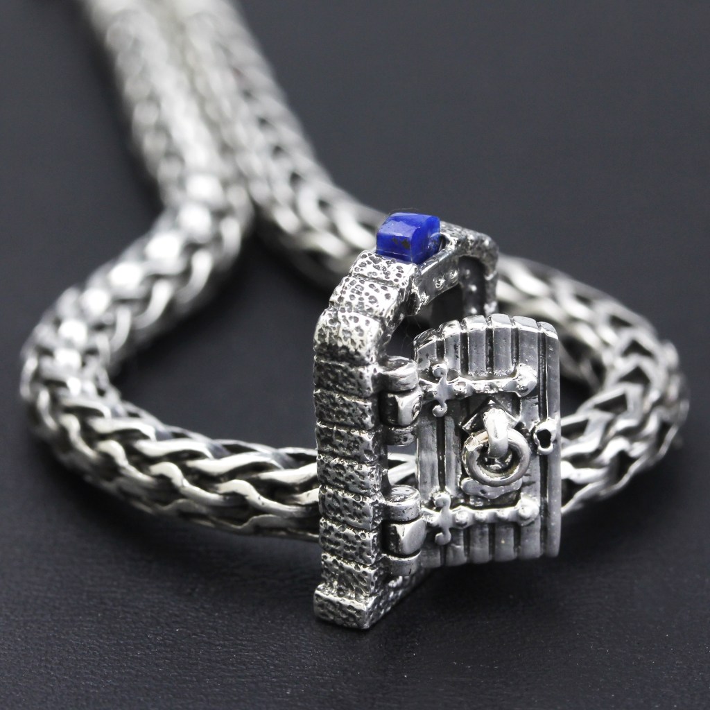 OHM acknowledges and honors the importance of this doorway to the soul with our Visuddha chakra bead fashioned as a magnificent ancient castle door with rivets, hinges, stonework, and a silver knocker. The capstone of the arch is the Visuddha blue, a lapis stone, to remind you of the infinite possibilities that your self-expression can take. Even the bracelet itself passes through the open doorway. This chakra bead on your bracelet beautifully symbolizes the door that opens to the castle of your soul. Fling open your door in welcome and creatively express yourself! Listen to the wisdom of the Universe and speak your Truth.
