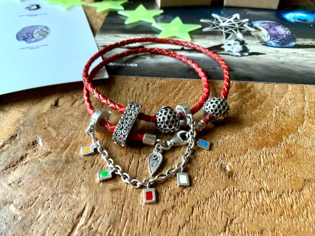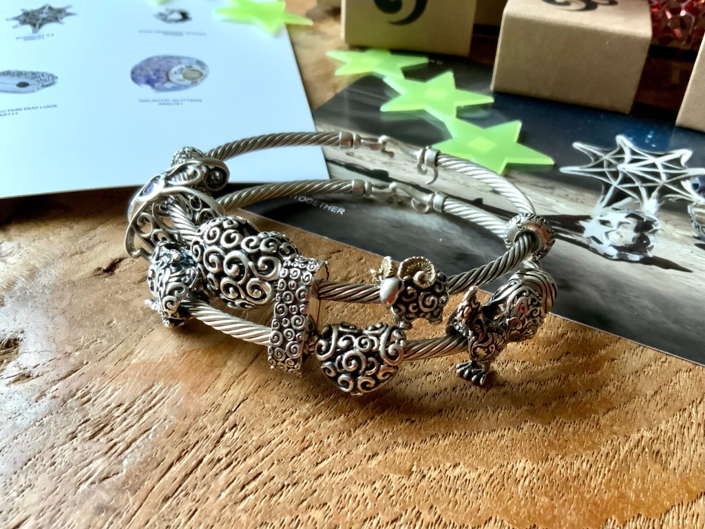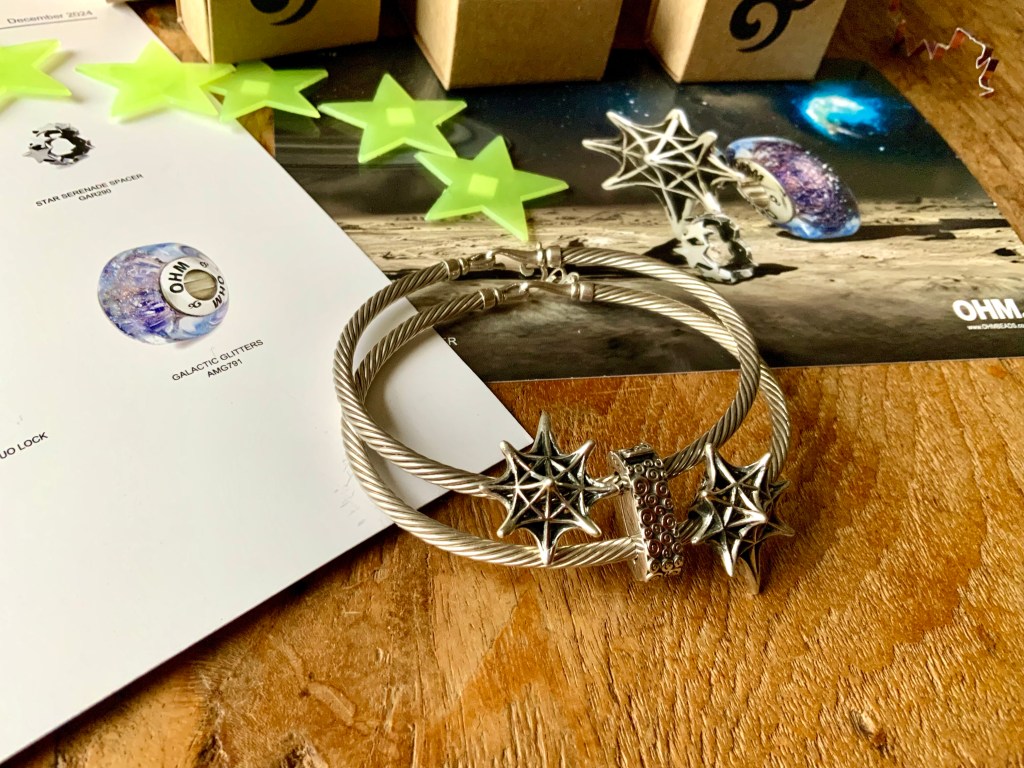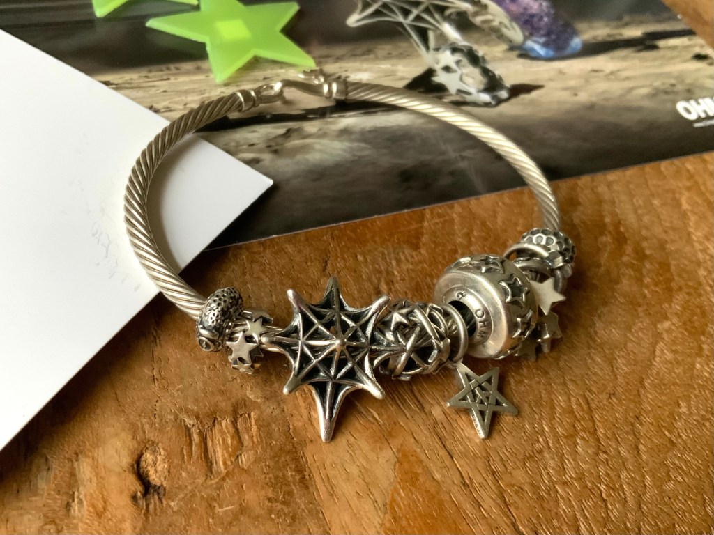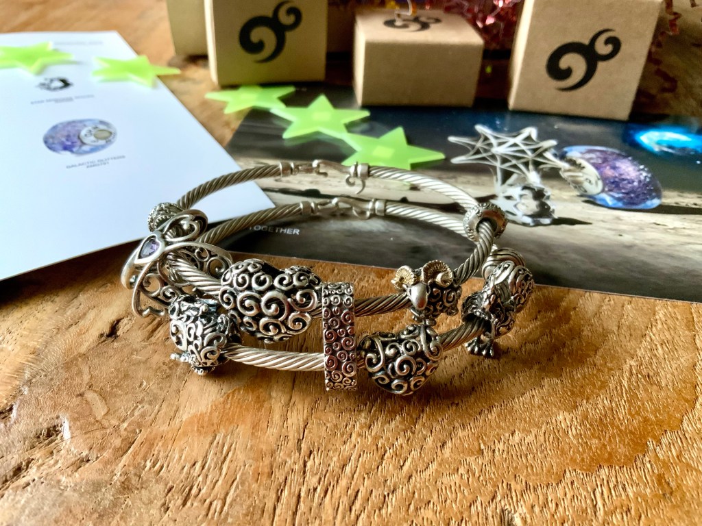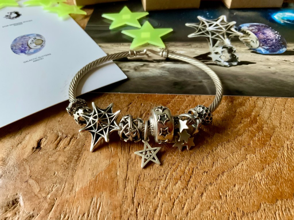 I made an all silver bangle with star beads. They are Star Serenade Spacer, Stardust 2.0, Meteor Shower, Star, Star Wheel, Lucky Stars and Spacey.
