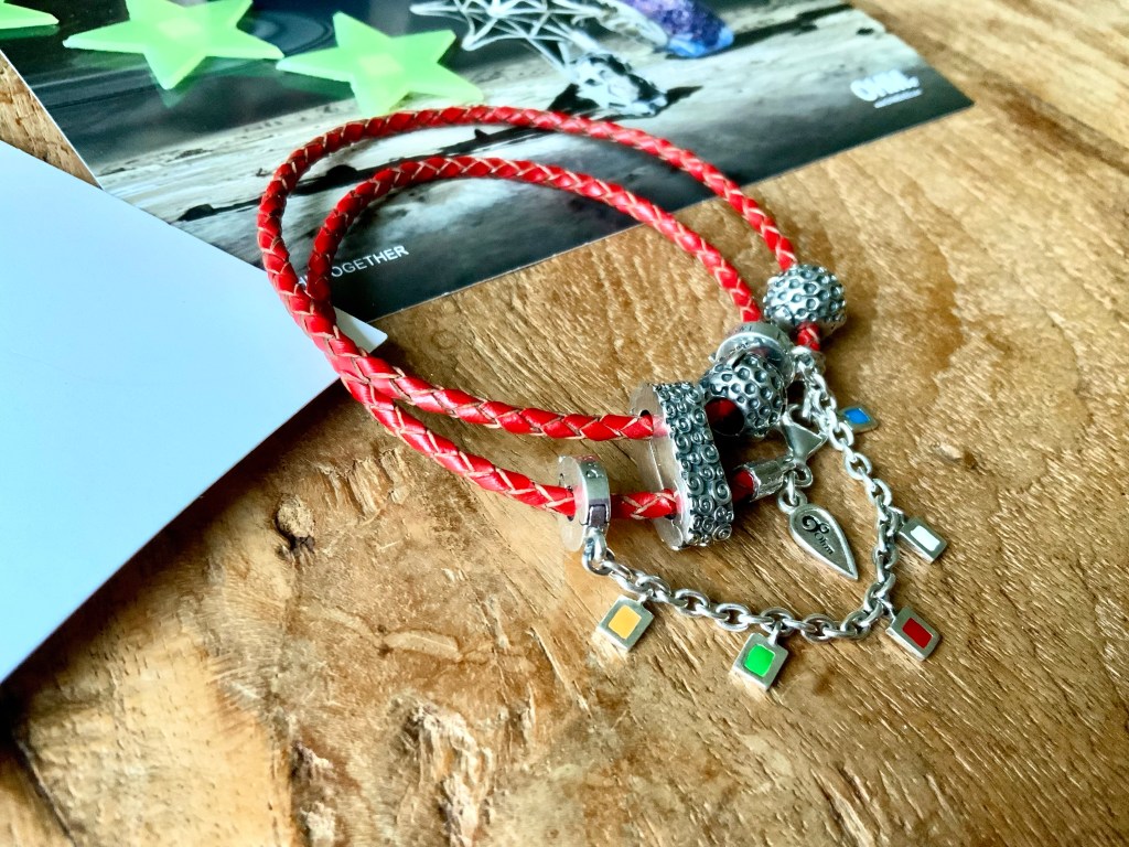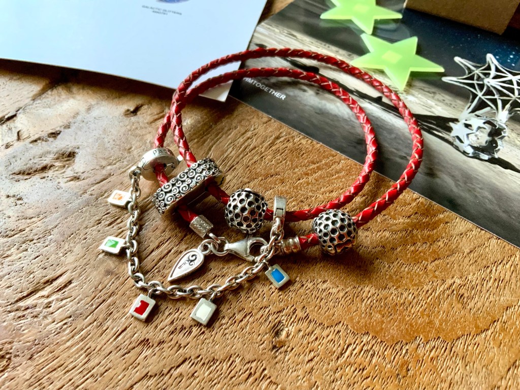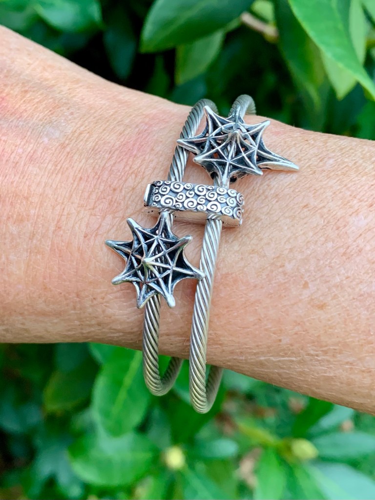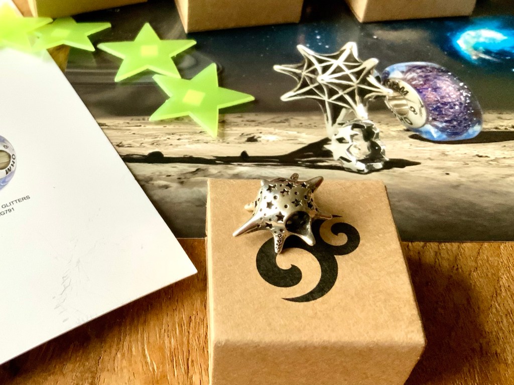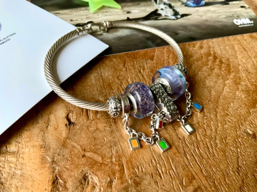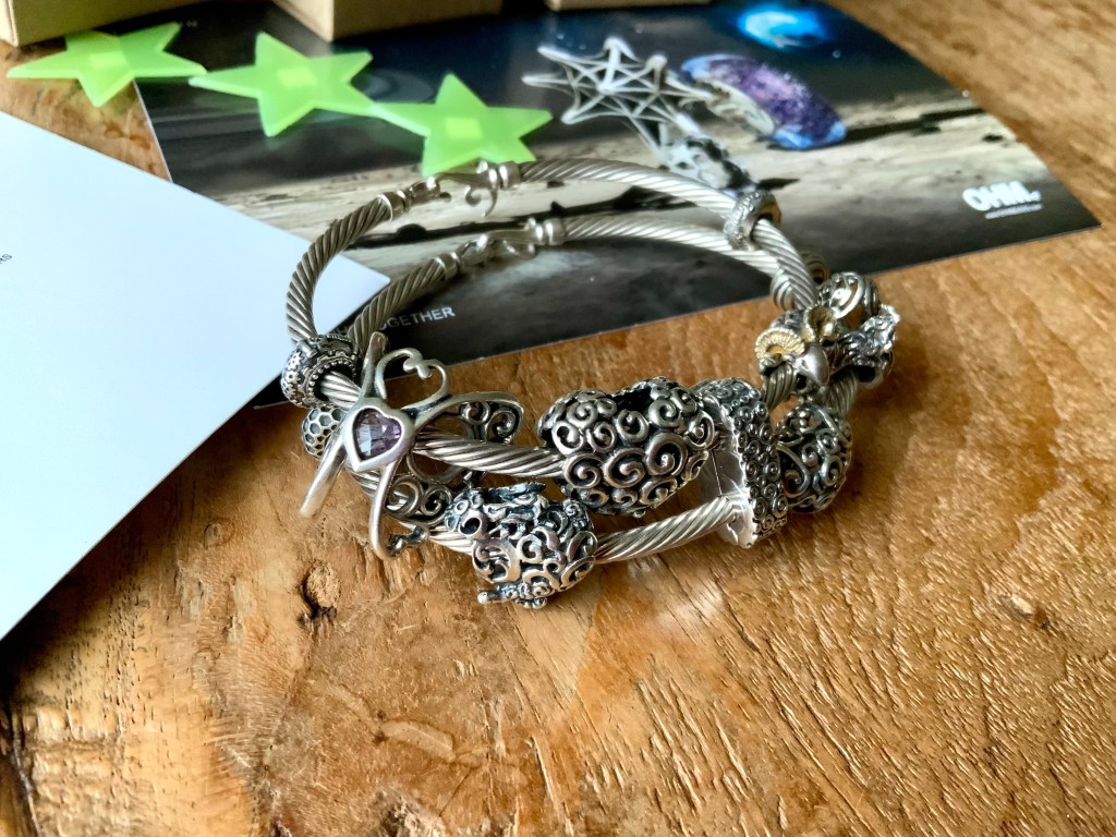 I made an all silver bangle with star beads. They are Star Serenade Spacer, Stardust 2.0, Meteor Shower, Star, Star Wheel, Lucky Stars and Spacey.
