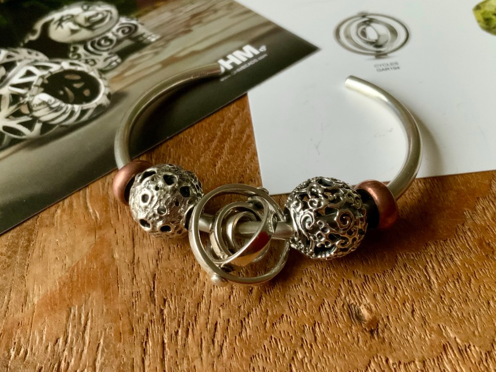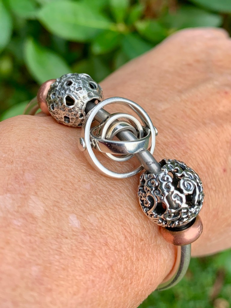 Cycles can reflect the orbits of the planets. Here I put Cycles on a leather bracelet looping it through the bead twice. Stacked with the Balance bracelet.