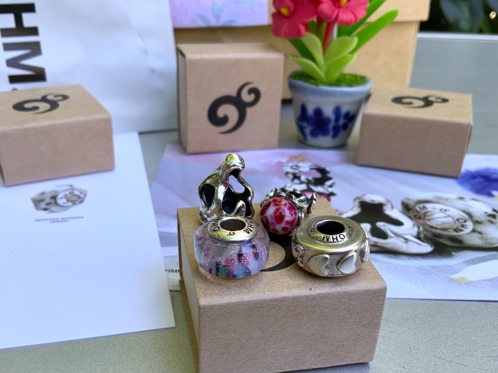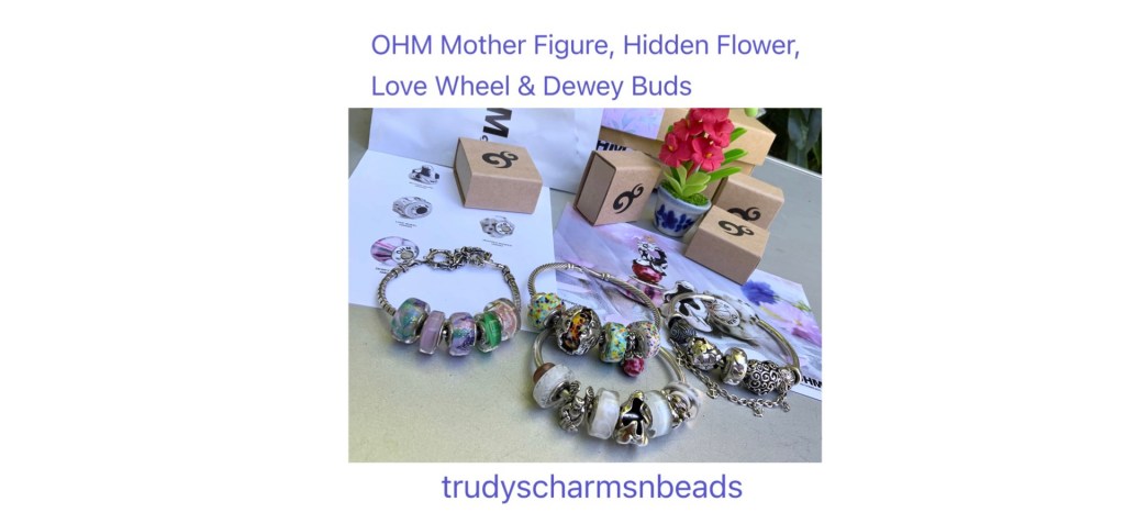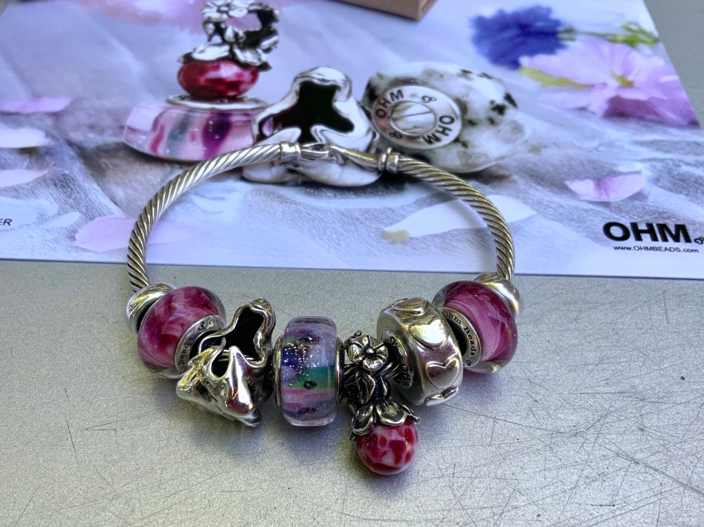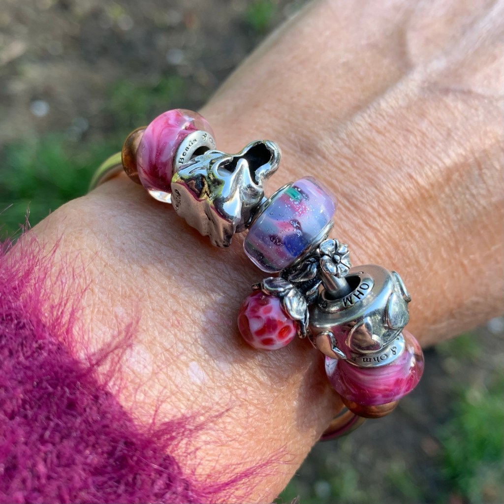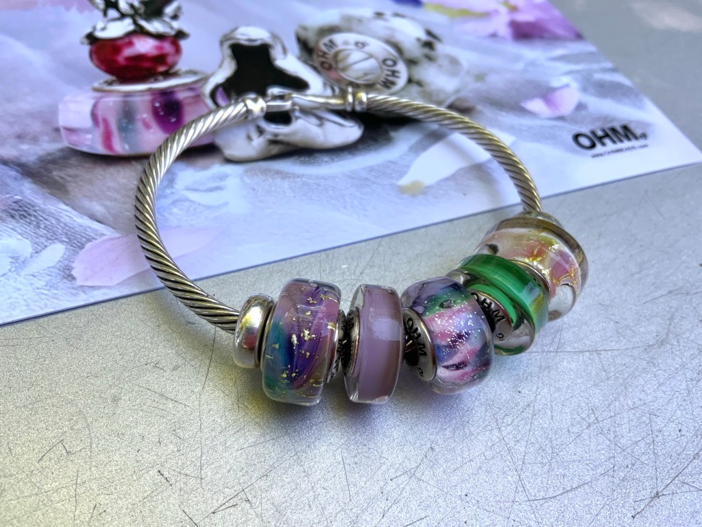 This bangle shows Love Wheel with other Wheel designs. Star Wheel on the left was released last year for OHM’s Sweet Sixteen celebrations. And Summer Garden is the same Wheel bead painted with enamel paint! There are more different painted Wheel designs. I combined them with two January, an August and a May spinner.