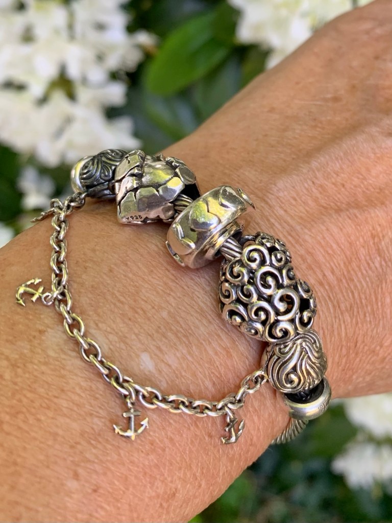 And Love Wheel as a centre piece of an all silver love bangle! With Ocean Wave safety chain, Heart Of Stone, Love Wheel and LE Love Whirls.