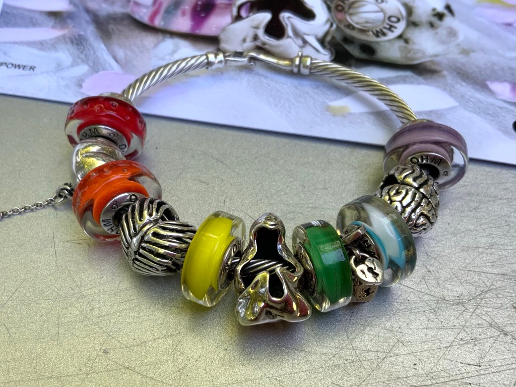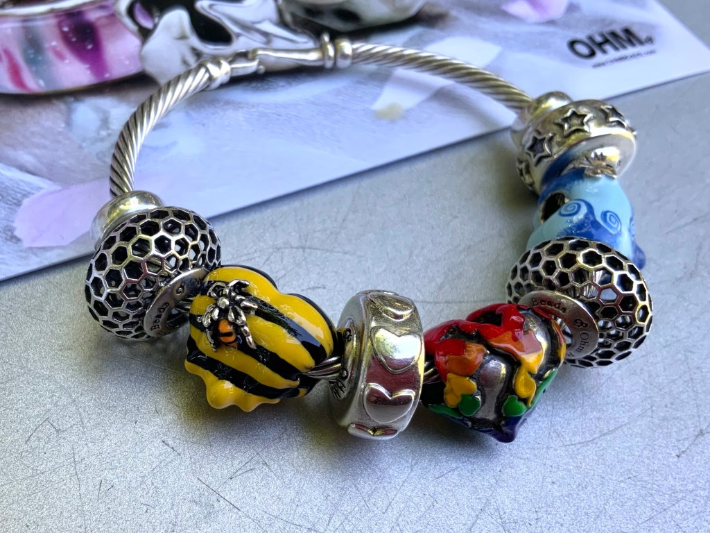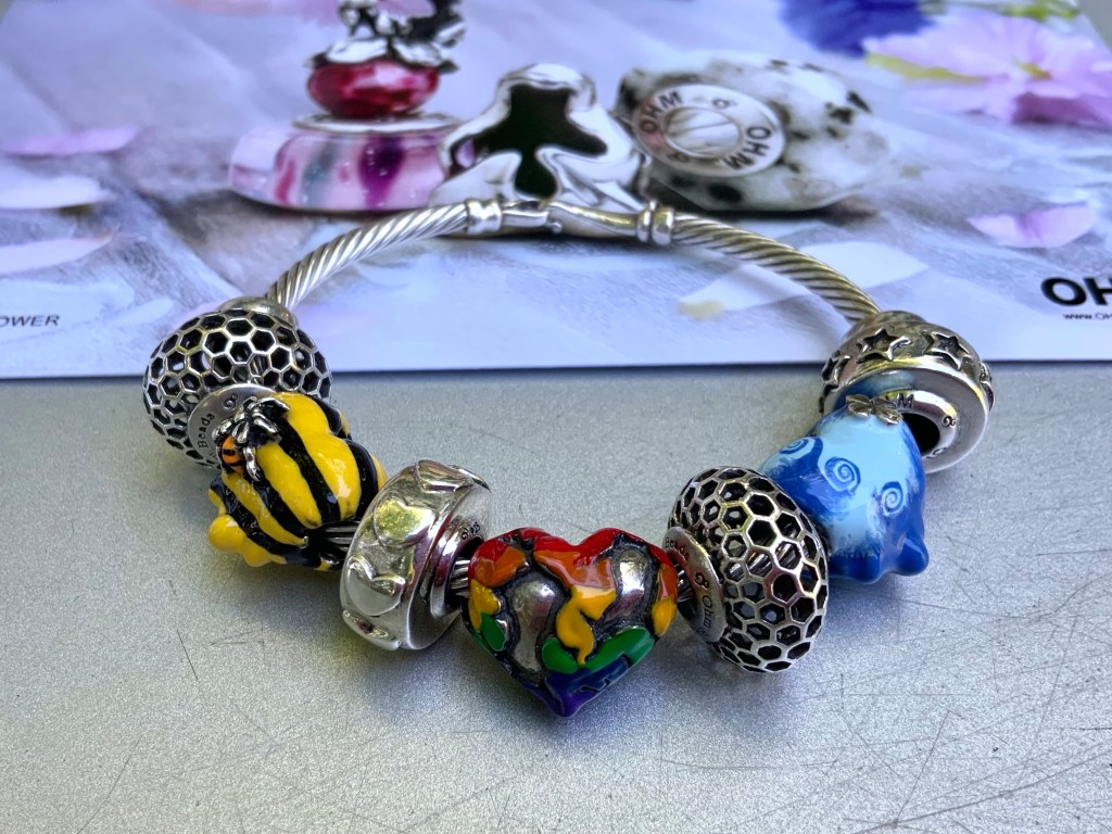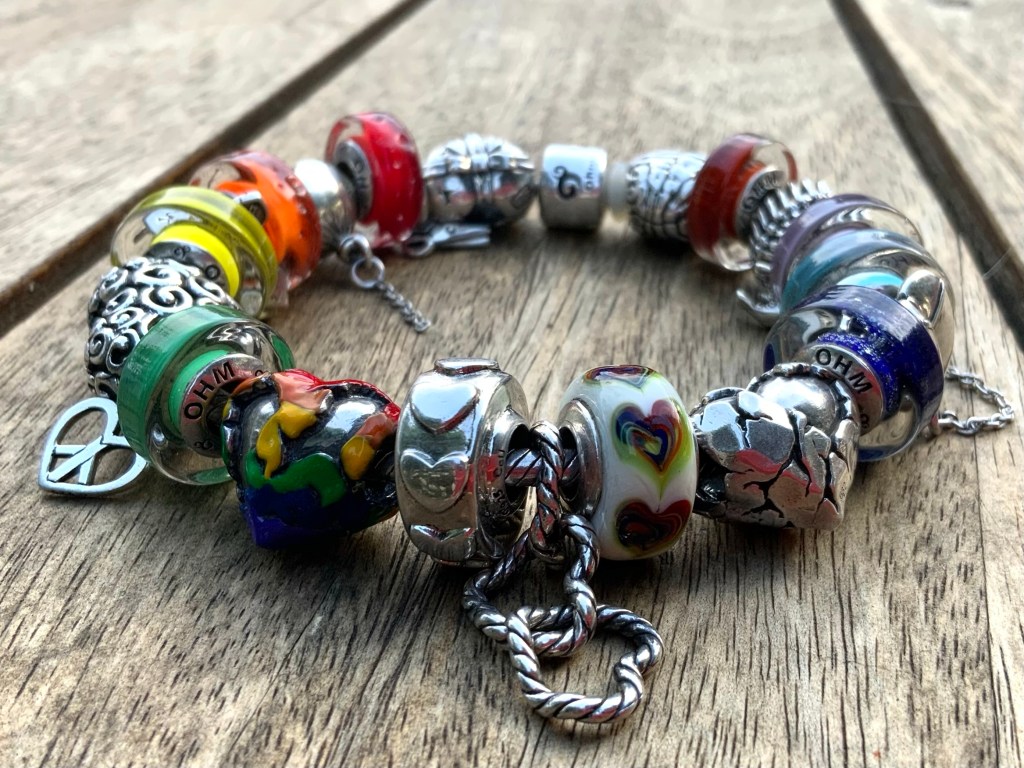 The Wheel beads together with the two Hive Mind made for a reverse bangle! Normally the barrel shaped glass gives the colour and the beads in between are silver. Now it’s the other way around! The enamel hearts are Safe The Bees, Heart Of Stone Pride Edition and Beadmail no. 12.