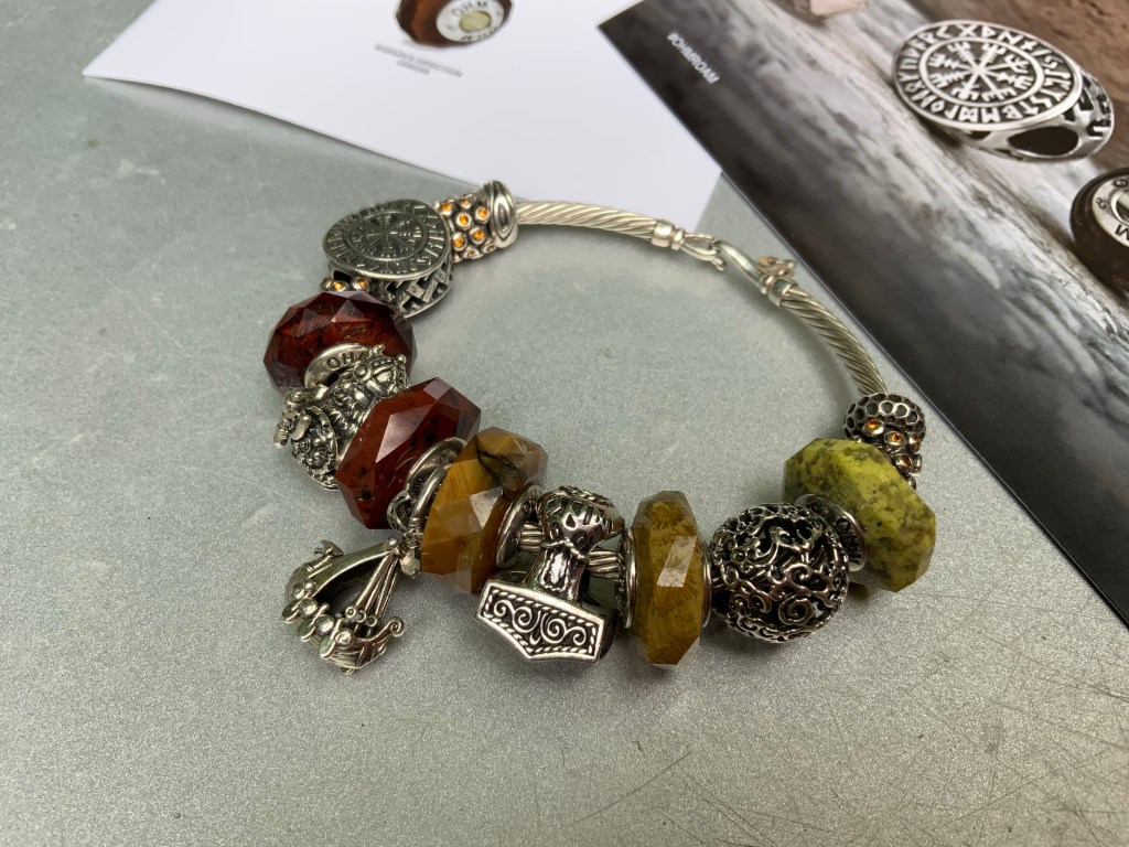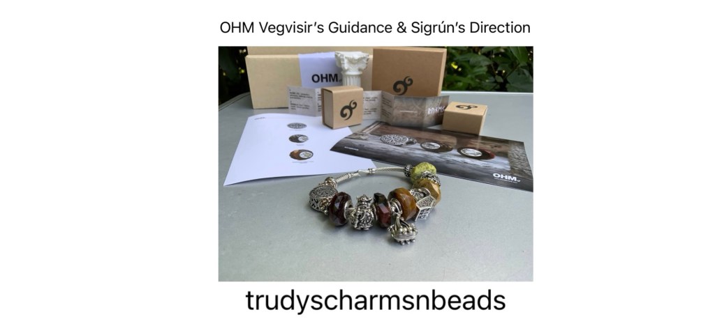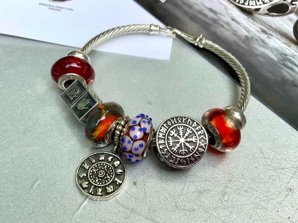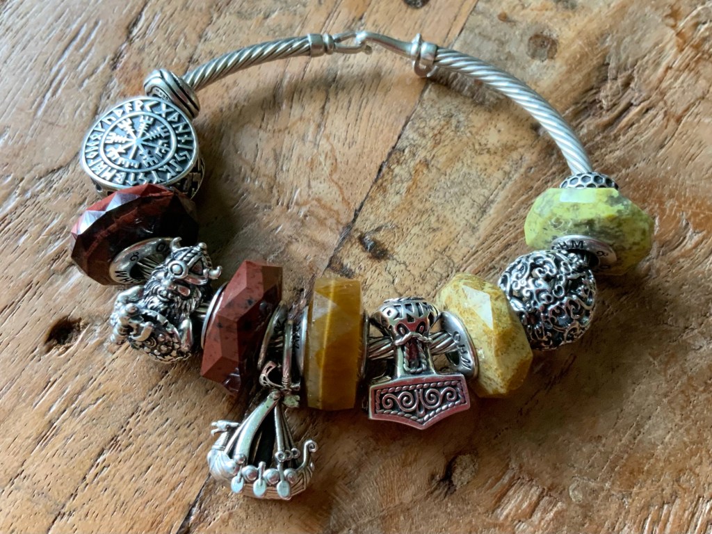 All put together and you get a stunning, fun and powerfull Viking bangle! With small yellow spacers, Vegvisir’s Guidance, Sigrún’s Direction, Beadmail no. 27 OHMGnome Thor, Wild Wisdom, Beadmail no. 44 Norse Longship, OROQ no. 1, Mjölnir’s Resilience, OROQ no. 11 Historia Stone, Beadmail no. 45 Ocean Waves and Spiritual Awakening.