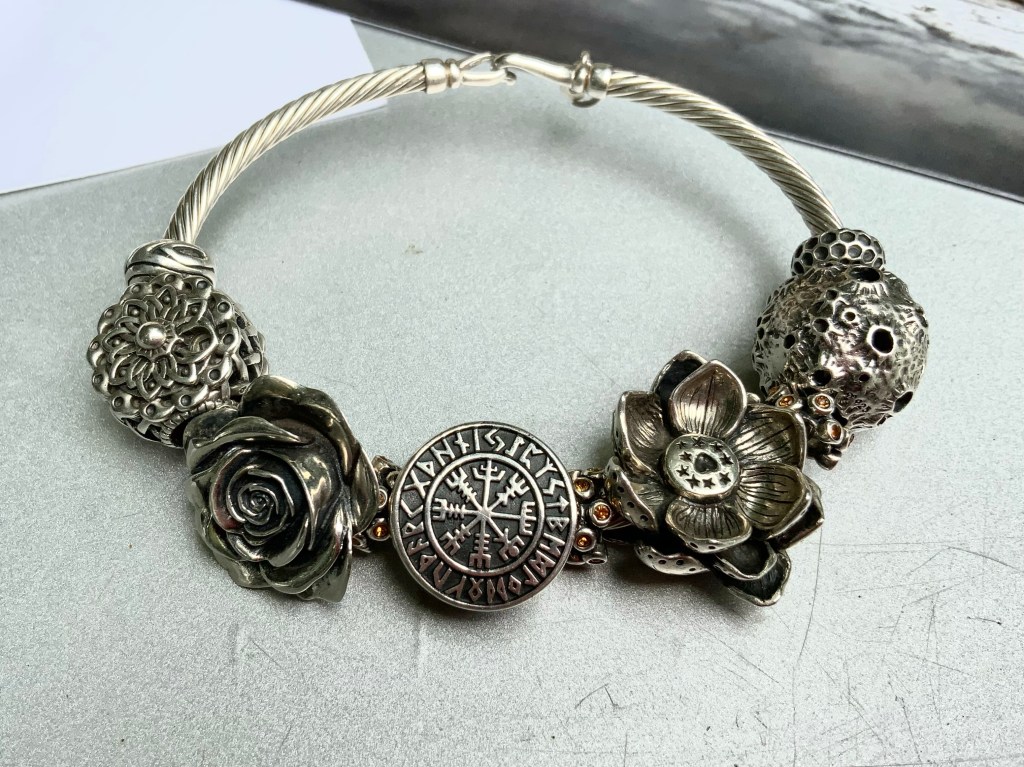 Playing with shapes, silver round beads that go so nicely together! A bangle with The Oracle, Majestic Vitality, Vegvisir’s Guidance, Stay Grounded and Luna 2.0.