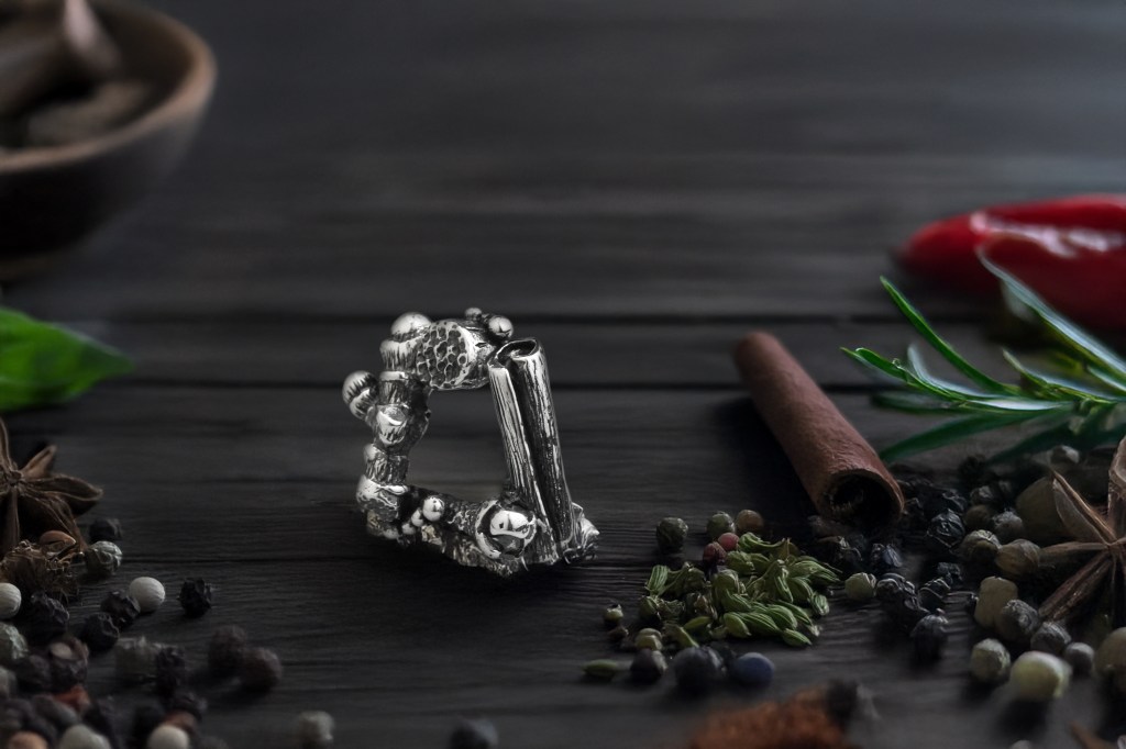 PUMPKIN SPICE SPACER, in sterling silver essence of the season, adorned with delicate engravings of ginger, cloves, cinnamon, allspice, and nutmeg, symbolizes warmth, protection, and well-being. Ginger promotes immune health, while cloves bring clarity and peace. Cinnamon boosts circulation and lifts spirits, allspice invokes comfort and protection, and nutmeg inspires sweet dreams and fortune. In tradition, these spices weave a charm of health and love. Let this elegant spacer infuse your designs with the cozy, magical essence of autumn, perfect for your next seasonal hibernation.
