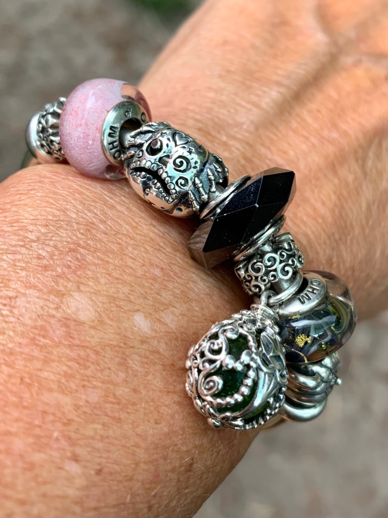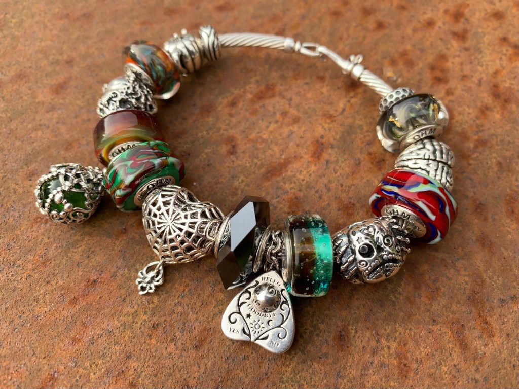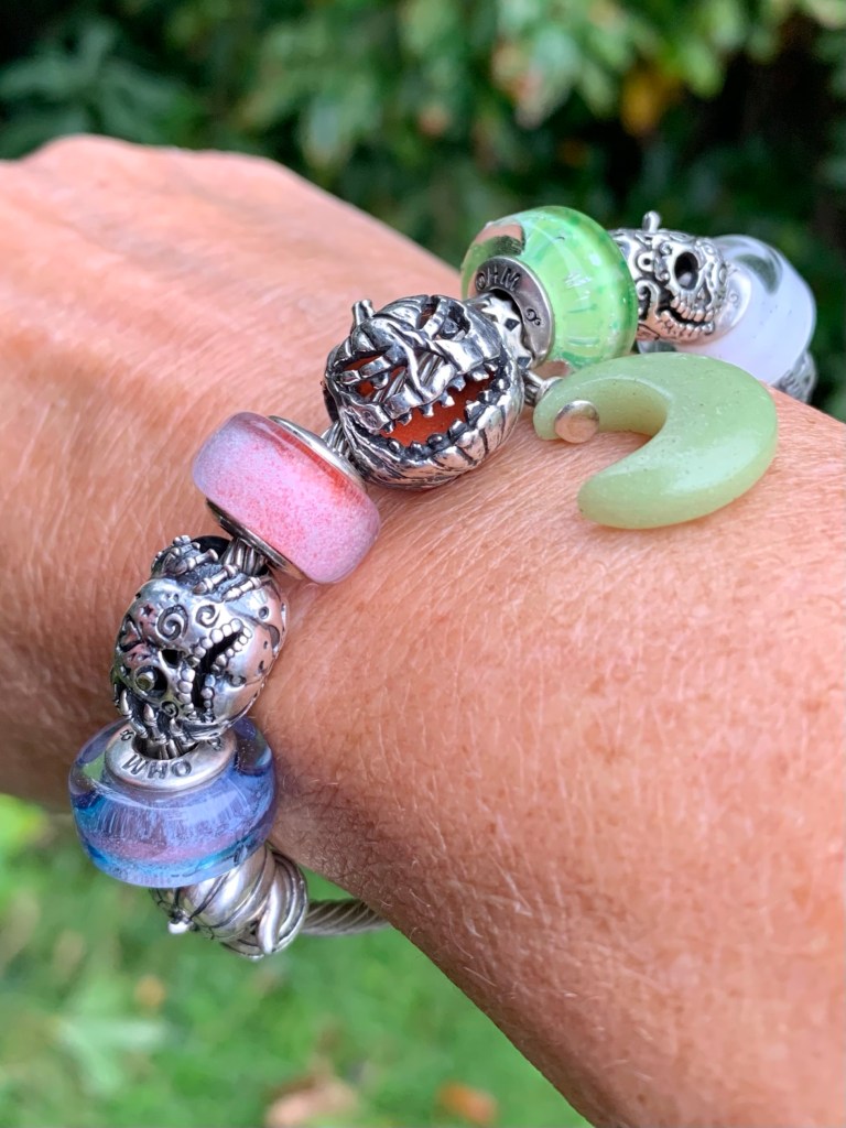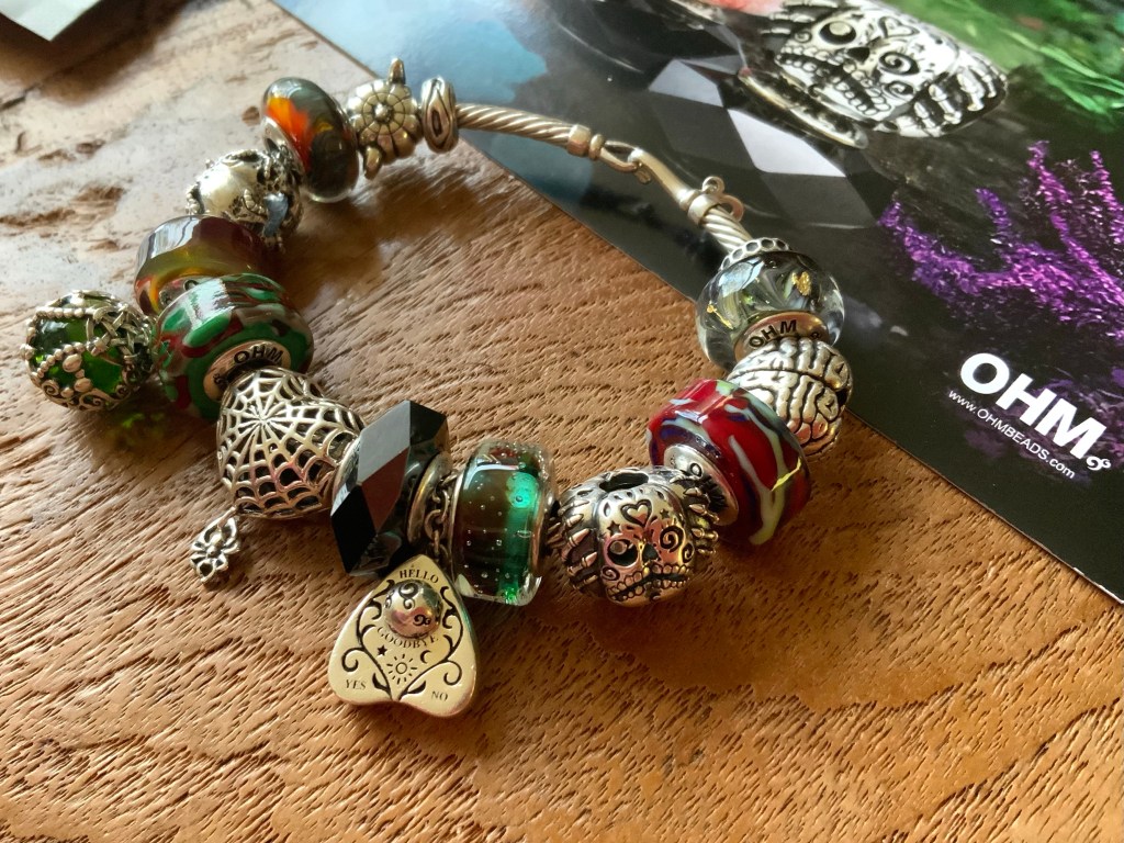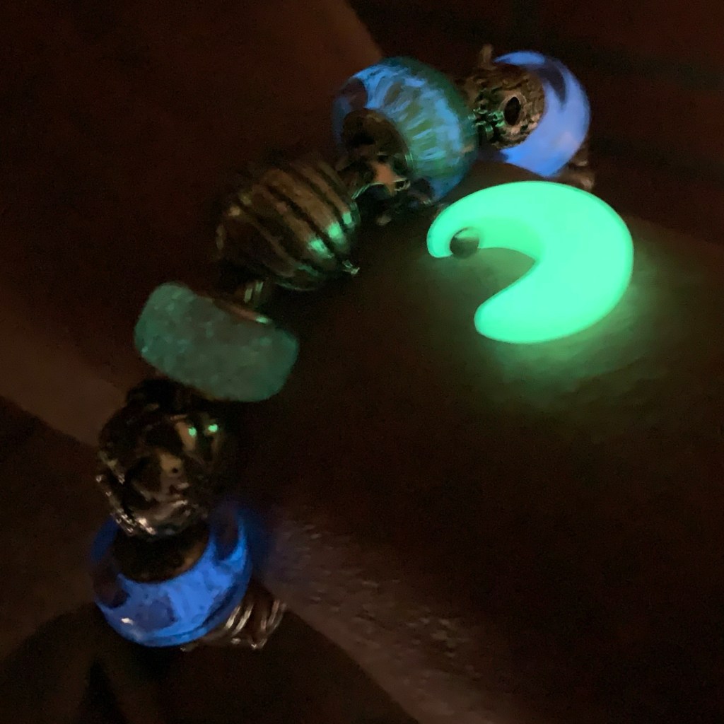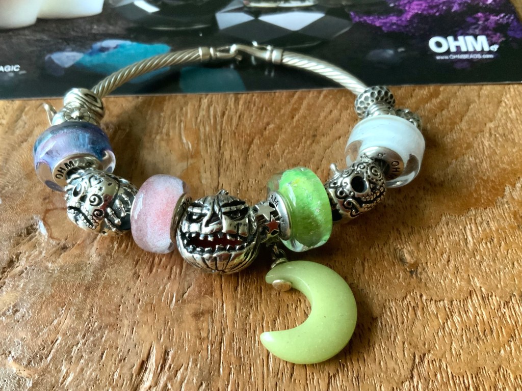 All OHM’s glow in the dark glass beads together with a glow in the dark Rock! A bangle with Pumpkin Spice Pot, Sweet Dreams, Inner Ghoul, Ghoulish Glow, Trick Or Treat, OROQ no. 10 Moonlit Serenade, Glowing Moss, Deadhead, AFAIK and Pumpkin Billy.