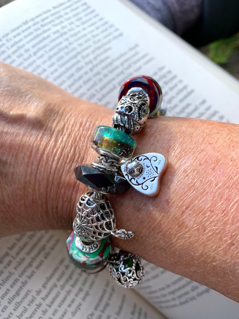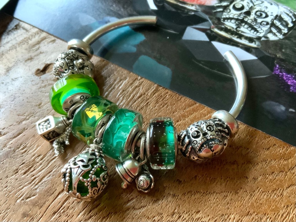 On this first bangle I combined Immortal Juice with other green glass for a last farewell to summer! With Deadhead, Candy Apple, Vial, Hock, Ocean Path, Immortal Juice, Fern Ridge, Bell, Eye, Poisoned Apple and Inner Ghoul.