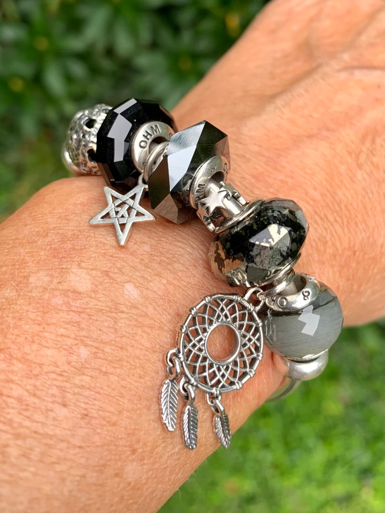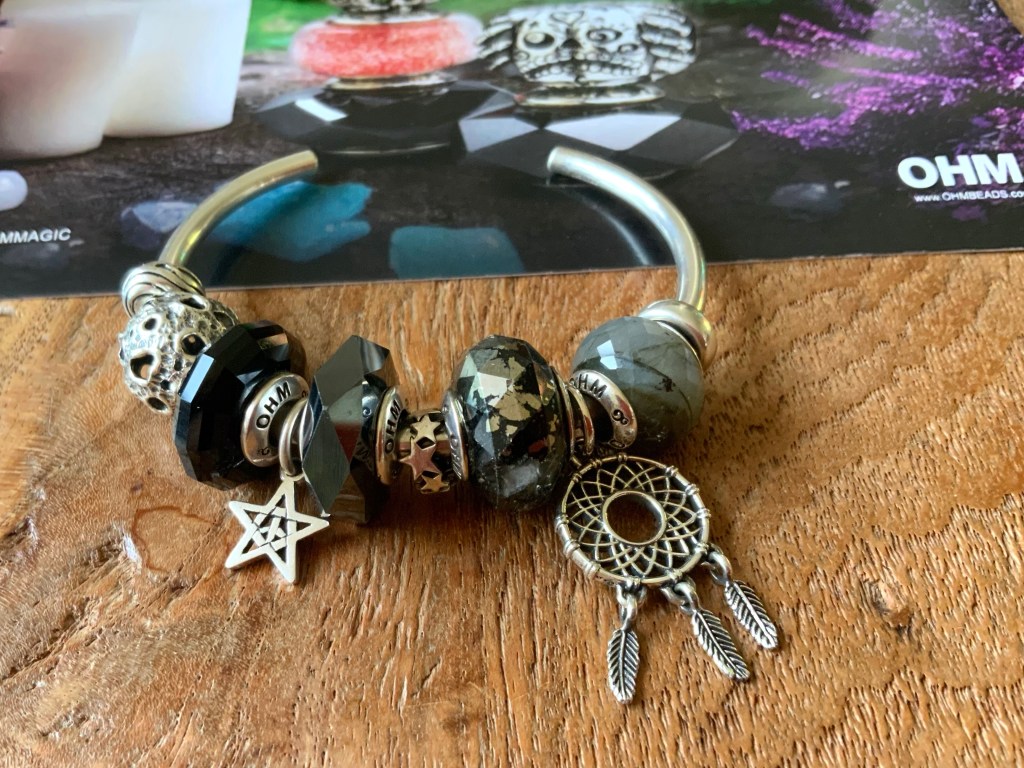 A nighttime themed bangle is next with Luna 3.0, OROQ no. 6 Hello Darkness, Star, Midnight Mirror, Star Serenade Spacer, OROQ no. 14 Eternal Nightfall, Beadmail no. 55 Breathing Dreams and Phase Shift.