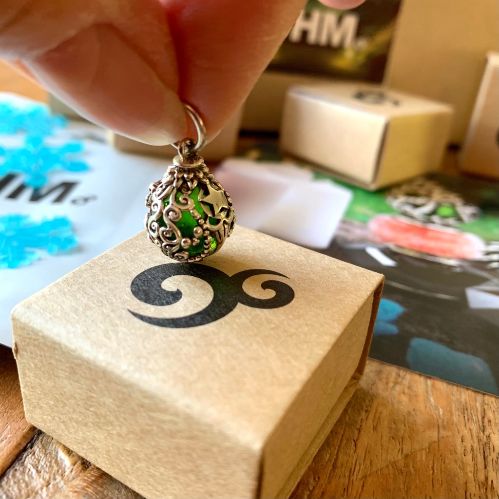 And last but not least Immortal Juice, a stunning dangle! A green glass ball wrapped in silver with witchy magic swirls and motives!