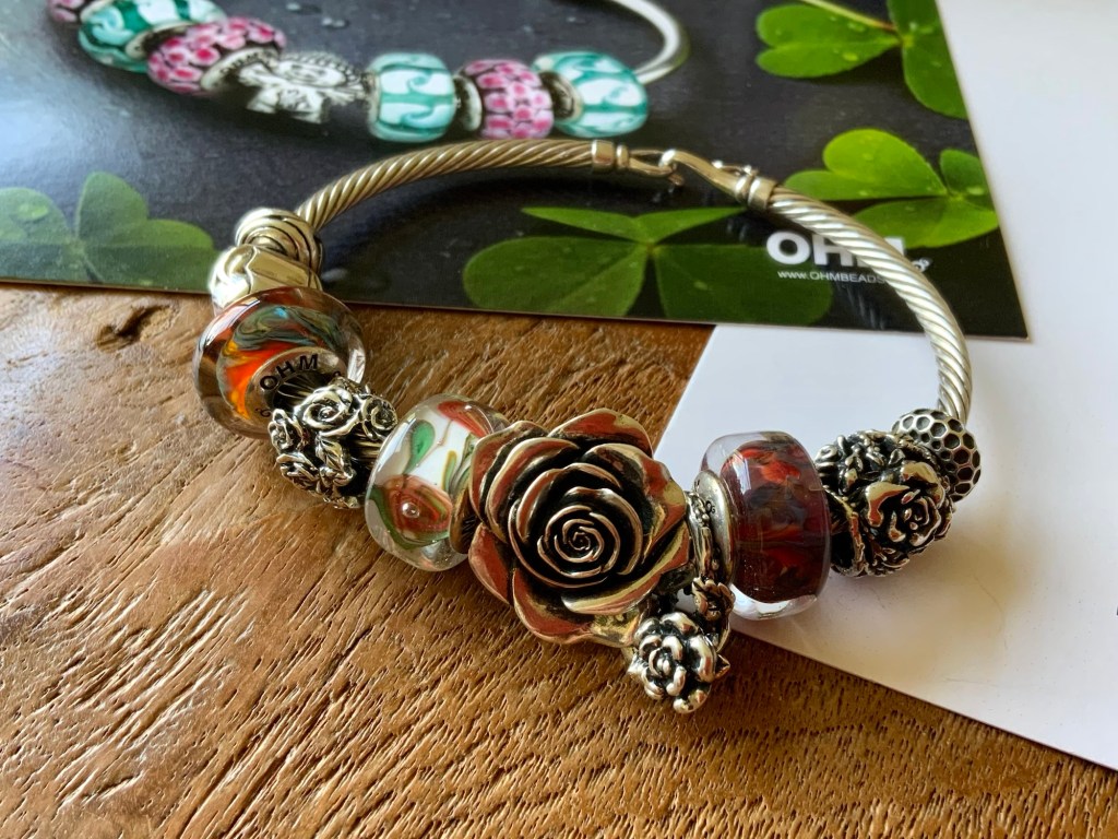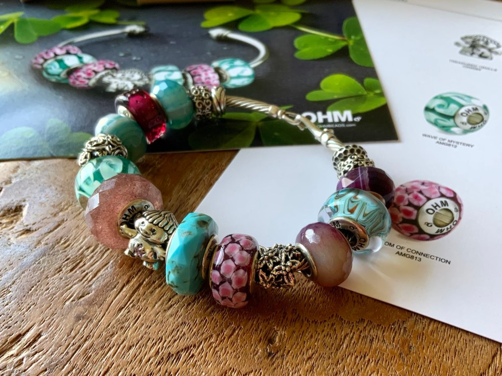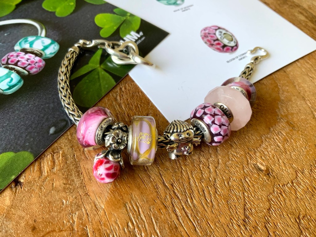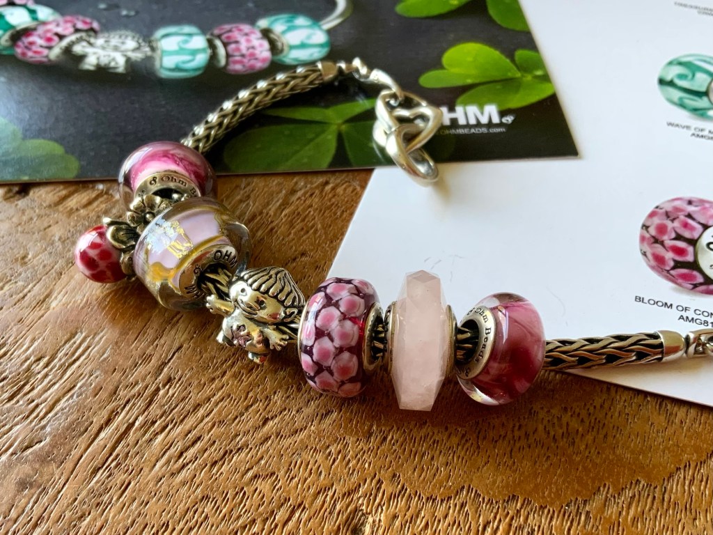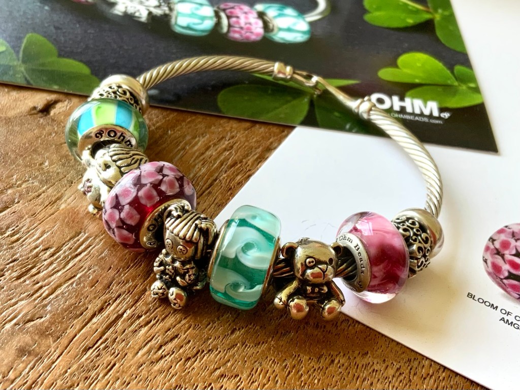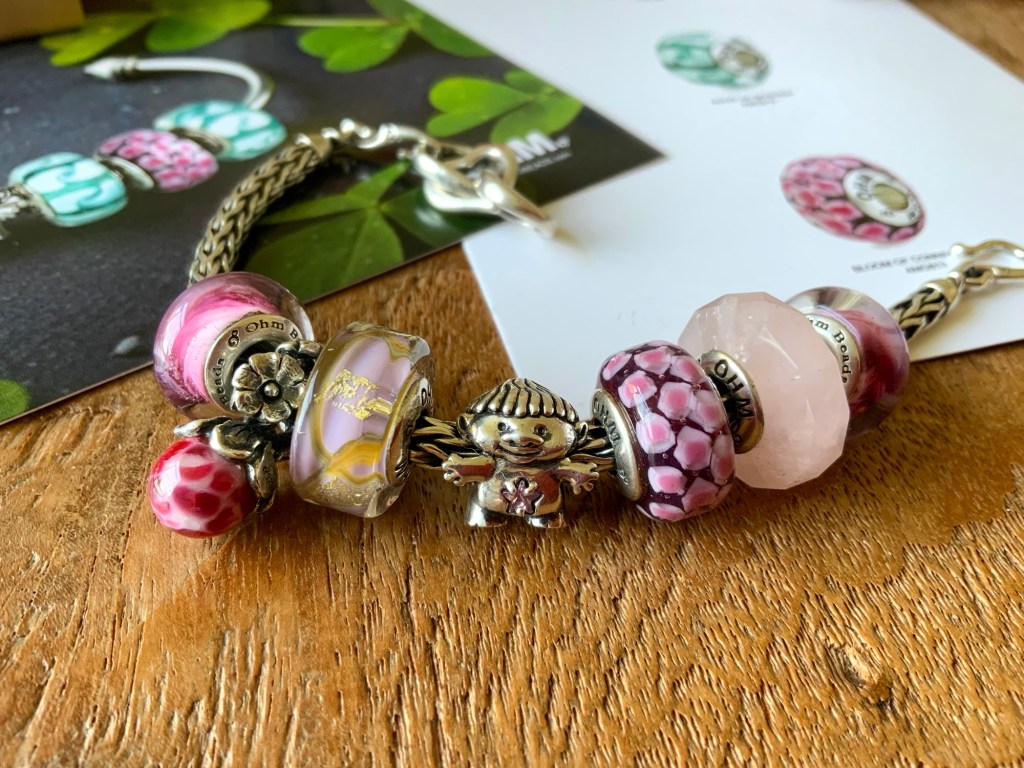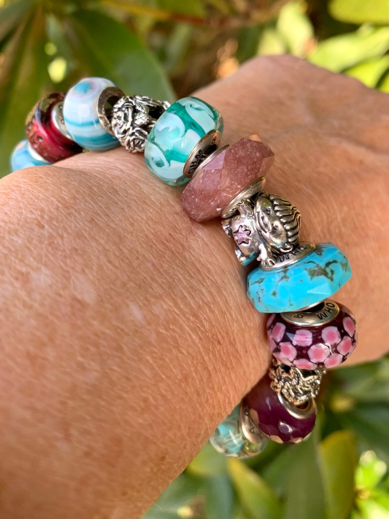 On this bangle I combined all the new beads together. With the two blue and two purple stones from the Fremont Sunday Market and Beadmail no. 49 Sentimental Spirals Duo, Pinkberry, Rose’s Embrace, Wave Of Mystery, OROQ no. 12 Joyful Jubilee, Treasured Trolls, Joyful Sky, Bloom Of Connection, Holly’s Frost and Beadmail no. 49 Sentimental Spirals Duo.