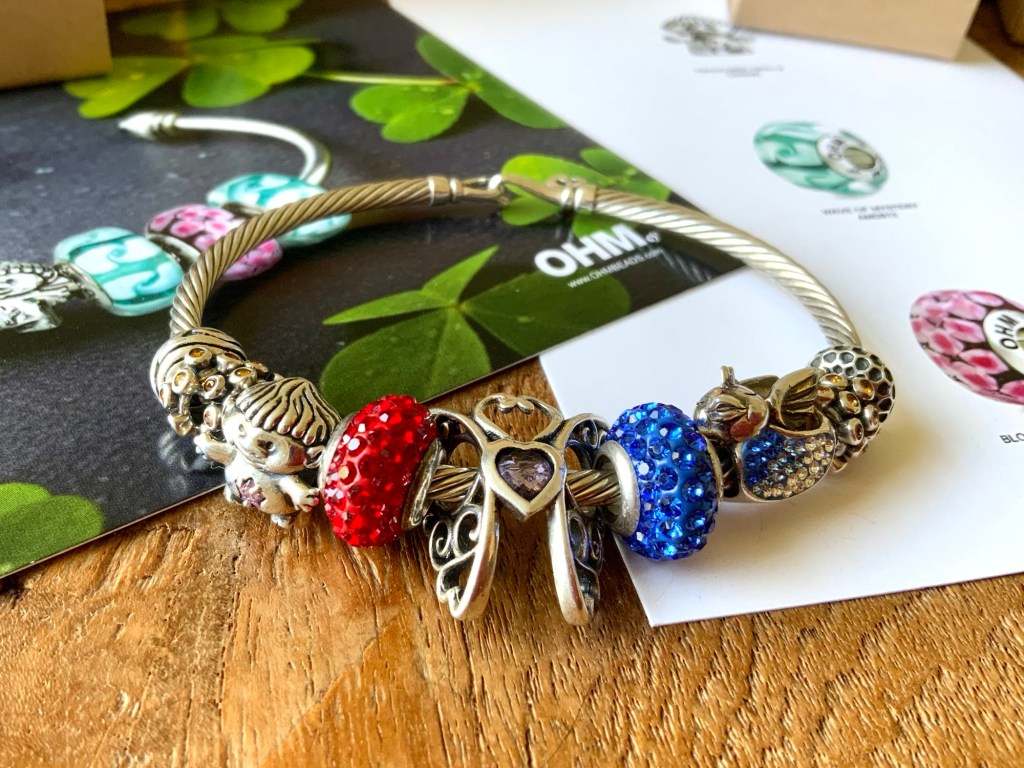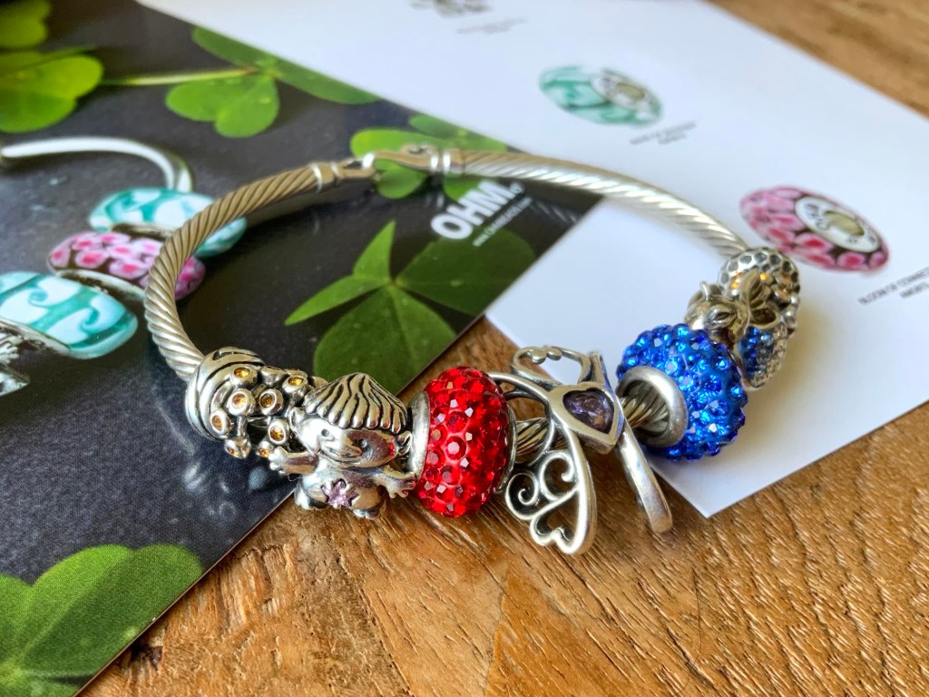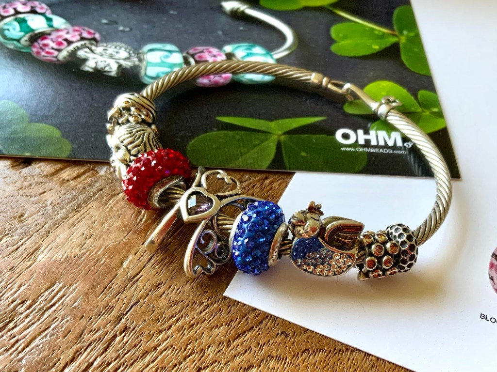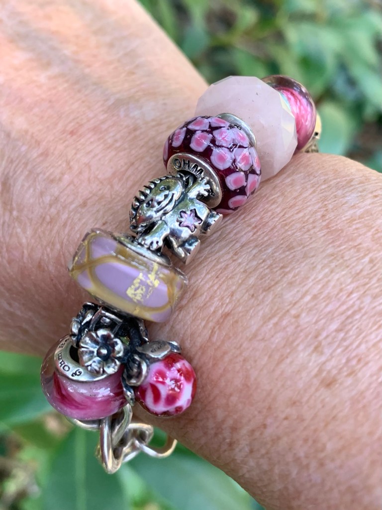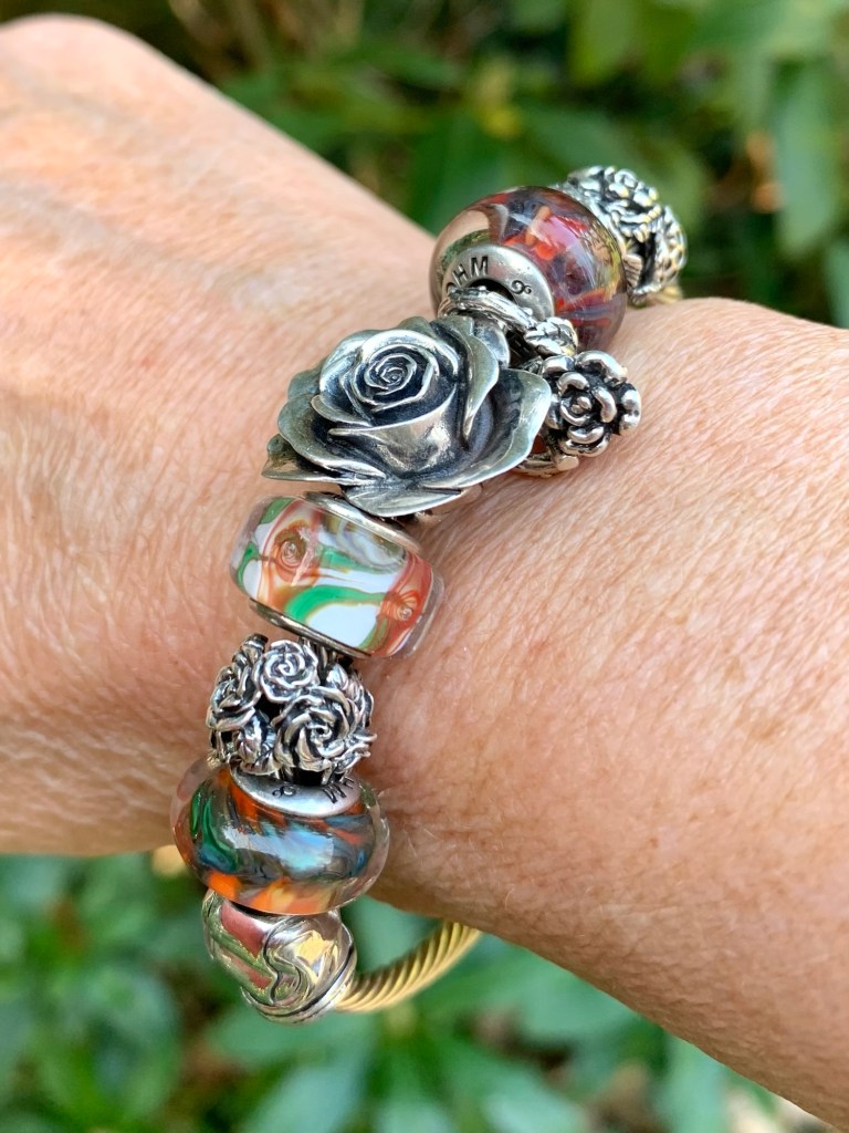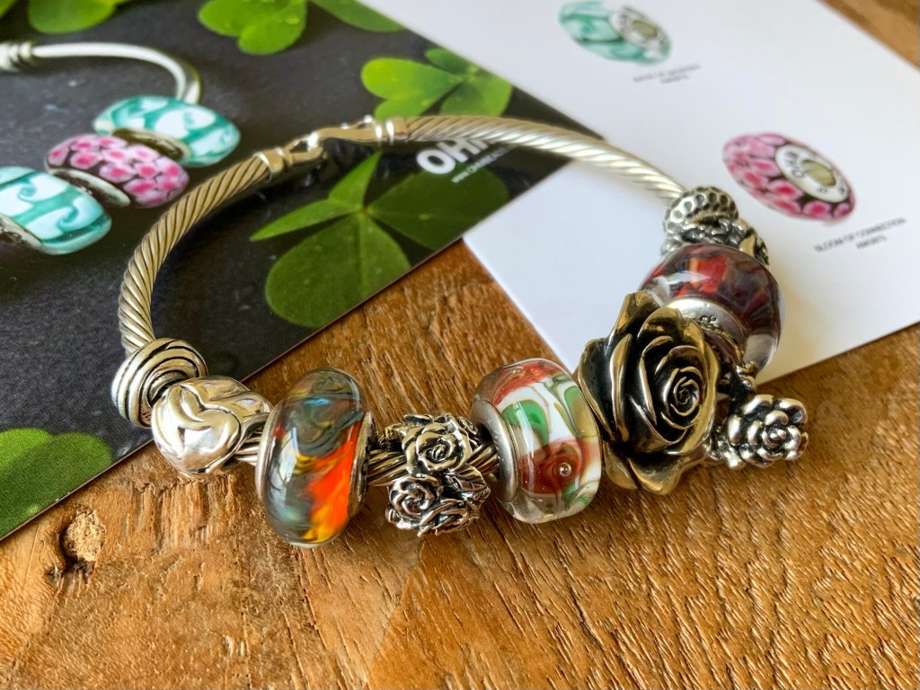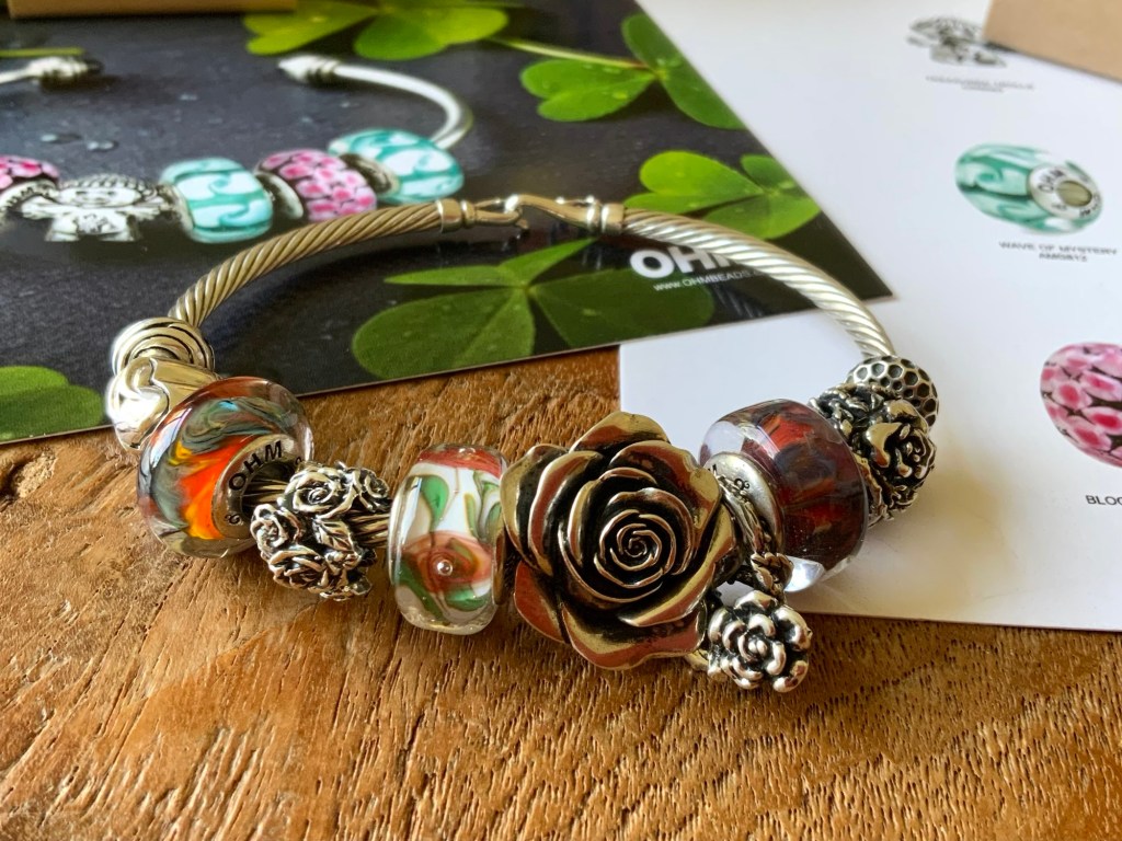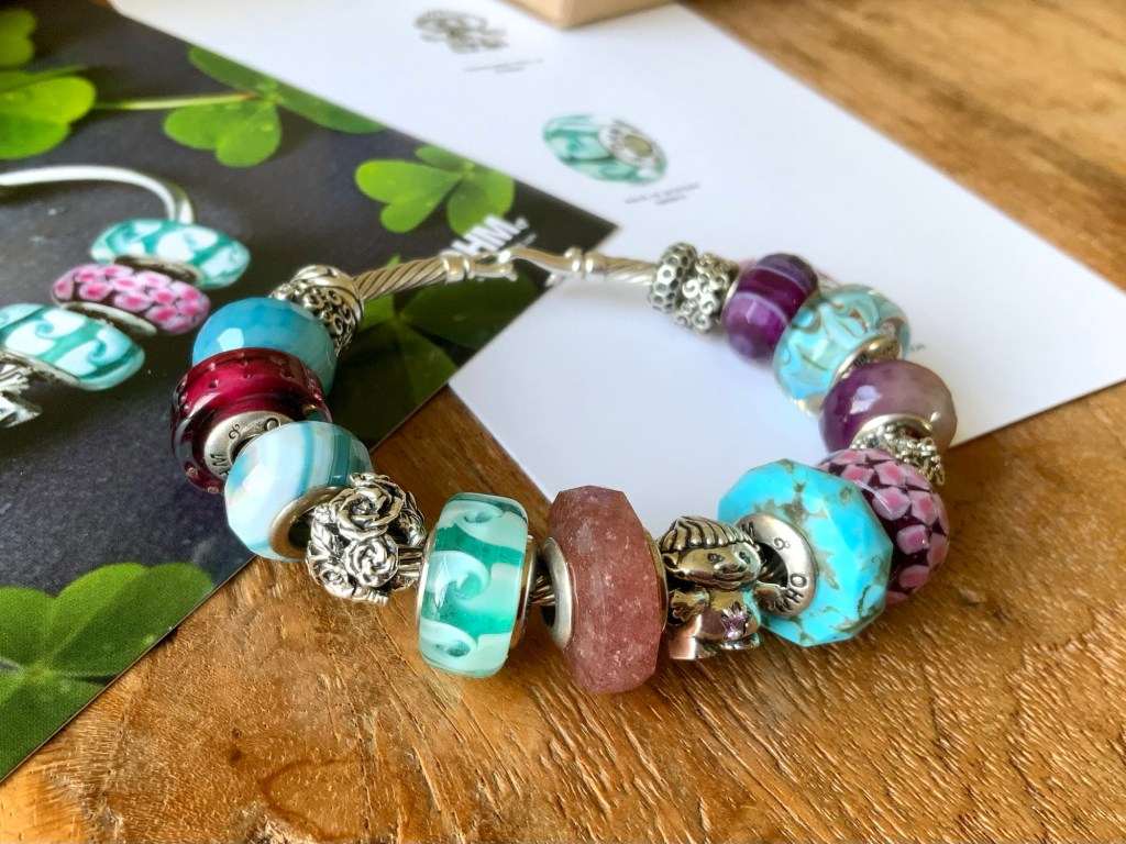 On this bangle I combined all the new beads together. With the two blue and two purple stones from the Fremont Sunday Market and Beadmail no. 49 Sentimental Spirals Duo, Pinkberry, Rose’s Embrace, Wave Of Mystery, OROQ no. 12 Joyful Jubilee, Treasured Trolls, Joyful Sky, Bloom Of Connection, Holly’s Frost and Beadmail no. 49 Sentimental Spirals Duo.